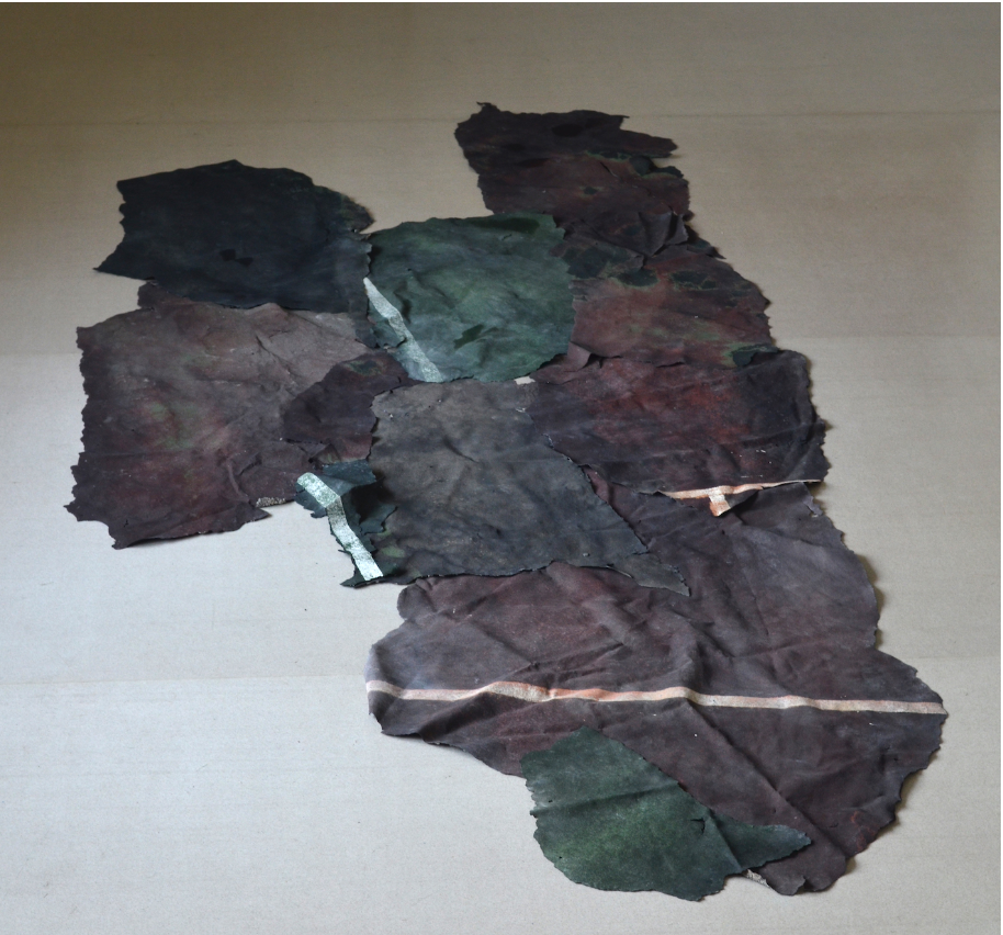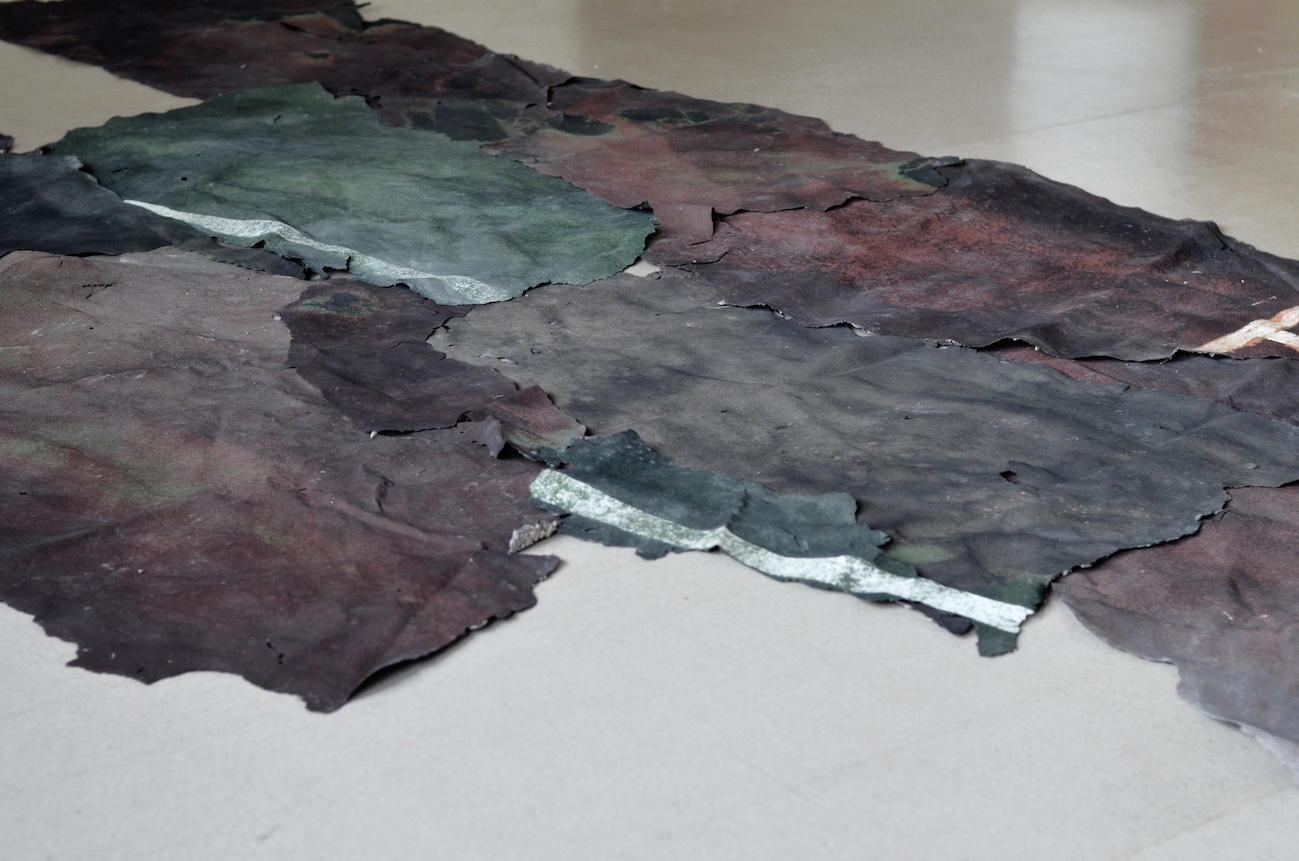 ბევრი დრო მაქვს გატარებული ჩემი სახლის სახურავზე, რომელიც, გუდრონით არის გადახურული. სწორედ მანდ გამიჩნდა პირველი იმპულსი ამ მასალის მიმართ. მომეწონა მისი სირბილე და აღვიქვი როგორც შენობაზე გადაფარებული ქსოვილი. გუდრონი ძალიან მრავალფეროვანი მასალაა, თან ჰგავს მყარ კრისტალს, ქვას, რომელზეც თითქოს მძიმე ხელსაწყოებით უნდა იმუშაო, თან დნება და ხდება სითხე. თავად სახურავი კი თავშესაფრის, დაცულობის სიმბოლოს წარმოადგენს ჩემთვის და უცნაური შეგრძნება მქონდა, როდესაც “სახურავი” (ანუ გუდრონი), რომელიც ასეთი “გარანტიების” მეტაფორაა, ჩემ თვალწინ დნებოდა და ხდებოდა თხელი მასა. ამ ნამუშევრიდან გამომდინარე სულ მეფიქრება, რომ უკვე კარგად გამყარებული იდეები ყოველთვის შესაძლებელია გადავიაზრო. ხანდახან ნამუშევრებს ტექსტებს ვუწერ ხოლმე, ისევ იმისთვის, რომ კარგად გავიაზრო რას ვაკეთებ. ამ ინსტალაციის ტექტის ერთ-ერთი ფრაზაა – “არასოდეს ვუმადლოდი ჩემს სახურავს, რომ მაცხოვრა აბსურდში, მაგრამ კარგად მაცხოვრა”.