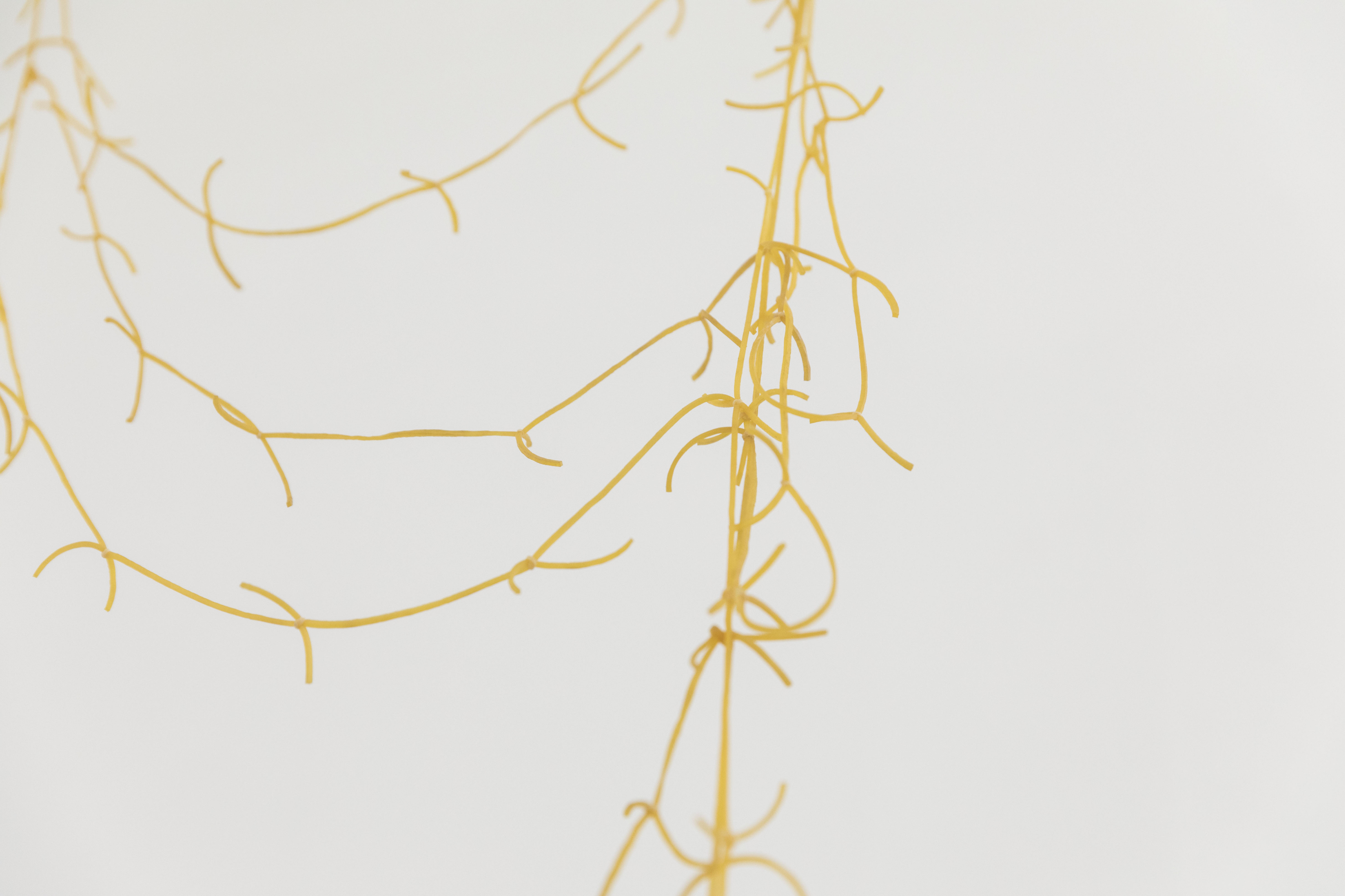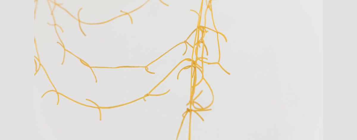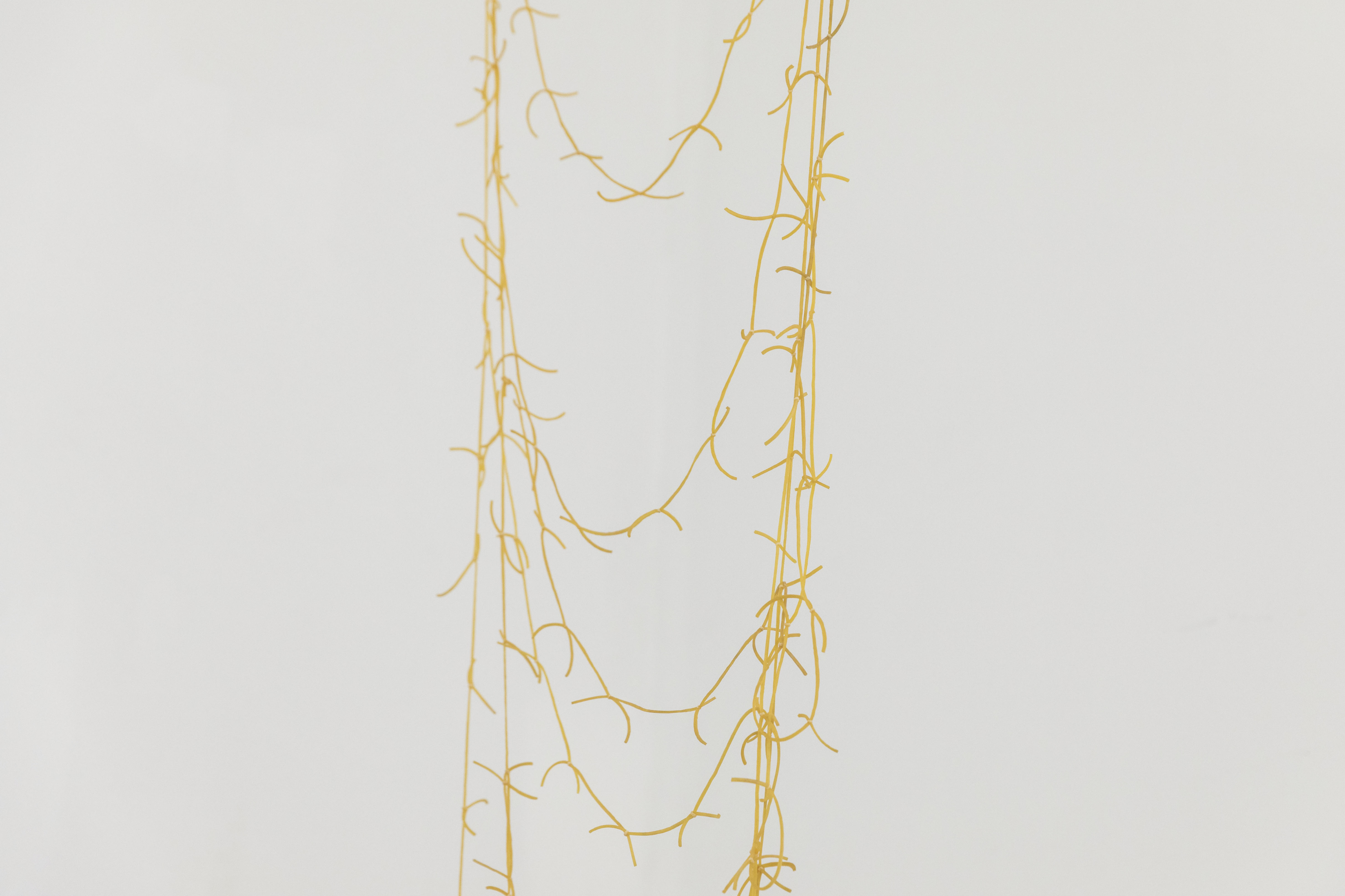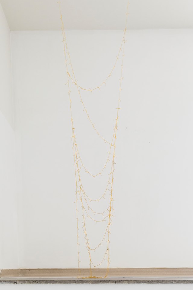 ეს ნამუშევარი ძალიან სპონტანურად გავაკეთე, რომ ვუყურებ, მეღიმება. გამოყენებულ რეზინებს, ალბათ ყველა შევხვედრივართ, ძირითადად უფერული “შესაკრავის” ფუნქციით. ამ დროს თითქოს ყველას გამოგვრჩა მისი ფერი, გამჭვირვალობა და ის წელვადობა, რომელიც მას რაღაც დამახასიათებელ ველურ ბუნებას სძენს. როდესაც ვყიდულობდი, გამყიდველმა დამიკონკრეტა, ფულის რეზინები გინდაო? ამ სახელზე ახლაც მეცინება იმის კონტრასტში, თუ როგორ აღვიქვამ თავად ნამუშევარს. ნამუშევარი მიქმნის ისეთი აბსტრაქტულობის შეგრძნებას, სადაც არ არის მორალი, არ არის მნიშვნელობები კარგის, ცუდის, ასევე არ არის მიმართულებები, მარჯვენა, მარცხენა, არ არის საგნობრიობა და ა.შ. ასეთ “სივრცეში” კი მგონია, რომ ბოლომდე მიღებული ვარ და ჩემ თავს ვეუბნები: You are fully accepted here.