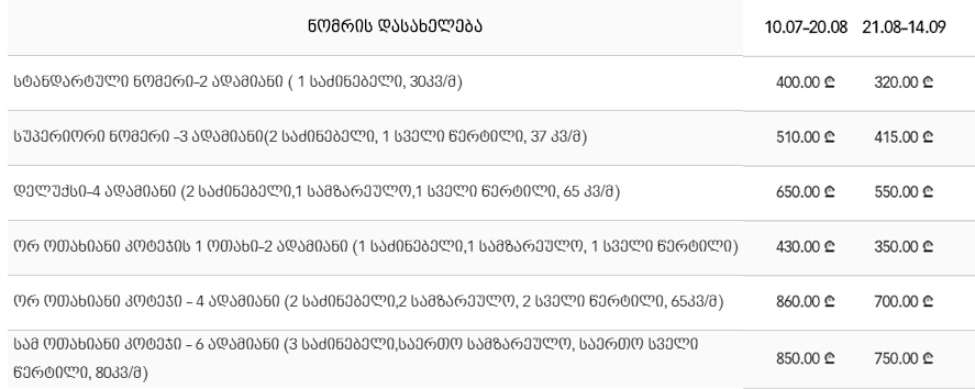 ფასები განსხვავდება ნომრის ტიპისა და დროის მიხედვით, თუმცა ღირებულება სამჯერად კვებას მოიცავს. ამასთან, გაითვალისწინეთ, რომ ექვს წლამდე ბავშვებისთვის დასვენება უფასოა.