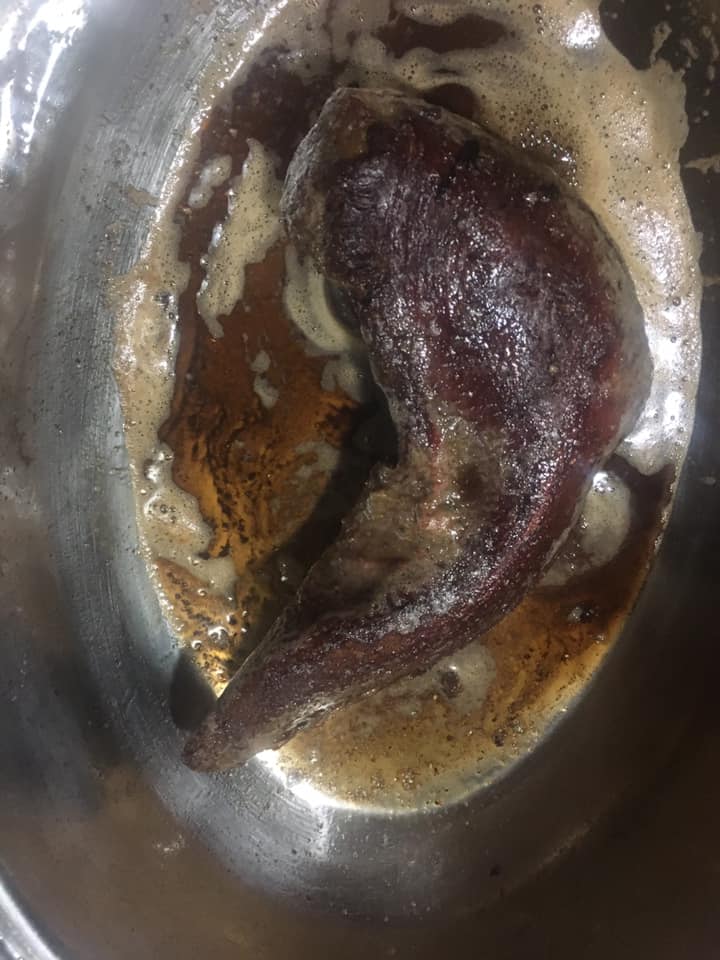 საქონლის ენა იხარშებოდა დაახლოებით 2.5 საათი, როდესაც ცოტა შეგრილდა, გავაცალე კანი, ჩავდე სქელძირიან ქვაბში და კარგად დავბრაწე ბევრ კარაქში ყველა მხრიდან.
