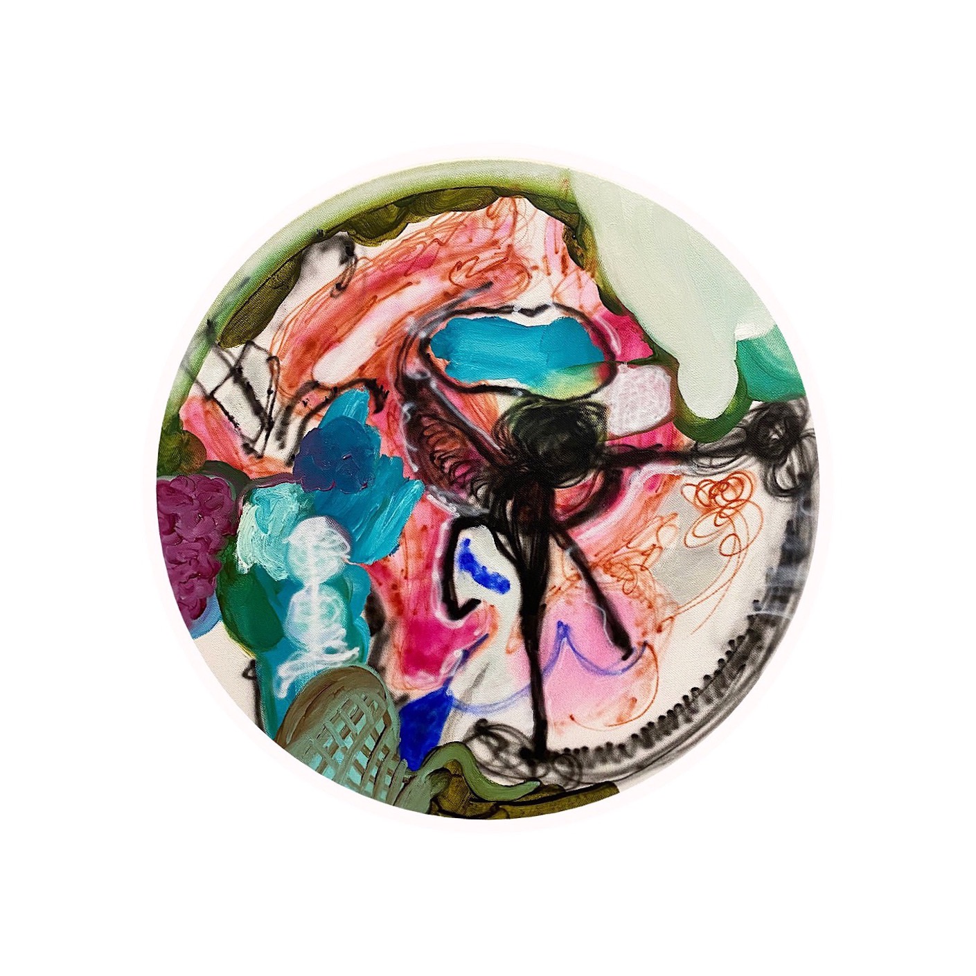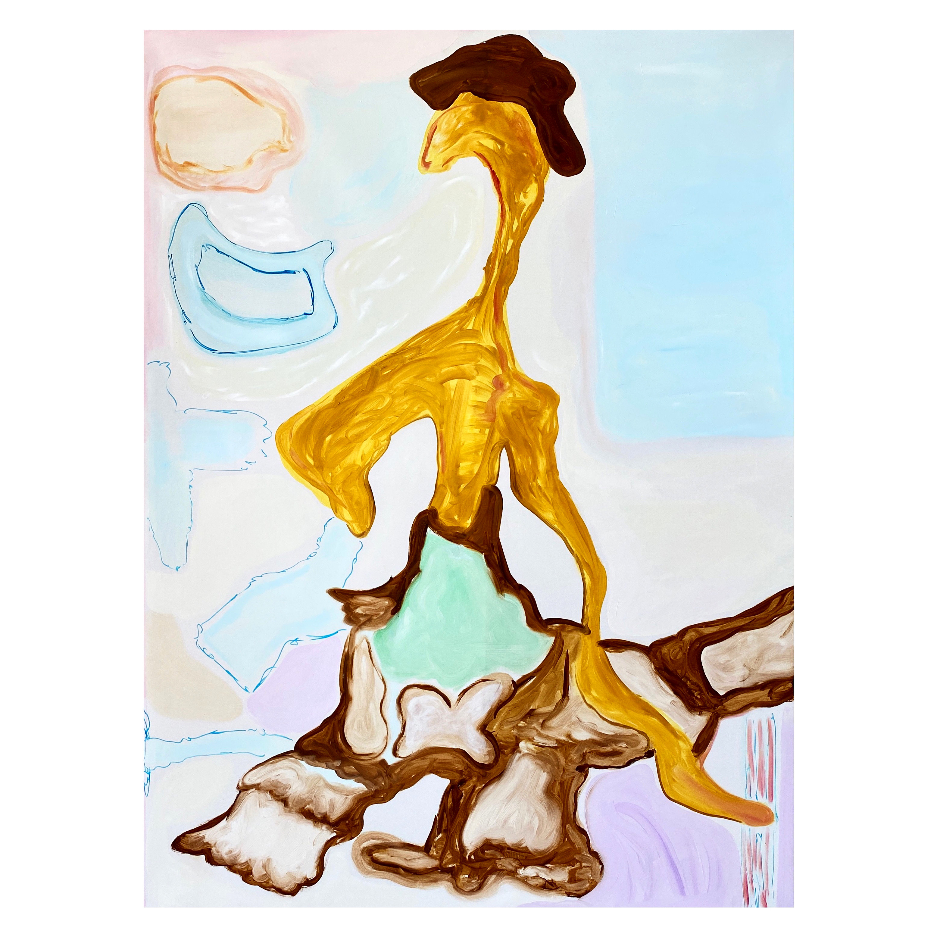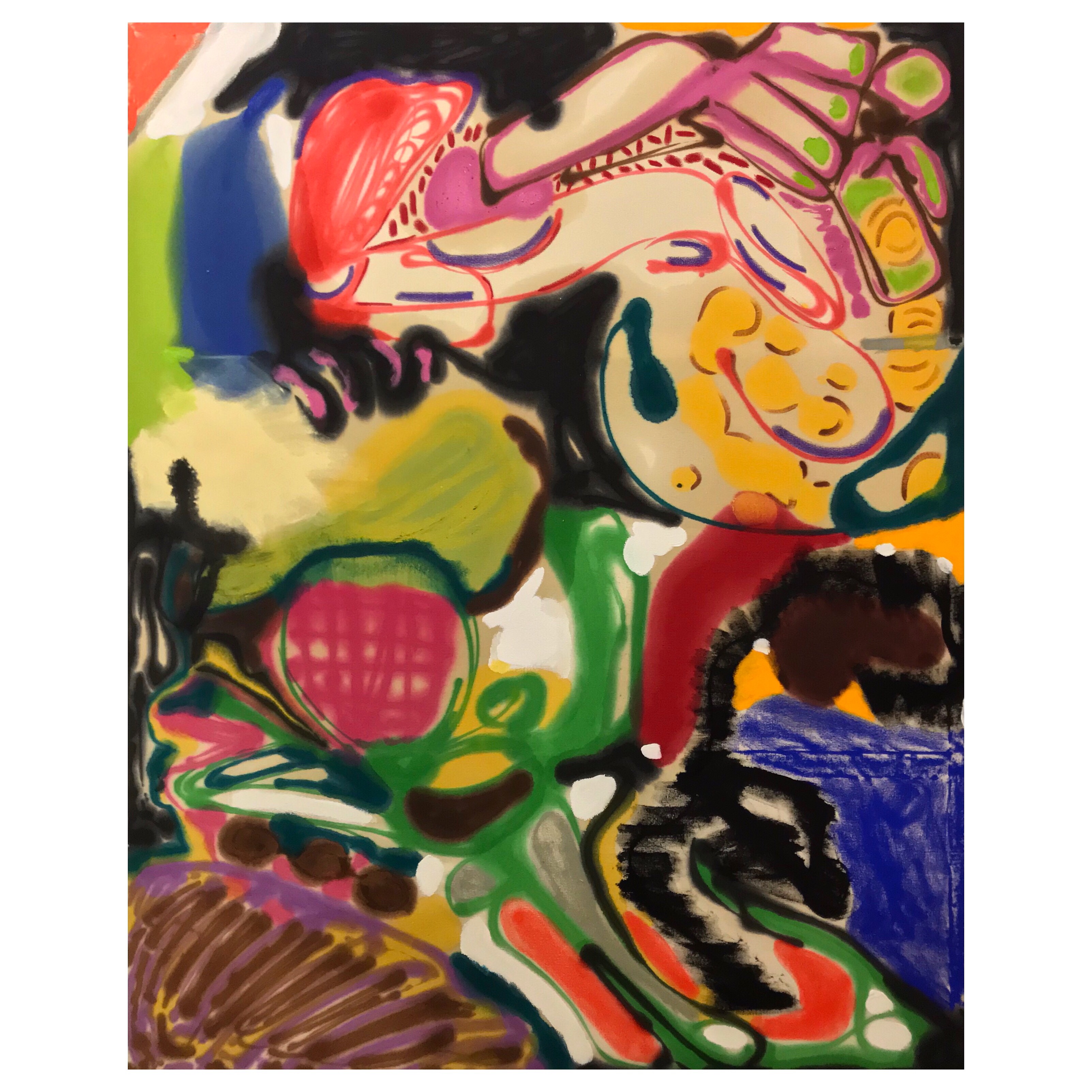 მეორე ოთახში წარმოდგენილი ტილოები რაციონალურის და ირაციონალურის ნარევია. აქ ხატვის დროს უმეტეს შემთხვევაში ფერებსაც წინასწარ ვამზადებდი და მუშაობის პროცესიც დღეებზე იწელებოდა, კომპოზიციასაც ხშირად ვამოწმებდი საით მიდიოდა და როგორ ვითარდებოდა…ეს არ ნიშნავს იმას რომ ყველაფერი გათვლილი იყო, სპონტანურობა და დაკარგულობა პროცესს სულ თან უნდა ახლდეს, სხვა შემთხვევაში “კეთებას” იწყებ, რომელსაც მკვდარ, მშრალ, ეროს გამოცლილ შედეგამდე მიყავხარ, ბოლო პერიოდში პროცესუალური რეფლექსია ამიმაღლდა სადაც რაციო და ქვეცნობიერი თანამშრომლობას ცდილობენ.