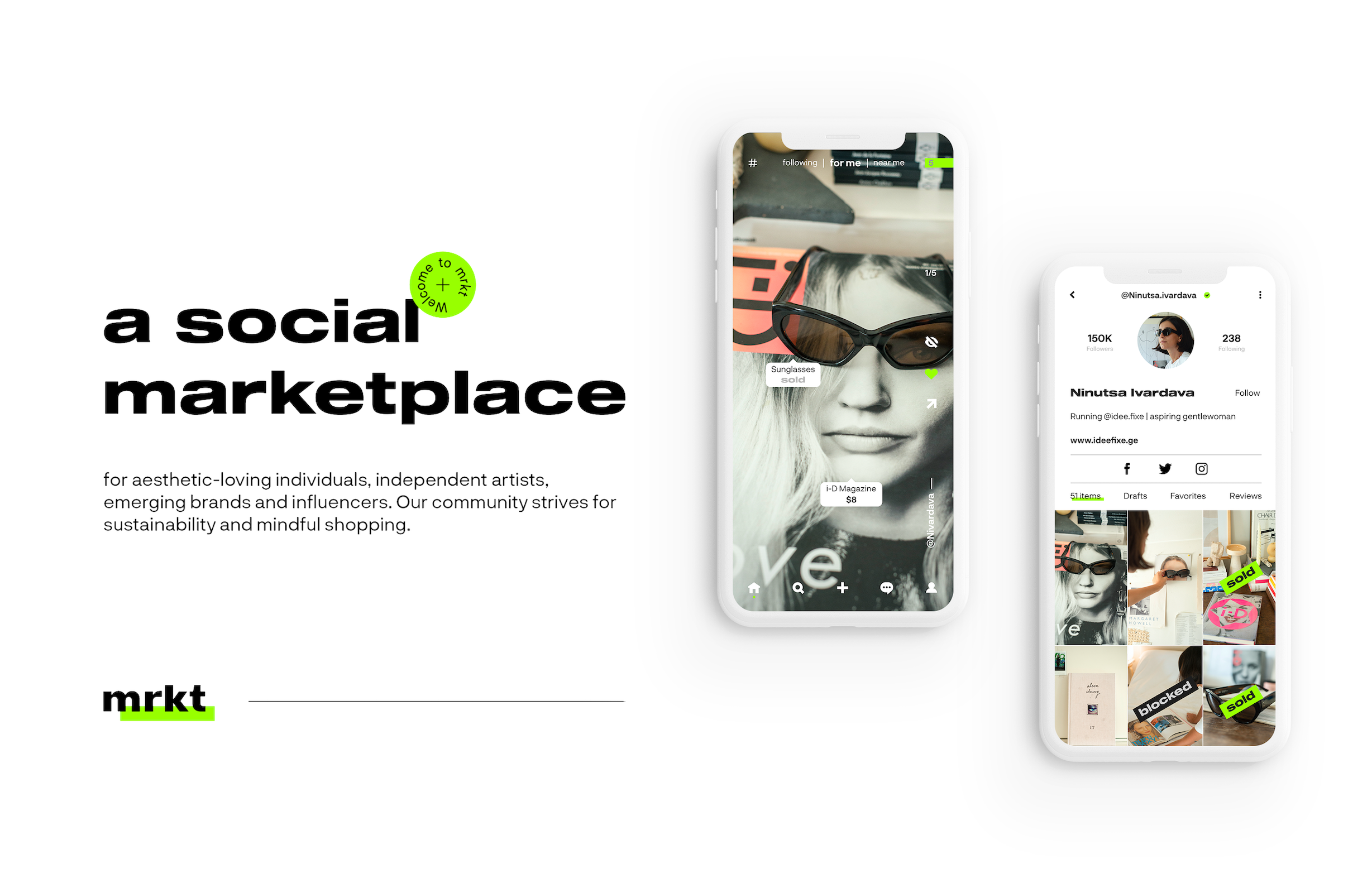 პლატფორმაზე განსაკუთრებული ნივთები და მათი მფლობელები იყრიან თავს. mrkt-ზე უკვე შეხვდებით არტისტებს, ბრენდებს, მაღაზიებს და ინდივიდებს, ვისთვისაც ესთეტიკას და პროდუქტის წარმოჩენის ფორმას დიდი მნიშვნელობა აქვს.