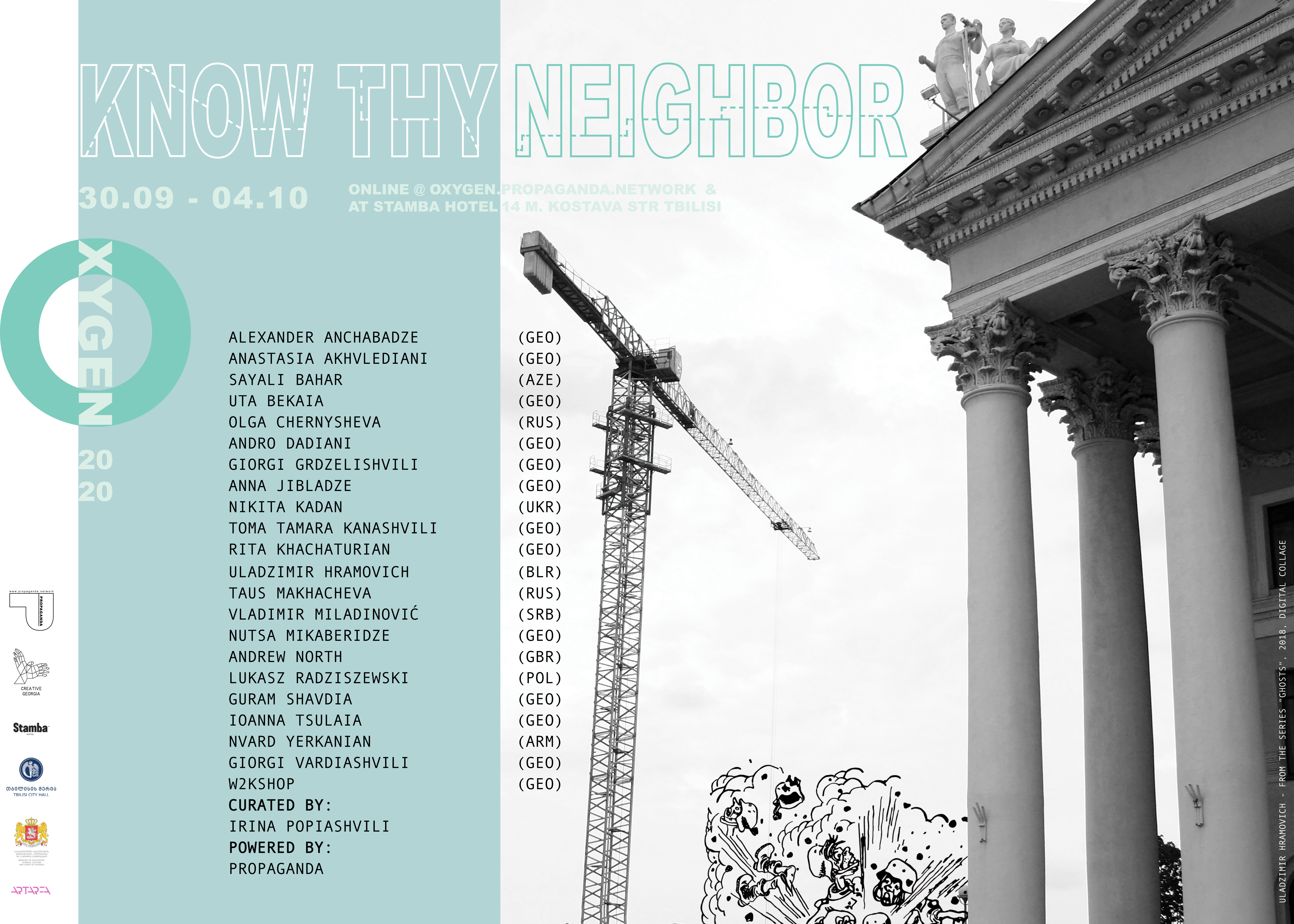 წლევანდელი თემა გლობალური პანდემიის შეზღუდვებში და ნიღბებს იქით, ჟანგბადის ნაკლებობაში დაიბადა. 2020 წლის Oxygen-ი, რომლის კურატორიც ირინა პოპიაშვილია, გაიხსნება სათაურით: „იცნობდე შენს მეზობელს.“ვიდეო: "სევდა" – გიორგი გრძელიშვილი, მოუშენ-გრაფიკაReborn in the heart of the global pandemic lockdown and limited oxygen behind the face masks, 2020’s edition opens with the title “Know Thy Neighbor” under curation of Irena Popiashvili. Video: "Sorrow" by Giorgi Grdzelishvili, Motion Graphics