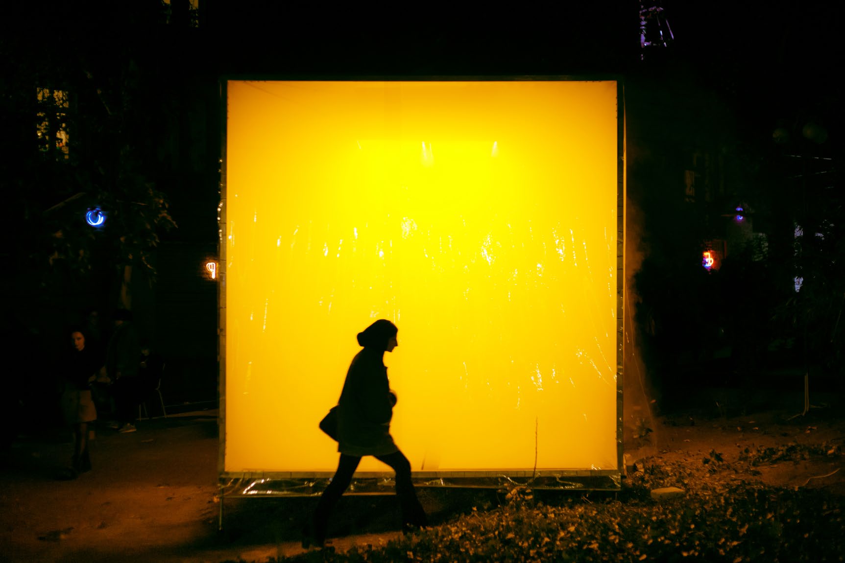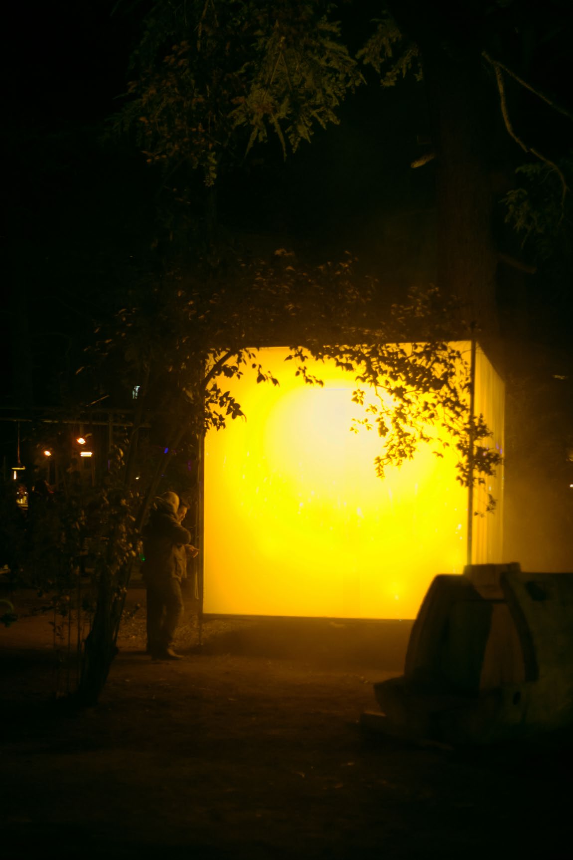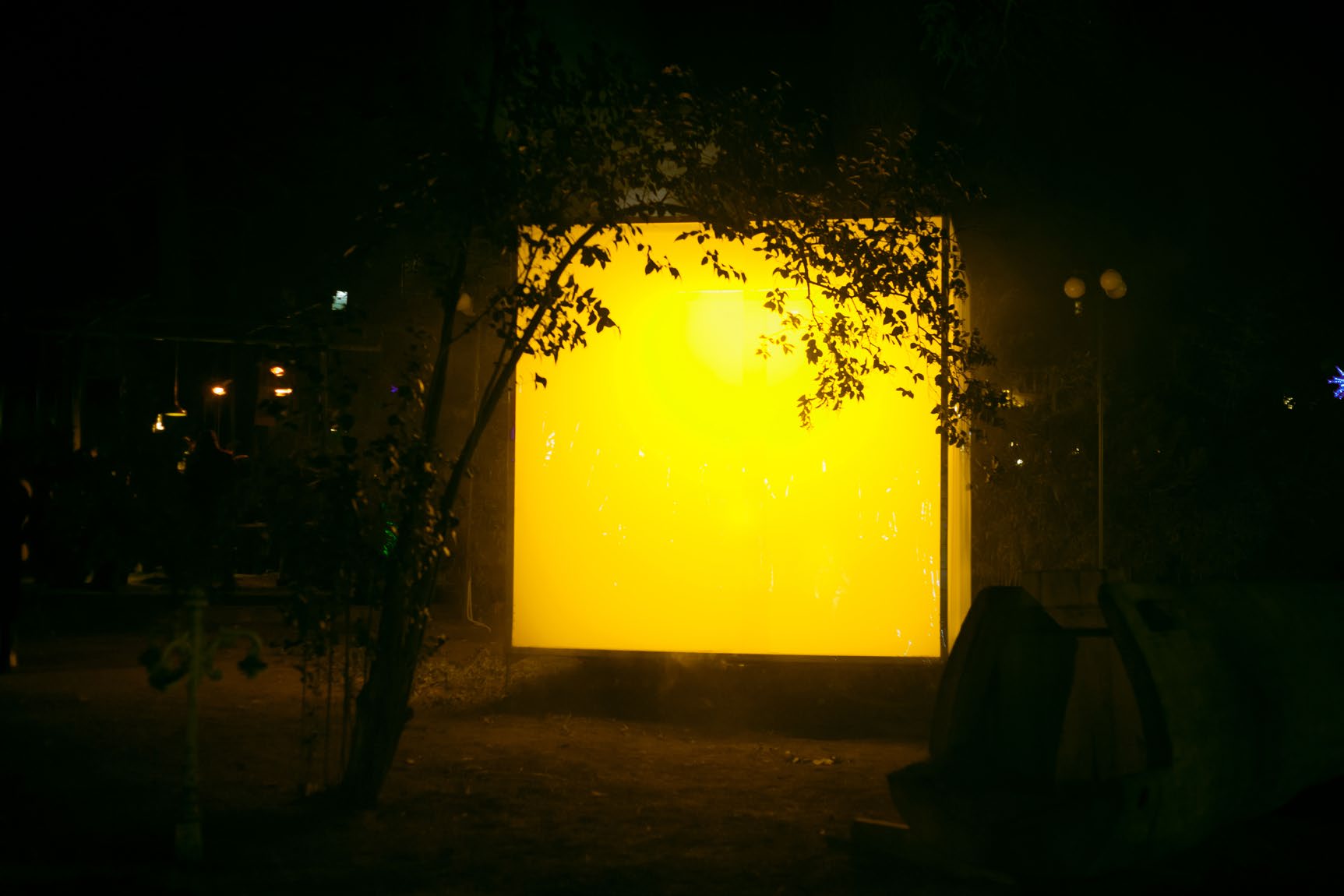 Light Cube (2019) Art project Glass Cube organized by Dedicace Gallery (Tbilisi, Georgia) Material : LED panels, fog machine, metal construction, transparent film. Size: 300cm x 300cm x 300cm.
