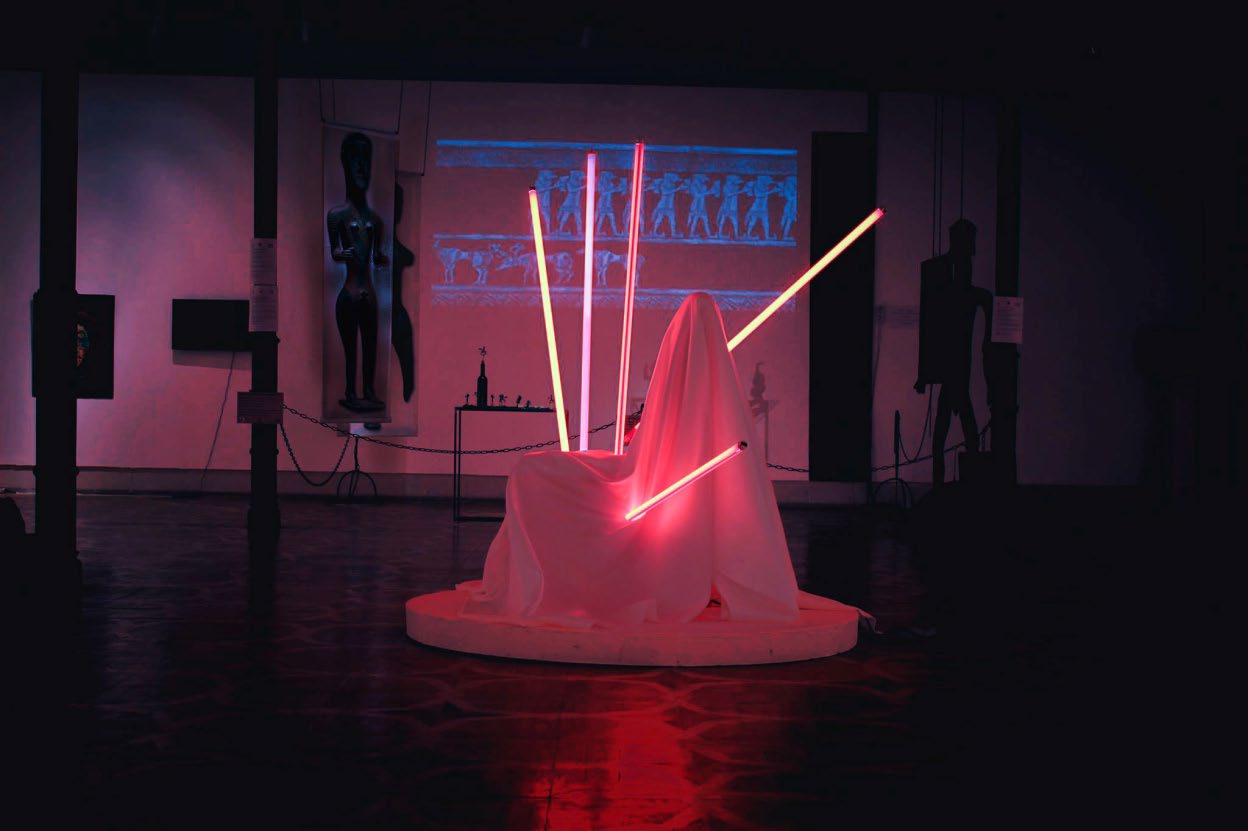 STUDY AFTER BACON’S STUDY AFTER VELAZQUEZ’S PORTRAIT OF POPE INNOCENT X (2017) Material: Chair, satin, LED tubes
