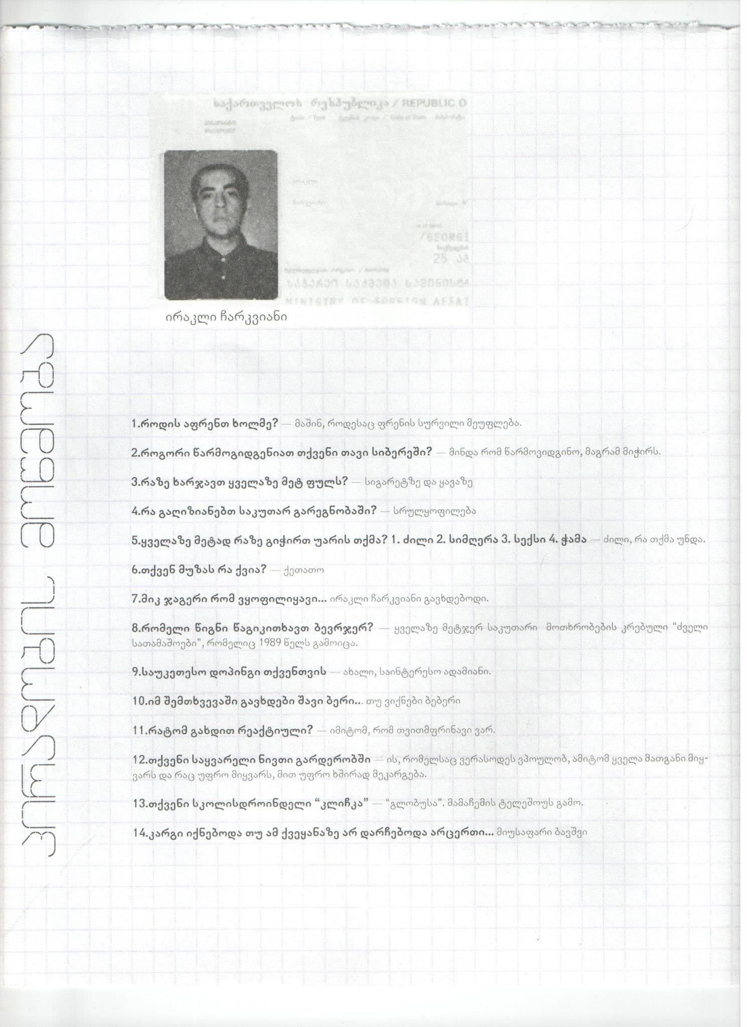 გთავაზობთ 2005 წელს ფოტოგრაფ გიკა ჭელიძის გადაღებულ ირაკლი ჩარკვიანის ფოტოსერიას ჟურნალ “ანაბეჭდისთვის” და ასევე ბლიც-ინტერვიუს რუბრიკისთვის “ID” (Artarea, “ანაბეჭდი”).