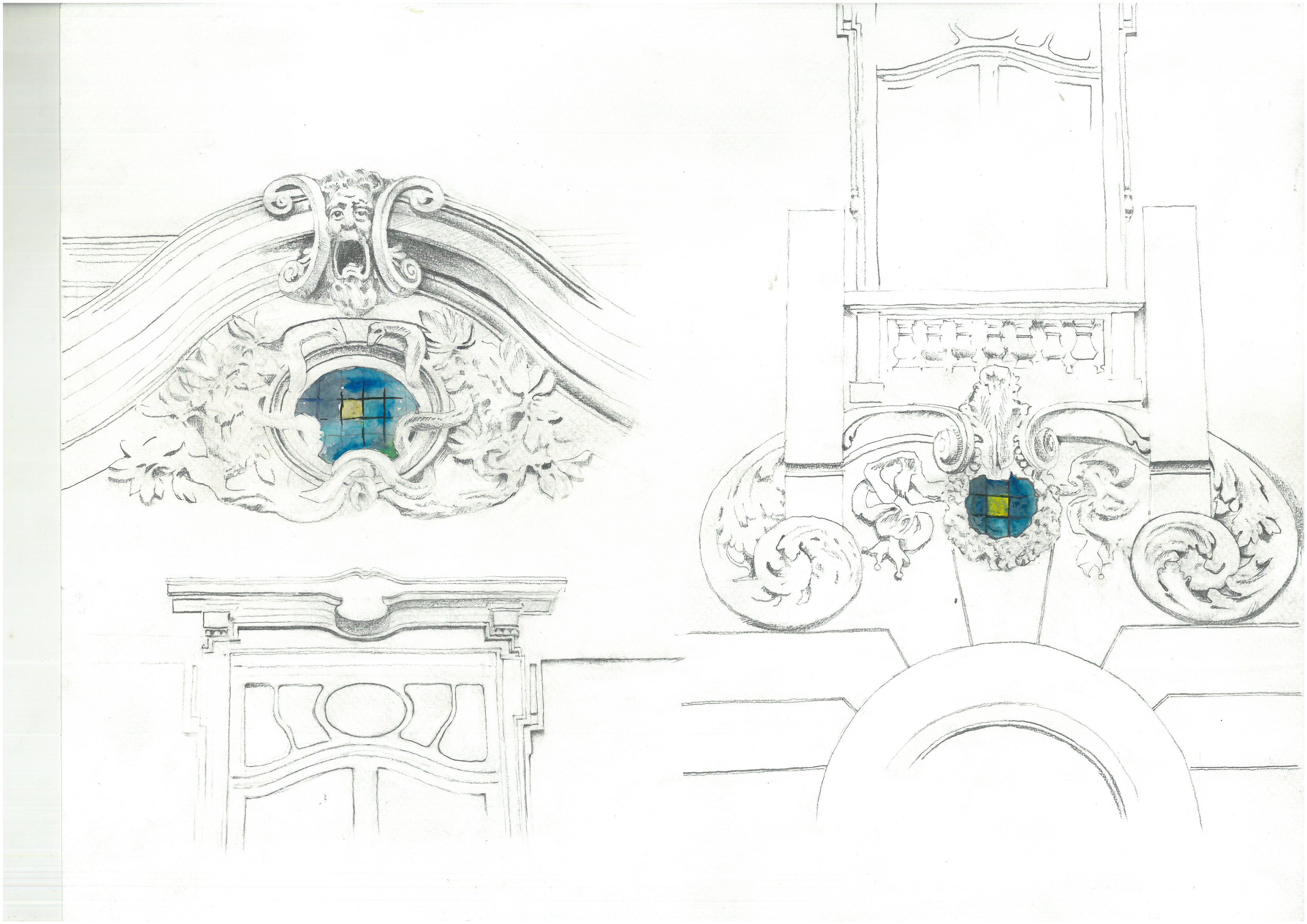 ფასადზე დღემდეა შემორჩენილი ფერადოვანი ვიტრაჟი, ვიტრაჟის მცირე აკომპანემენტები ჩართულია ფასადის გვერდით ნაწილებშიც, ის ჩუქურთმებს შორის ფრთხილად არის მოთავსებული. თავად ნაძერწი ორნამენტები უკიდურესად დელიკატურად არის გამოყვანილი ცრუ აივნებსა და თაღებს შორის. შესაბამისად, შენობაში ძლიერია მხატვრულ-დეკორატიული ელემენტები. შენობის ფანჯრები, არტ-ნუვოსთვის დამახასიათებელი სისადავით და დენადი ესთეტიკური ფორმებით გამოირჩევიან.