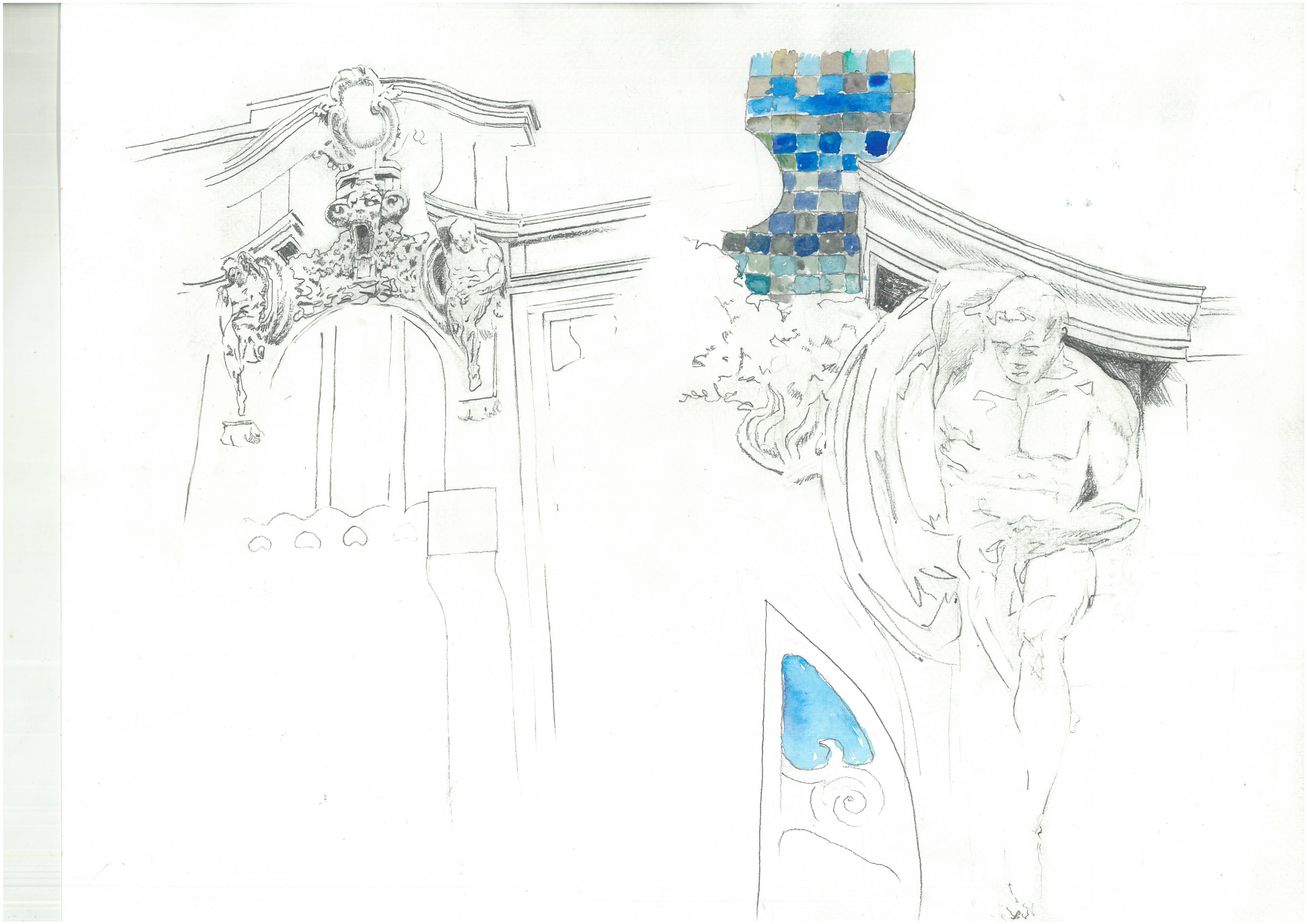 ეს ჟესტი, რომელიც ოჰანჯანოვის არქიტექტურაში ხშირია, ზოგჯერ უბრალოდ სტილიზაციით იფარგლება, თუმცა მაინც თავისებურად გამოთქვამს სურვილს სინთეზის გაღრმავებაზე. ფასადის ცენტრალურ ნაწილზე გამოყვანილია პლუტონის და მერკურის ქანდაკებები, ეს ნაწილი ყველაზე კომპლექსური და დრამატულია. აქ წარმოჩენილია ბურჟუაზიული არქიტექტურისთვის დამახასიათებელი მისტიკური ელემენტებიც, რომელსაც აგვირგვინებს მასკარონი.