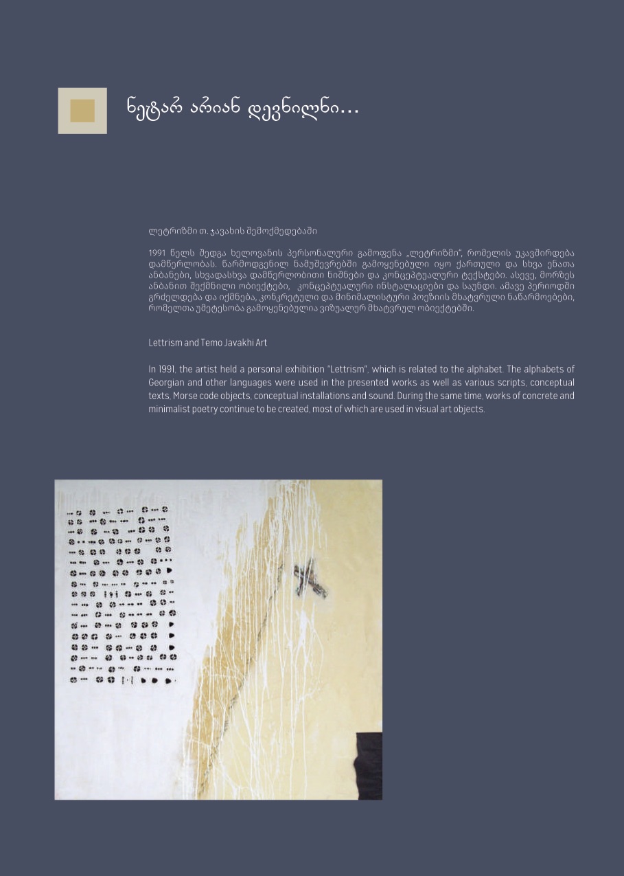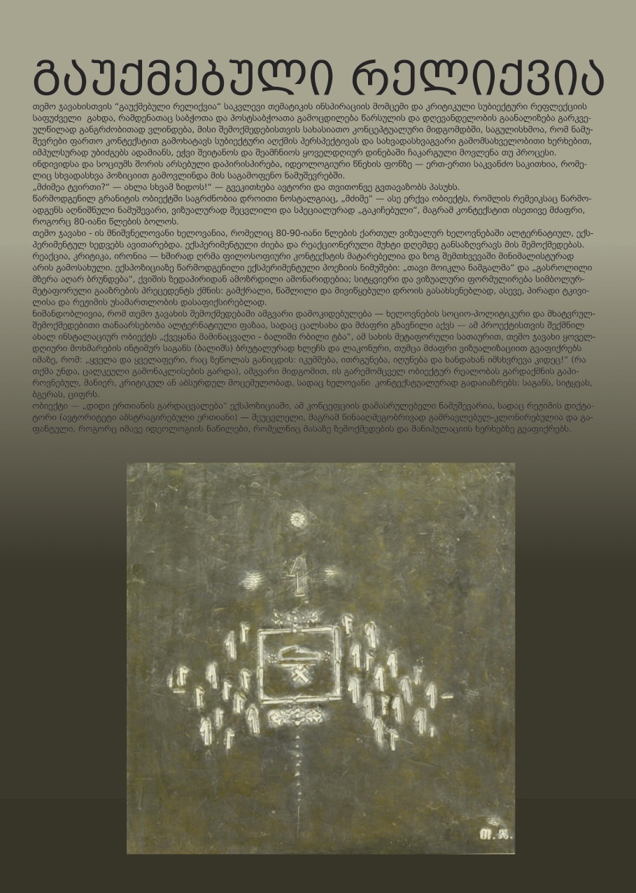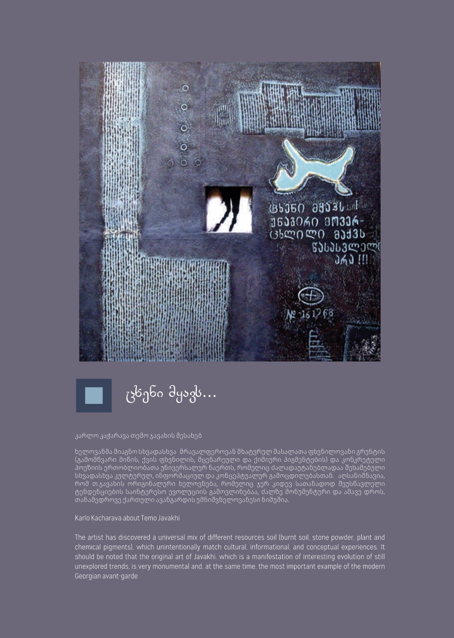„ხელოვანი რეალიზდება საკუთარი მსოფლმხედველობის, პრინციპების, წარმოსახვის, ორიგინალური ხედვისა და შესატყვისი მხატვრული ენის მოძიების საშუალებით, რომელიც ამ ფასეულობებთანაა შეთავსებული და წილნაყარი“. – აღნიშნავს ხელოვანი თემო ჯავახი.