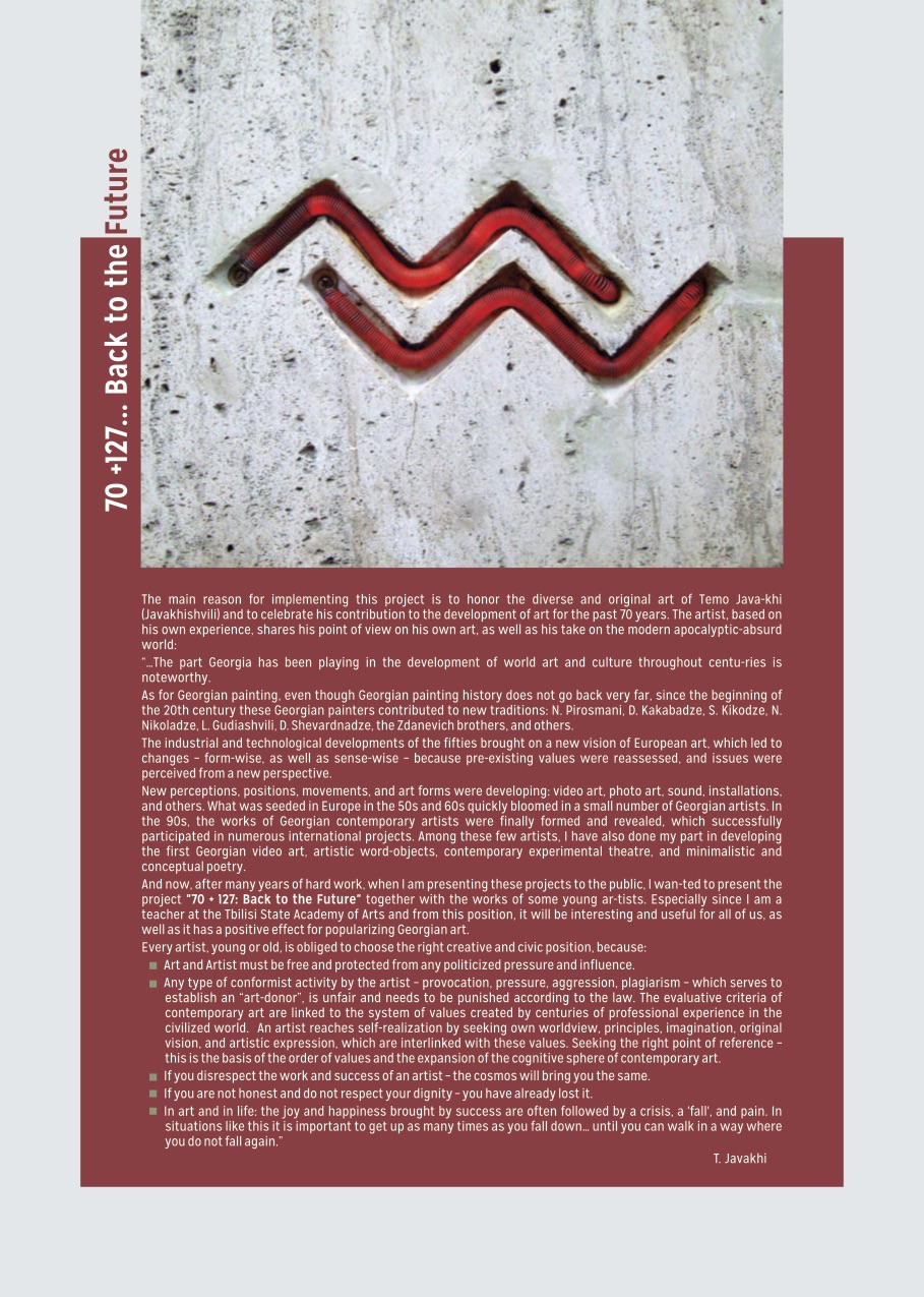 გამოფენა „70+127… უკან, მომავლისკენ“ ქართველი თანამედროვე ხელოვანის, თემო ჯავახის 70 წლის იუბილეს ეძღვნება. გამოფენის კონცეფცია თემო ჯავახის სუბიექტური ხედვის საფუძველზე თაობათა შორის დიალოგის ექსპერიმენტულ მცდელობას აერთიანებს.