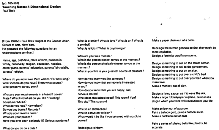 სემესტრის განმავლობაში პირველი და მეორე კურსის ხატვის სტუდიის სტუდენტების ამოცანა იყო ამერიკელი ხელოვანის, პოლ ტეკის ტექსტში – „სასწავლო ჩანაწერები: „ოთხგანზომილებიანი დიზაინი“ – დასმულ საკითხებზე თავიანთი ნამუშევრებით პასუხის გაცემა. პოლ ტეკმა ეს მრავალშრიანი კითხვარი კუპერ იუნიონის სახელოვნებო სკოლაში სწავლებისას შეადგინა. „სასწავლო ჩანაწერები“ ქმნის საერთო სივრცეს სტუდენტებს შორის, რადგანაც ისინი ერთმანეთს უზიარებენ თავიანთ პასუხებს ყველა ტიპის წარმოდგენილ კითხვაზე.