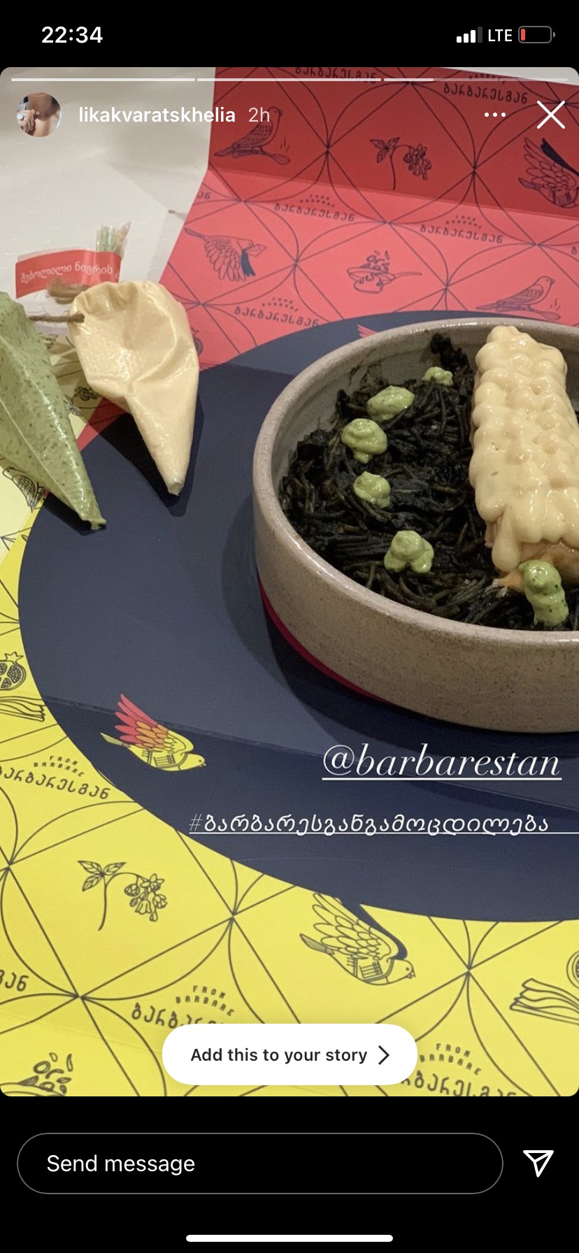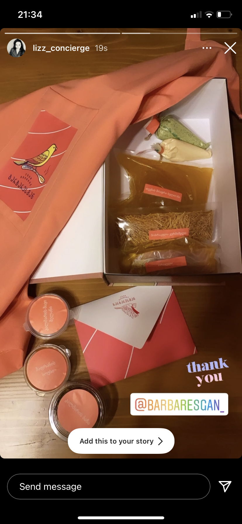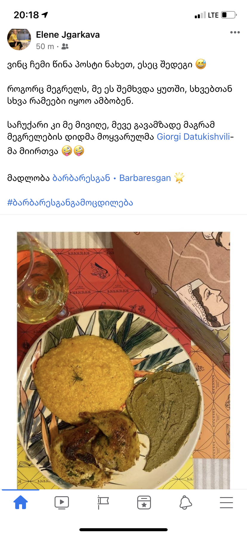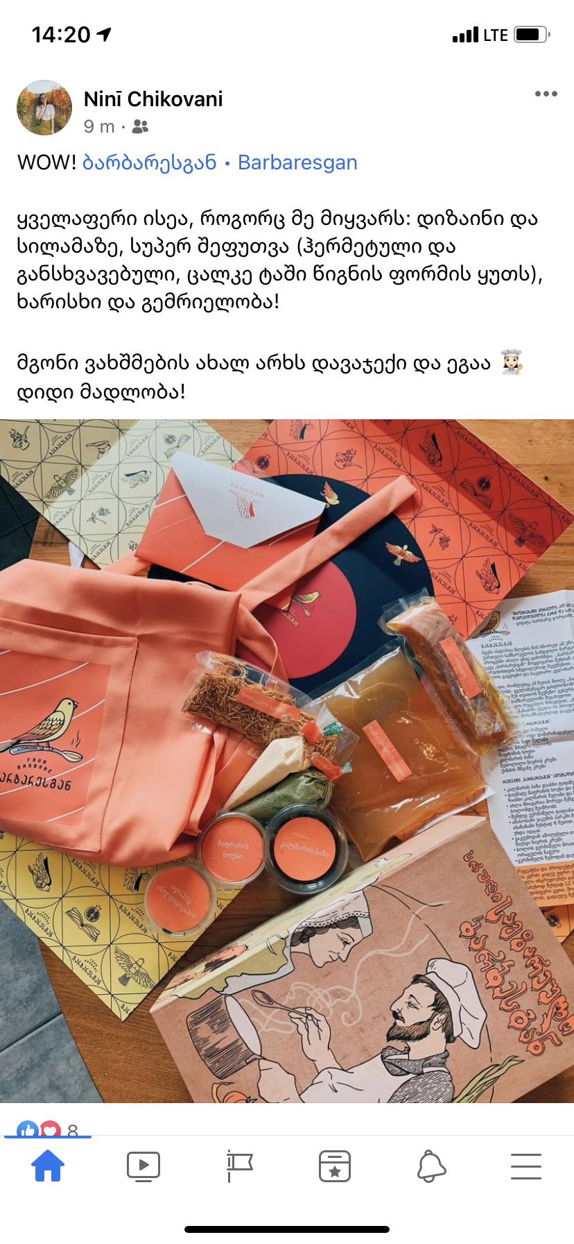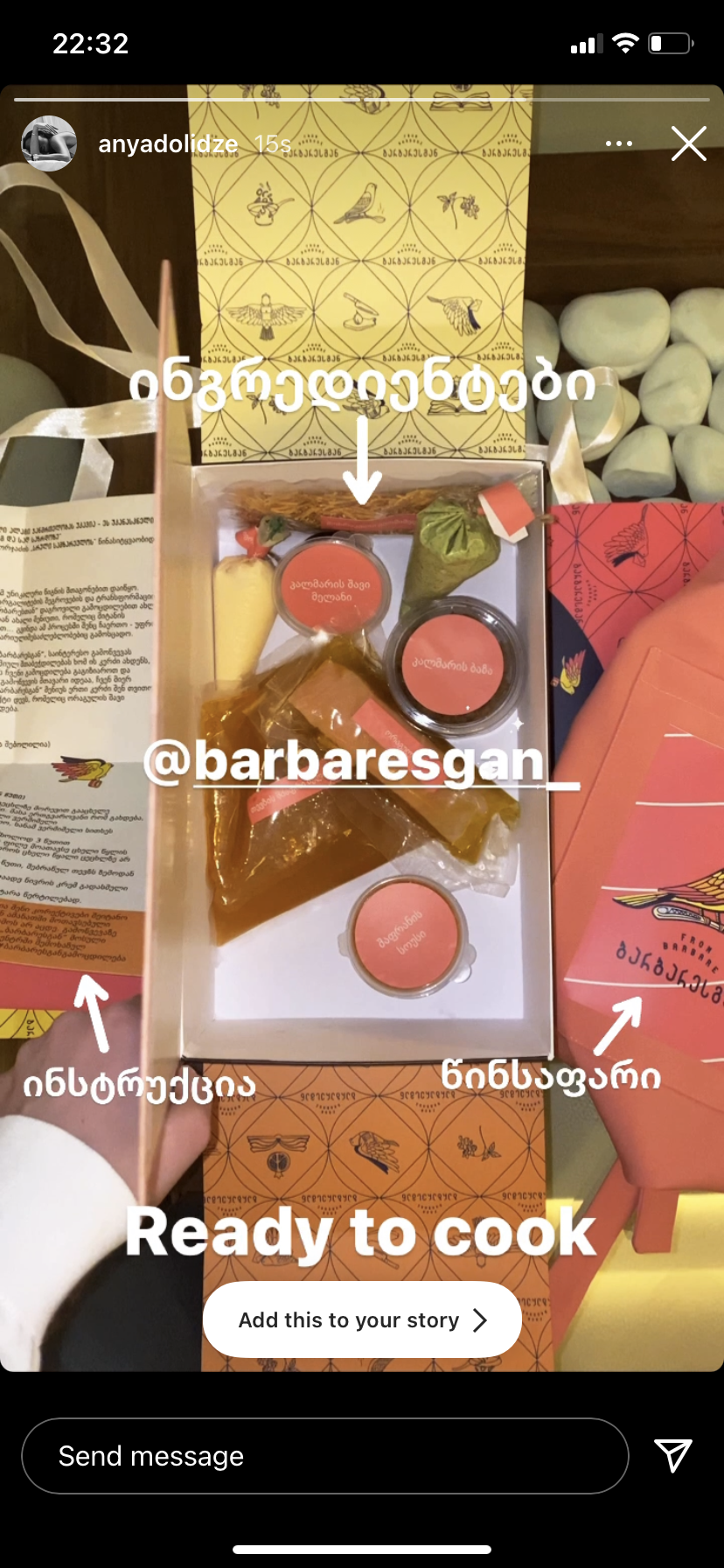„იდეის განხორციელებაზე დიდხანს ვფიქრობდით, პანდემიამ კი პროცესი ჩვენთვისაც დააჩქარა. სპეციალურად ამ ახალი ხაზისთვის შეფმზარეული ესპანეთიდან მოვიწვიეთ, შემდეგ კი – ბარბარე ჯორჯაძის წიგნისა და შეფის გამოცდილების სინთეზით – მიტანის სერვისზე ადაპტირებული მენიუ შევქმენით,“ – გვითხრეს ქართული ოჯახის წარმომადგენლებმა და პირველი გზავნილის მიტანისთანავე დაამტკიცეს, რომ ამ სერვისშიც ისეთივე ინოვატორები არიან, როგორც – თავდაპირველ კონცეფციასა და სხვა დანარჩენში. „ბარბარესგან“ მიტანილი ყველა ინგრედიენტი ინარჩუნებს მთავარს – ავთენტურობას, პარალელურად კი ზრუნავს იმაზე, რომ განავითაროს ქართული გასტრონომიული კულტურა, გააუმჯობესოს მომსახურების ხარისხი, შეინარჩუნოს ნაცნობი გემო, ადაპტირდეს ახალ რეალობასთან და გაუსწროს დროს – ზუსტად ისე, როგორც ბარბარე ჯორჯაძე უსწრებდა.