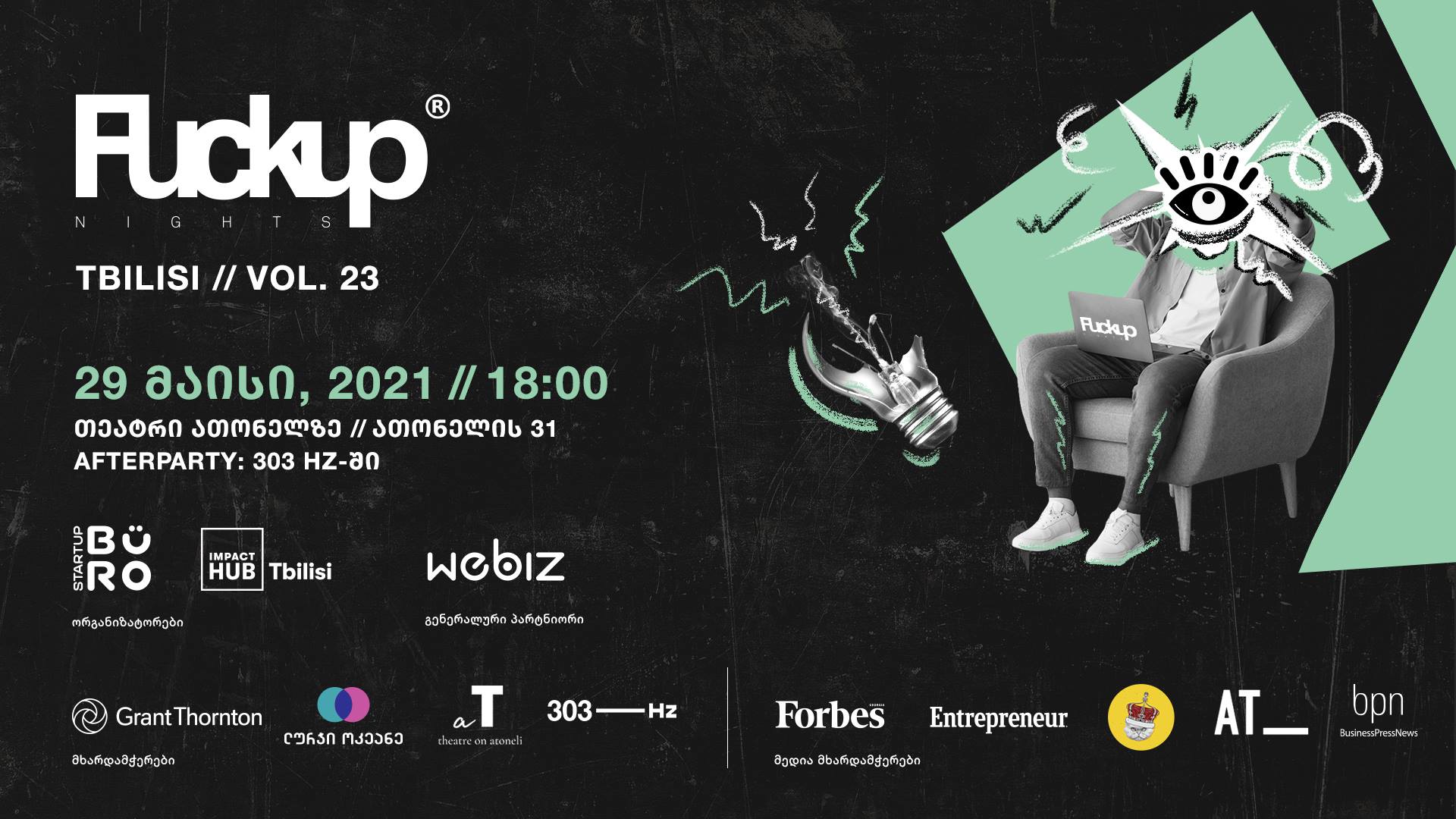 Startup Büro-სა და Impact Hub Tbilisi-ს ორგანიზებით, 29 მაისს, 18:00 საათზე, Fuckup Nights Tbilisi-ის რიგით ოცდამესამე ღონისძიება გაიმართება. ღონისძიების მასპინძელია თეატრი ათონელზე.