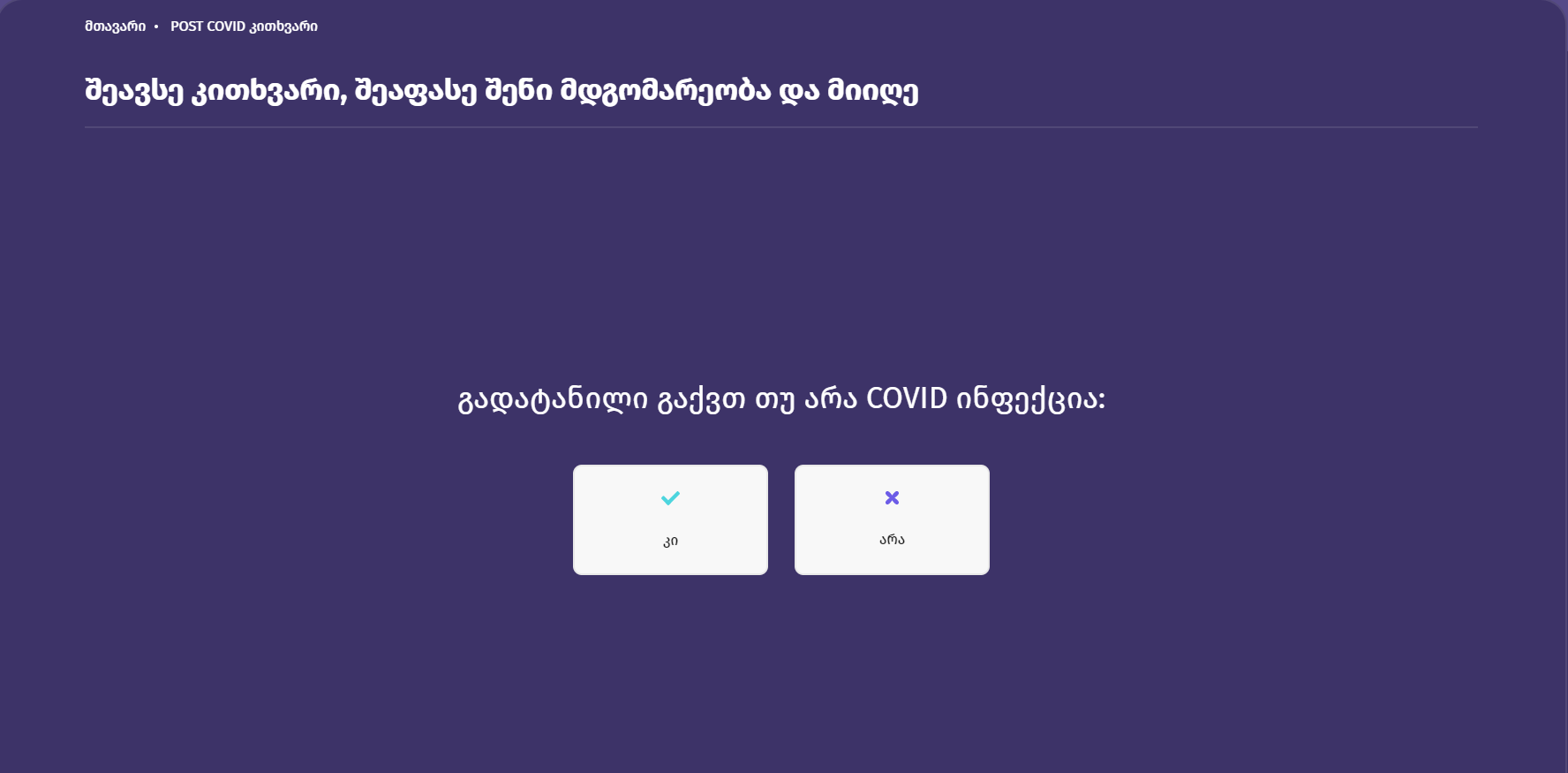 პორტალი არ გულისხმობს რეგისტრაციას. მომხმარებელს შეუძლია რეგისტრაციის გარეშე შეავსოს POST COVID კითხვარი და მიიღოს შესაბამისი რეკომენდაციები და ბენეფიტები. საჭირო იქნება მხოლოდ აპლიკაციის ფორმის შევსება, რომლითაც შემდგომ უკვე მოხდება ადამიანის იდენტიფიცირება ჰოსპიტალში