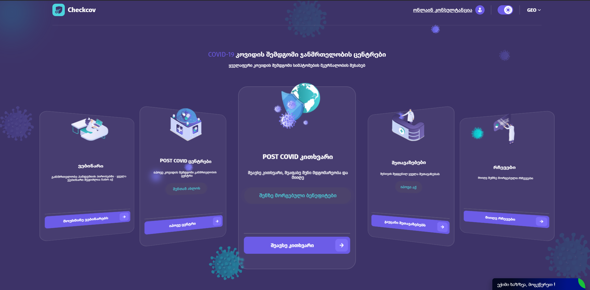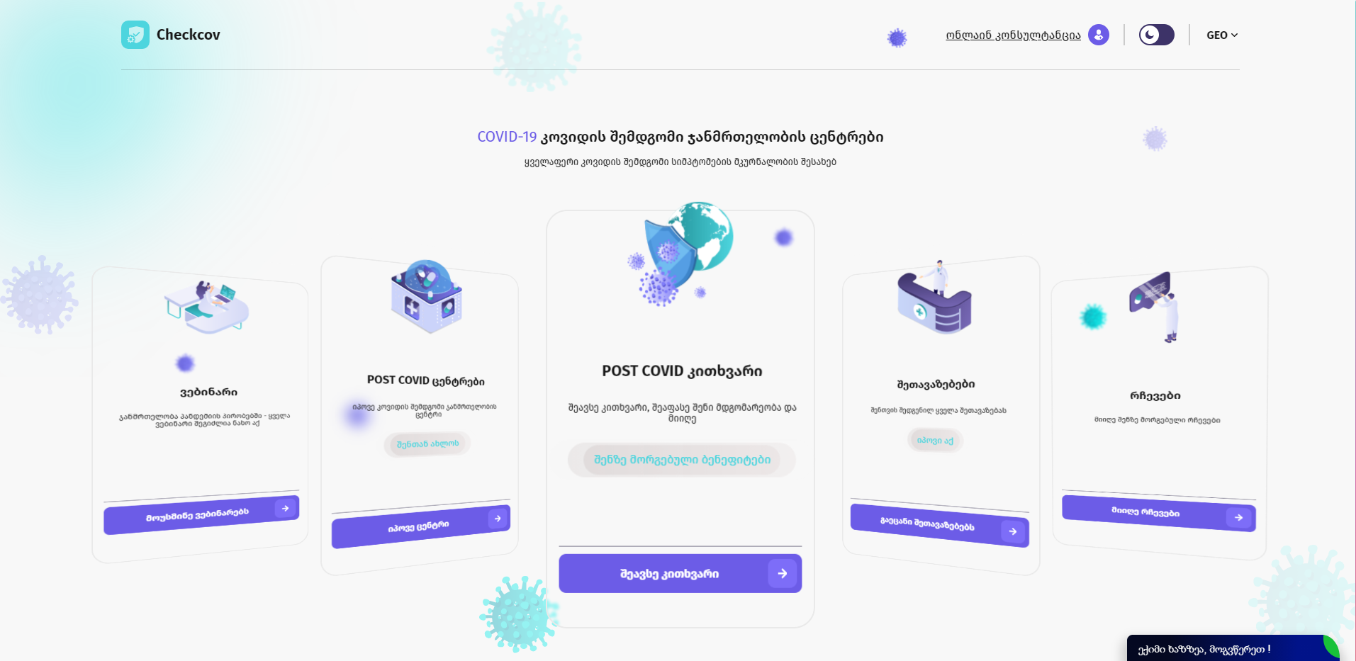 სწორედ ამ მიზნით, ევექსი ჰოსპიტლების ბაზაზე თბილისში, ქუთაისსა და ბათუმში კოვიდის შემდგომი 7 ჯანმრთელობის ცენტრი ამოქმედდა. ხოლო მათი მკურნალობის მეთოდებისა და გამოცდილების მოსახლეობის სხვადასხვა სეგმენტისთვის გასაზიარებლად, გაციფრულება ერთ-ერთი მნიშვნელოვანი კომპონენტი იყო. შესაბამისად, ეს ცენტრები www.checkcov.ge პლატფორმის გარშემო საკუთარი გამოცდილებით გაერთიანდნენ.