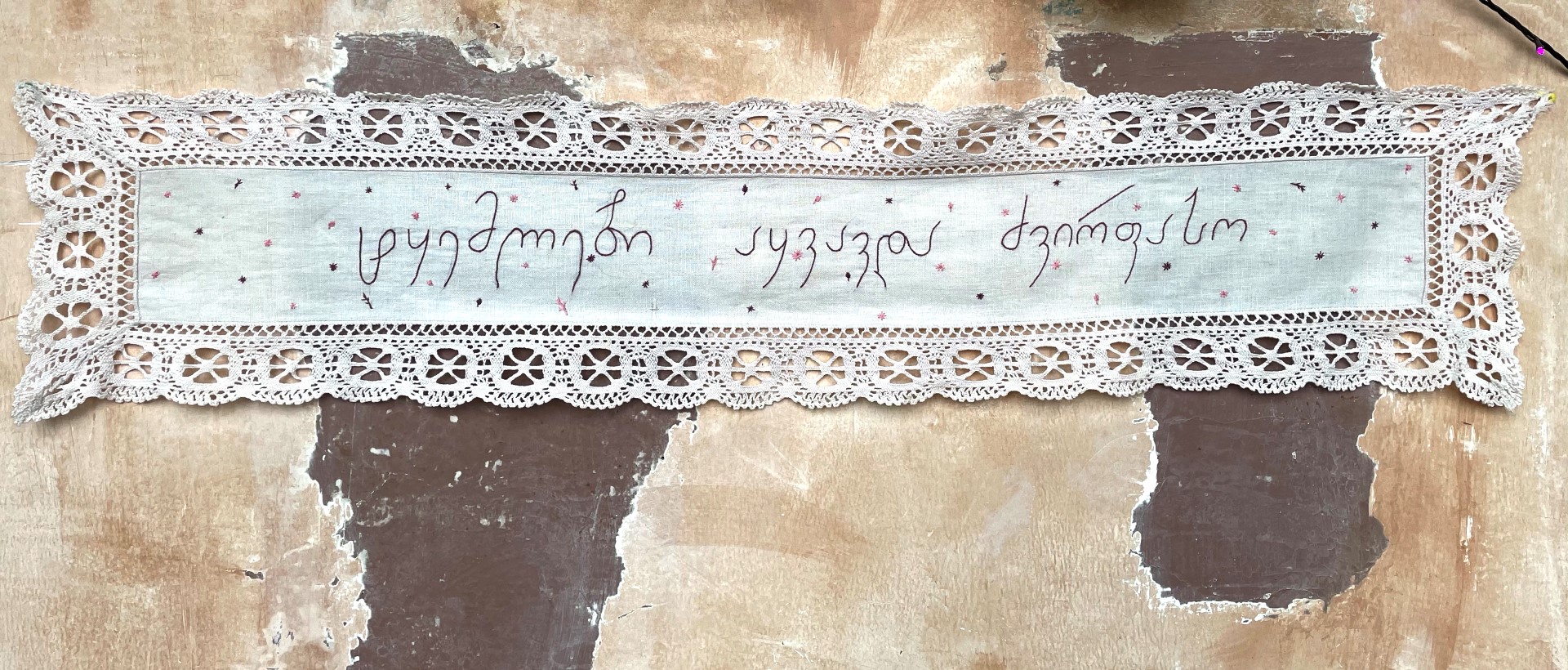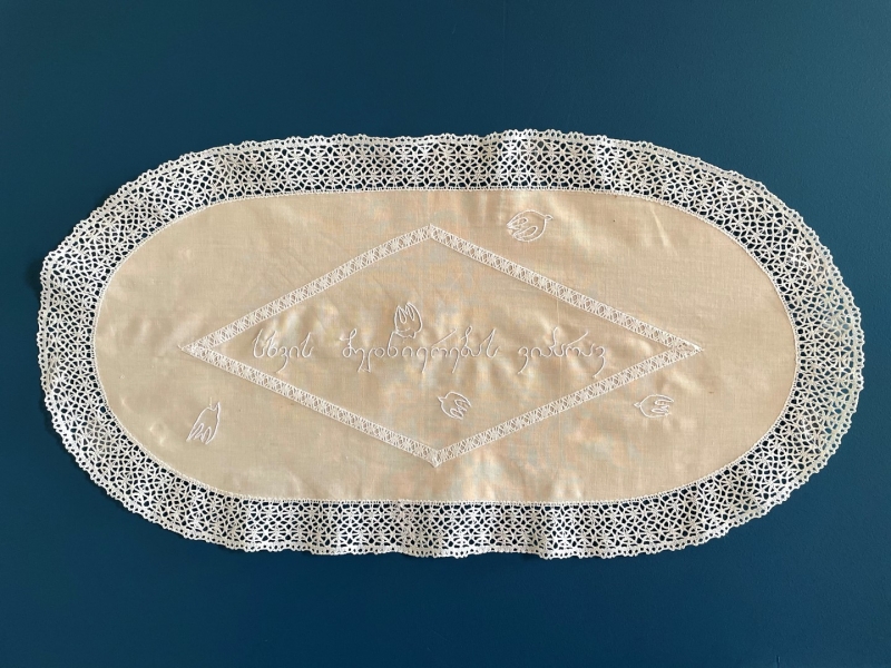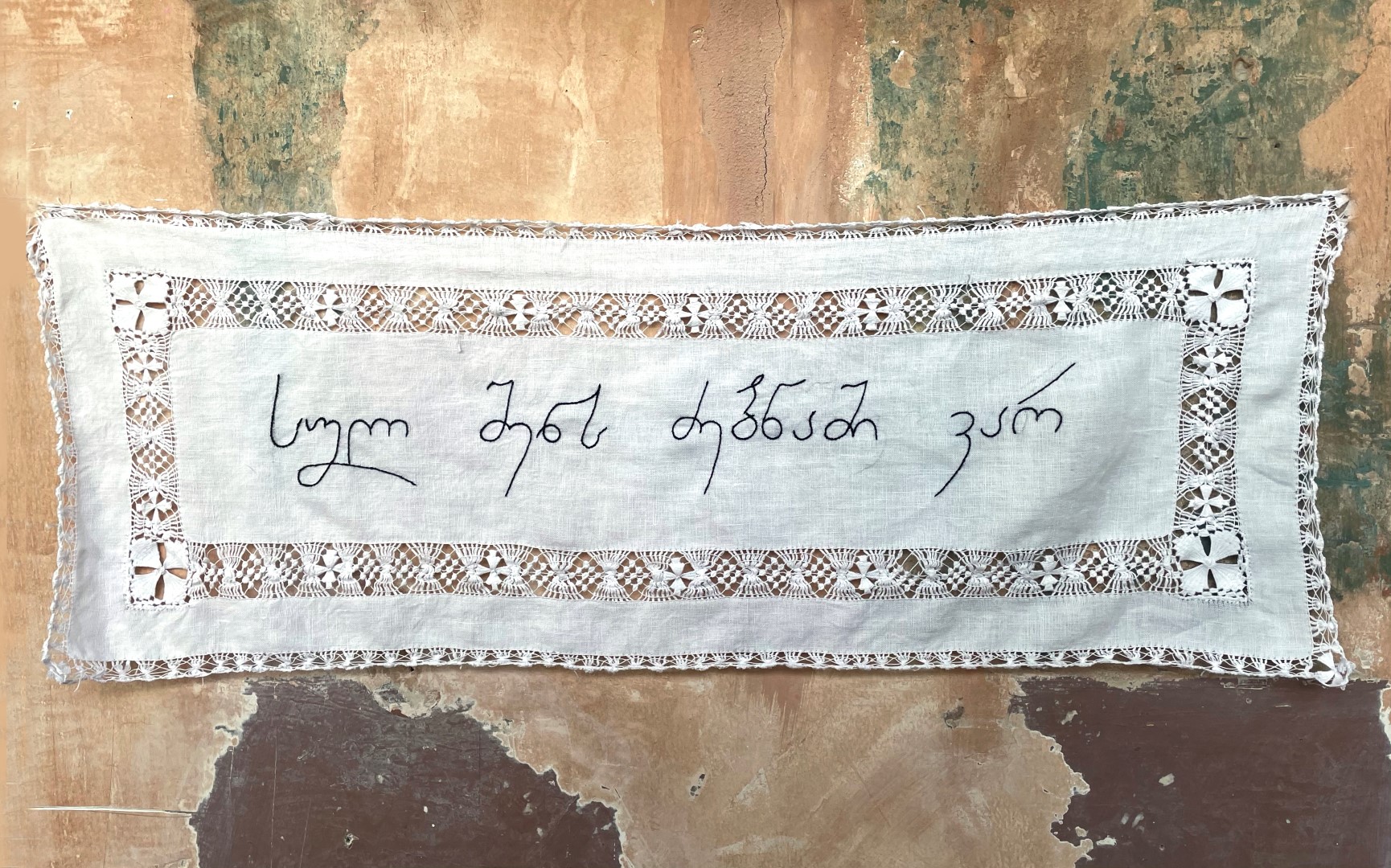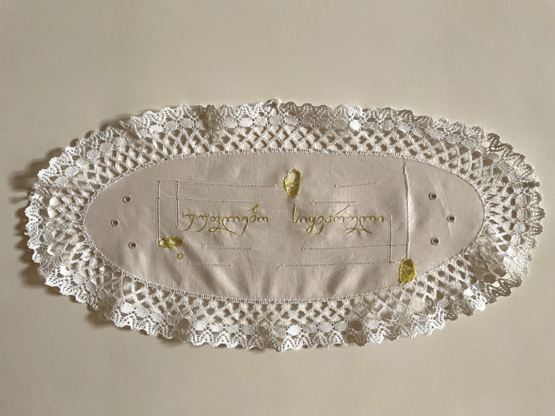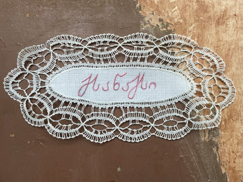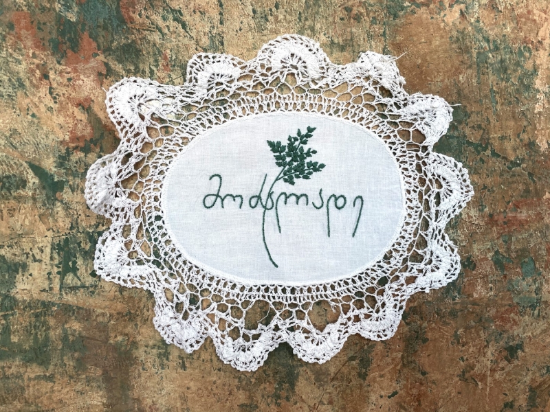 ძალიან უცნაურია, მაგრამ პირველი სიტყვა, რომელიც ამოვქარგე, იყო “მიყვარხარ”, შემდეგ უკვე ემოციურად მივყვები. ზოგი სიტყვა და ფრაზა გადადებული მაქვს და ვიცი, რომ დრო მჭირდება ყველაფრის ქსოვილზე გადმოსატანად. საბოლოოდ, ალბათ ყველაფერი ამოიქარგება, ყველაფერი, რისი თქმაც მსურს. წინასწარ არასდროს ვარჩევ, თითქოს თავად სიტყვები მიკარნახებენ – ახლა ვისი ჯერია