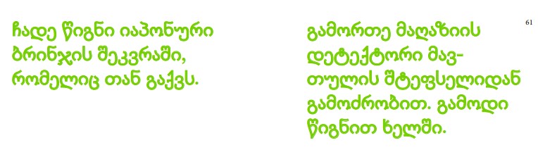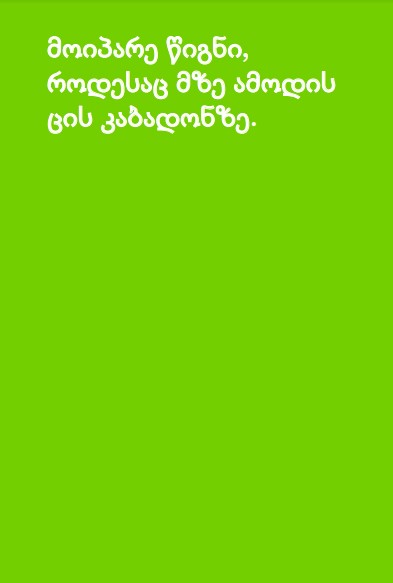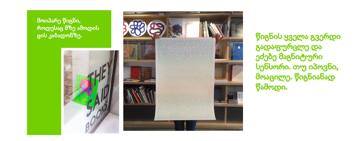 „მთლიანი წიგნი ხელით გადაწერე მაღაზიაში“ („როგორ მოვიპაროთ წიგნები“) – სწორედ ეს ფრაზა განხორციელდა პროექტად, რომელიც აქამდე სხვადასხვა ენაზე უკვე იყო შექმნილი: წიგნის სრული, ქართული ვერსია დაიბეჭდა ერთ დიდ ფორმატზე – და ასე შეიქმნა წიგნი/პოსტერი, რა თქმა უნდა, ქართული ანბანით. ნამუშევარი They Said Books-მა, საერთაშორისო გამომცემლობა Edition Taube-თან ერთად შეზღუდული რაოდენობით, სპეციალურად Silk Screen პრინტერზე, შვეიცარიაში დაბეჭდა.
