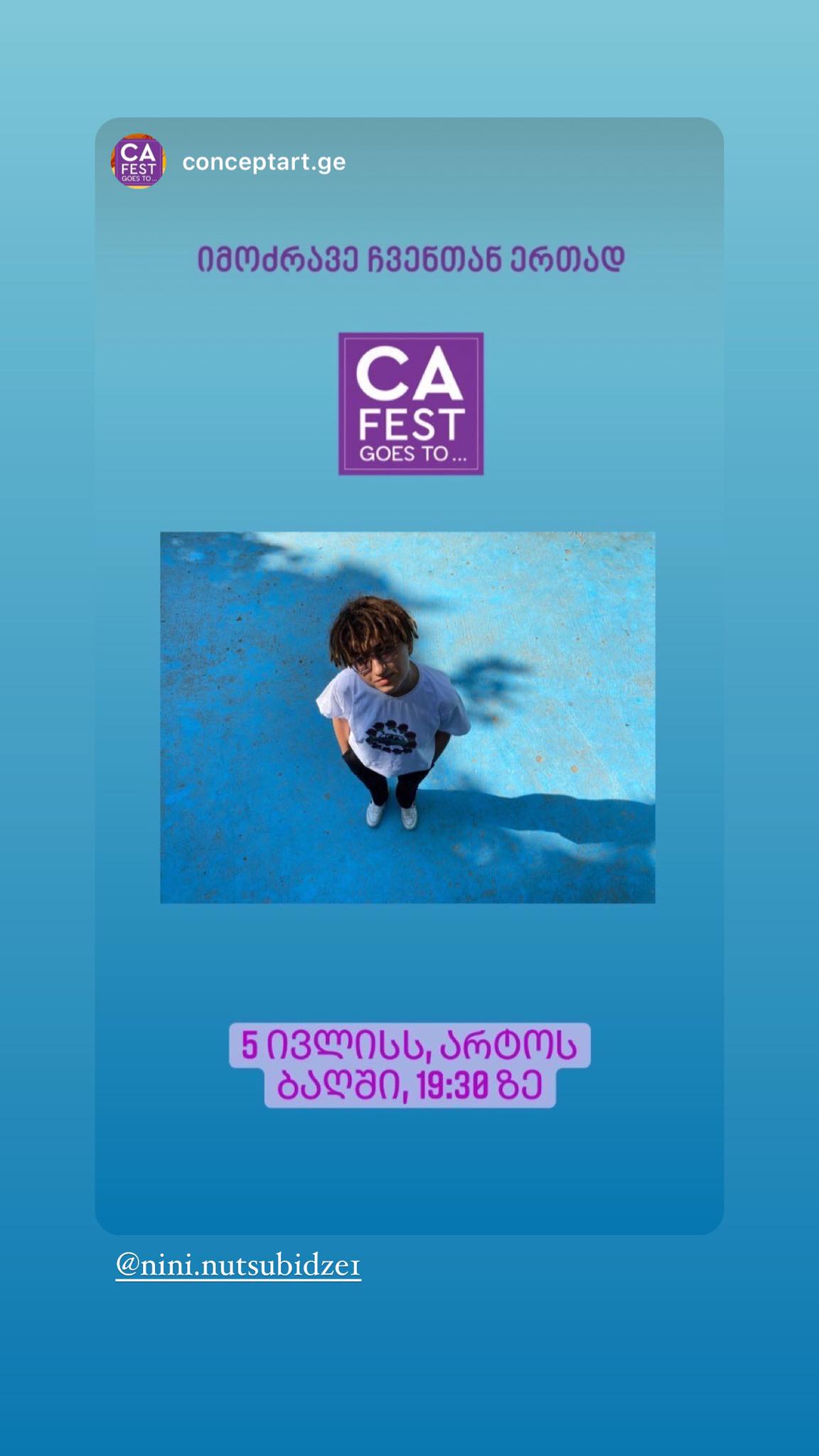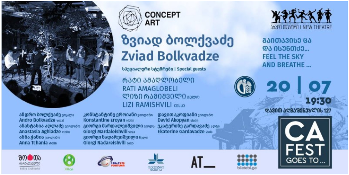 კონცეპტArt-ის მოძრავი  აქცია-ფესტივალი „CA Goes To…” 5 ივლისს გია ყანჩელის სახელობის არტოს ბაღში გაიხსნება და  მთელი წლის მანძილზე სხვადასხვა ჟანრის არტისტებსა და პროექტებს  გააერთიანებს.   „CA Goes To“  ეწვევა რეგიონებსაც, კონცეფციის ნაწილი კვლავ  მოულოდნელობები იქნება, ერთ დღესაც შეიძლება „CA Goes to…”   თქვენს ეზოს ეწვიოს. აქციის სლოგანია – იმოძრავე ჩვენთან ერთად!