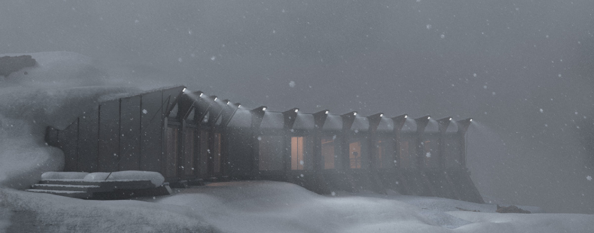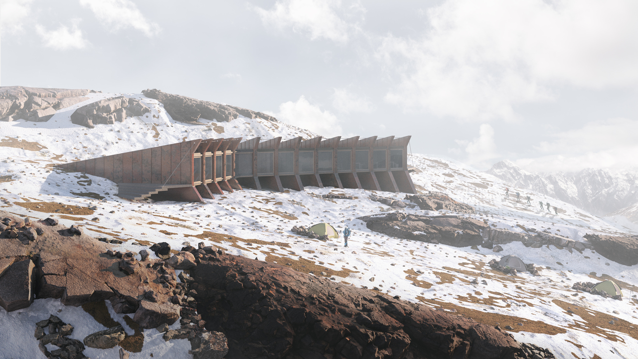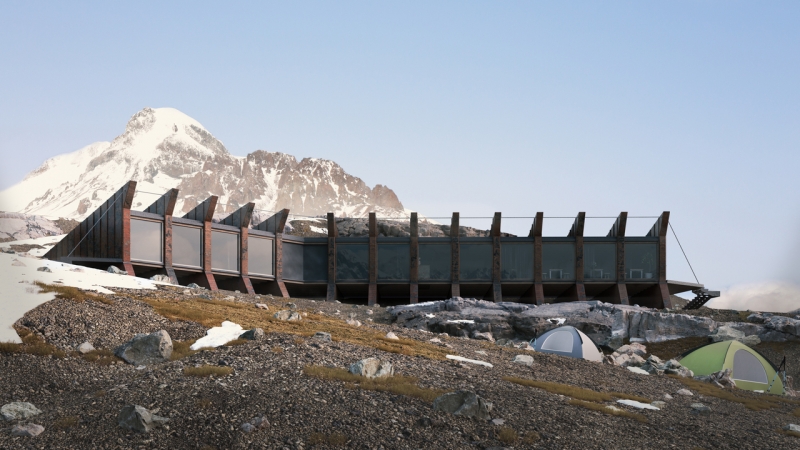 “რა ტიპის მშენებლობა გაამარტივებს და დააჩქარებს პროექტის დასრულებას? ეს არის ბევრი განმეორებადი ელემენტი – მოდულური მშენებლობა. არქიტექტურული გადაწყვეტაც ამ მიმართულებით განვავითარეთ”, – ამბობს ირაკლი შევჩენკო. შენობაც ნაკვეთზე ისე უნდა იყოს მოწყობილი, რომ მინიმალური ფართობი აითვისოს და ჰქონდეს ფუნციურად პროპორციული სივრცეების დაყოფა სწორი ორიენტაციით. პროექტის ზოგადი მონახაზი ის არის, რომ შენობა გახდეს მედიატორი და თანაბრად შეითავსოს მნიშვნელოვანი ფუნქციები ადამიანებისთვის, რომლებიც არიან დამთვალიერებლები ან ალპინისტური მარშრუტის გზას ადგანან.