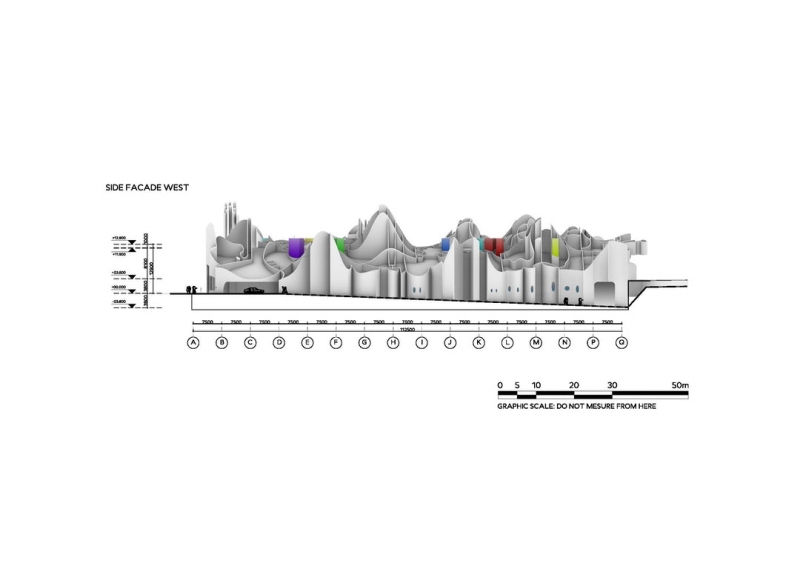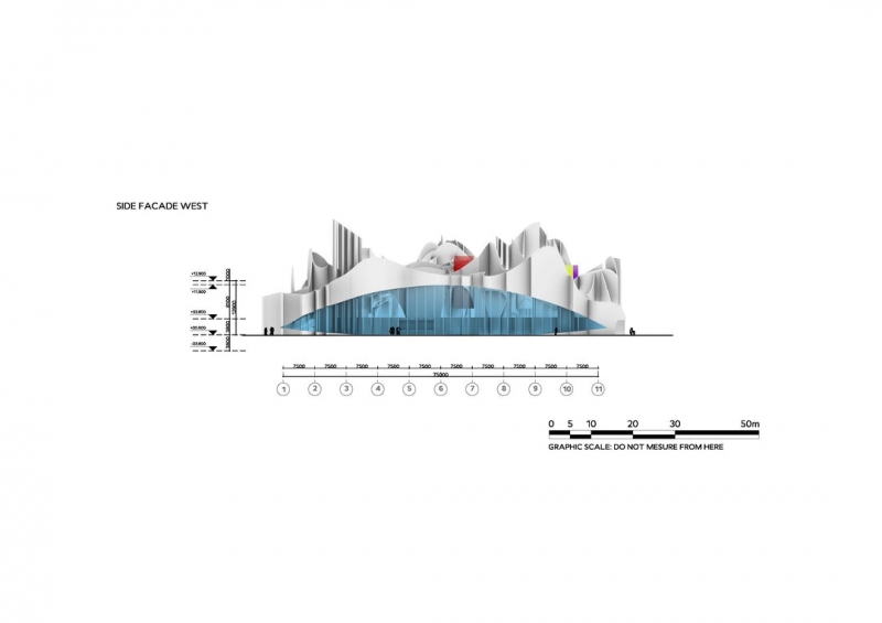 შენობის არქიტექტურა ვერტიკალური კედლებით წარმოქმნილი შემთხვევითი ფორმების კოლექციაა. ორი ქვედა სართული მოწყობილია რეგულარული ბრტყელი ფილებითა და სვეტებით, სადაც პირველი სართული თაღოვანი სივრცეა. იგი გაჭრილია კედლებით და ქმნის დიდ ღია სივრცეს მთავარ მუზეუმსა და საზოგადოებრივ ობიექტებში. გამჭვირვალე მინის ტიხრები კი საჭიროებისამებრ გამოყოფენ ფუნქციურ სივრცეს.