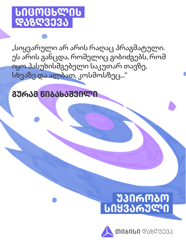 გ: სიყვარული არ არის პრაგმატული, სიყვარული ტრანსცენდენტულია. არ აქვს ფიზიკური ფორმა. ის შენგან დამოუკიდებლად მოდის და შენგან დამოუკიდებლად არსებობს.  მაგრამ ძალიან დიდი ძალა აქვს, რადგან ამ დროს ხდები მზრუნველი, პასუხისმგებელი საკუთარ თავზე, სხვაზე და კოსმოსზე. კოსმოსი კი სწორედ ღმერთის შექმნილი წესრიგია, რომელზე ზრუნვაც შენ სიყვარულით გავსებს.