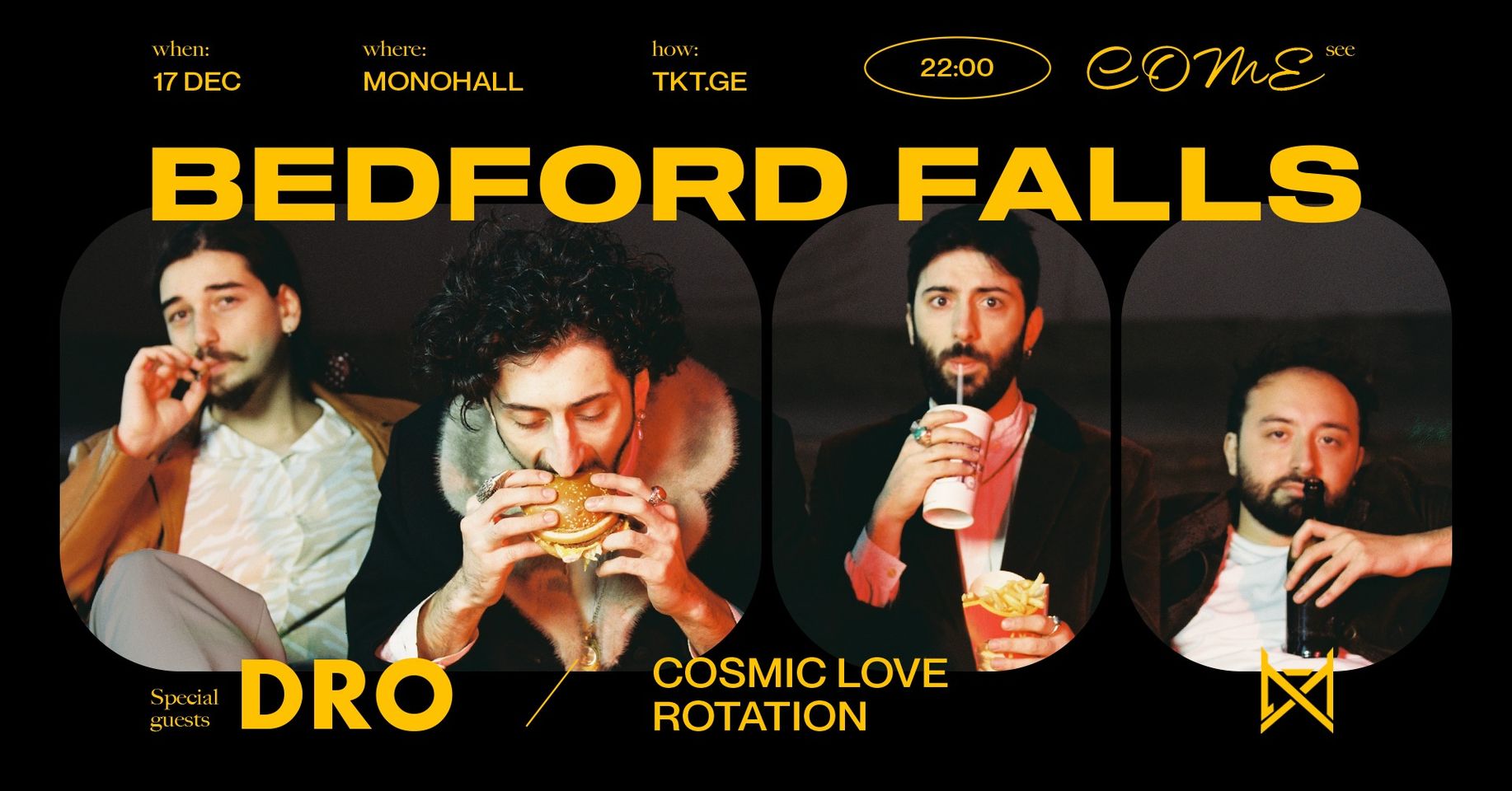 17 დეკემბერს, 22 საათზე MonoHall , კინოს სახლში წარმოგიდგენთ BEDFORD FALLS – კონცერტს, სადაც სპეციალური სტუმრები DRO და Cosmic Love Rotation იქნებიან.