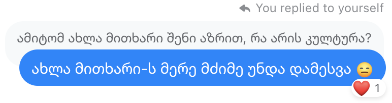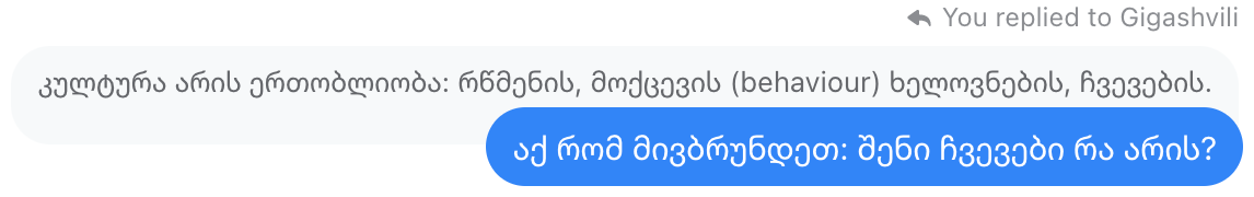 გიორგი: კულტურა არის ერთობლიობა: რწმენის, მოქცევის (behaviour) ხელოვნების, ჩვევების.