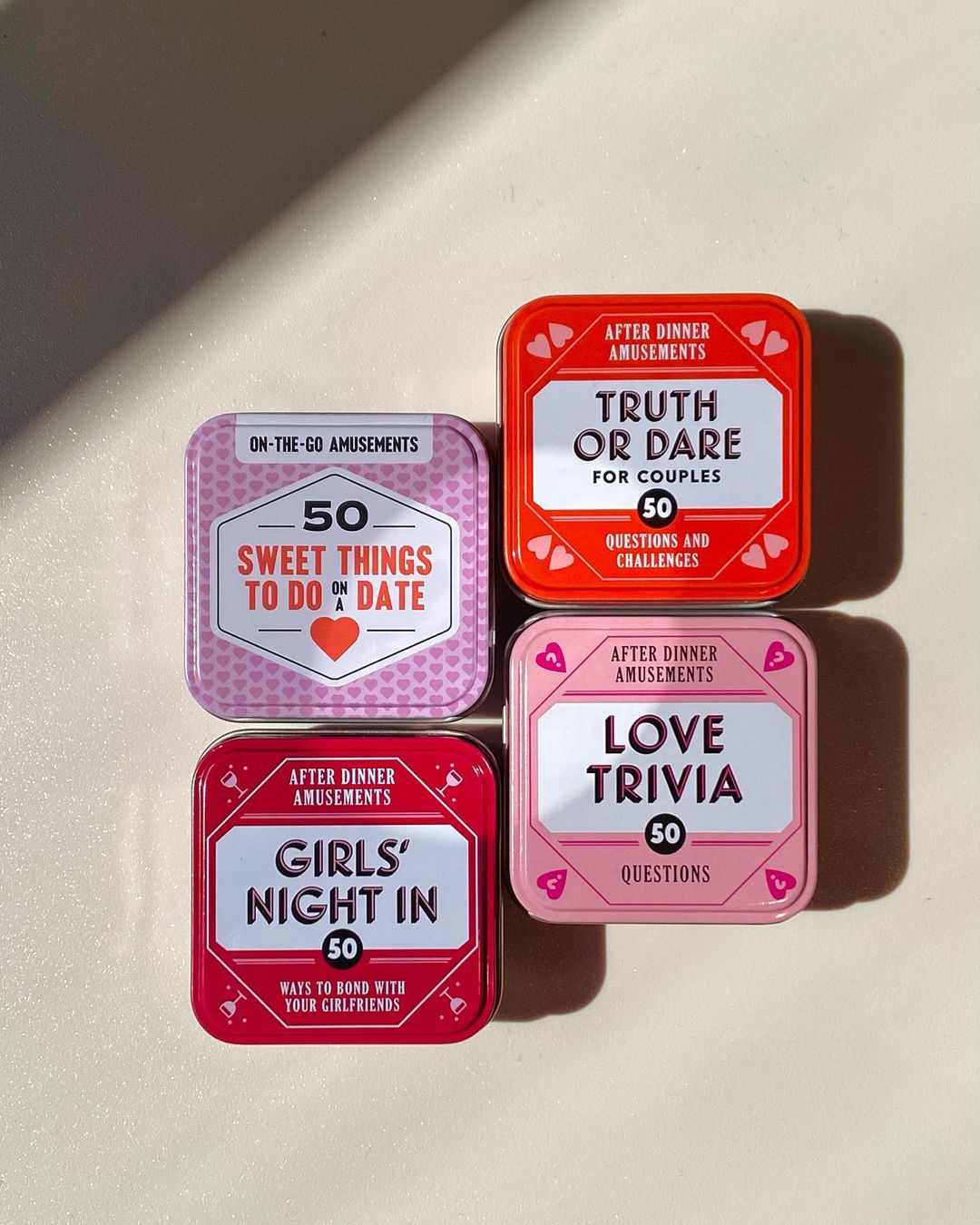 პატარა ყუთებში მოთავსებული 50 ბარათი განსხვავებული თემატიკის მიხედვით გვთავაზობს პირობებს, რომელიც მოთამაშეებს ეხმარება გულწრფელ საუბრებში, გართობასა და დროის სასიამოვნოდ გატარებაში. მაგალითად, ამ სერიის ერთ-ერთი გამოშვება, Love Trivia 50 კითხვას მოიცავს სიყვარულის თემაზე ლიტერატურიდან, ისტორიიდან, მეცნიერებიდან, პოპ კულტურიდან და ერთ-ერთ საუკეთესო გასართობ თამაშად ითვლება წყვილებისთვის. პირობა შემდეგია – მოთამაშეები დასტიდან თითო ბარათს იღებენ და ხმამაღლა კითხულობენ ზედ დატანილ კითხვას, სწორი პასუხის ავტორი ბარათს იტოვებს. ბოლო კითხვის დასმის შემდეგ, ვისაც მეტი ბარათი აღმოაჩნდება ხელში, გამარჯვებულიც ისაა. კიდევ ერთი თემატური ყუთია Truth or dare for couples, რომელიც ჩვენთვის კარგად ნაცნობი თამაშის, “სიმართლე თუ მოქმედება” ნაირსახეობაა, თუმცა ადაპტირებულია წყვილებისთვის.