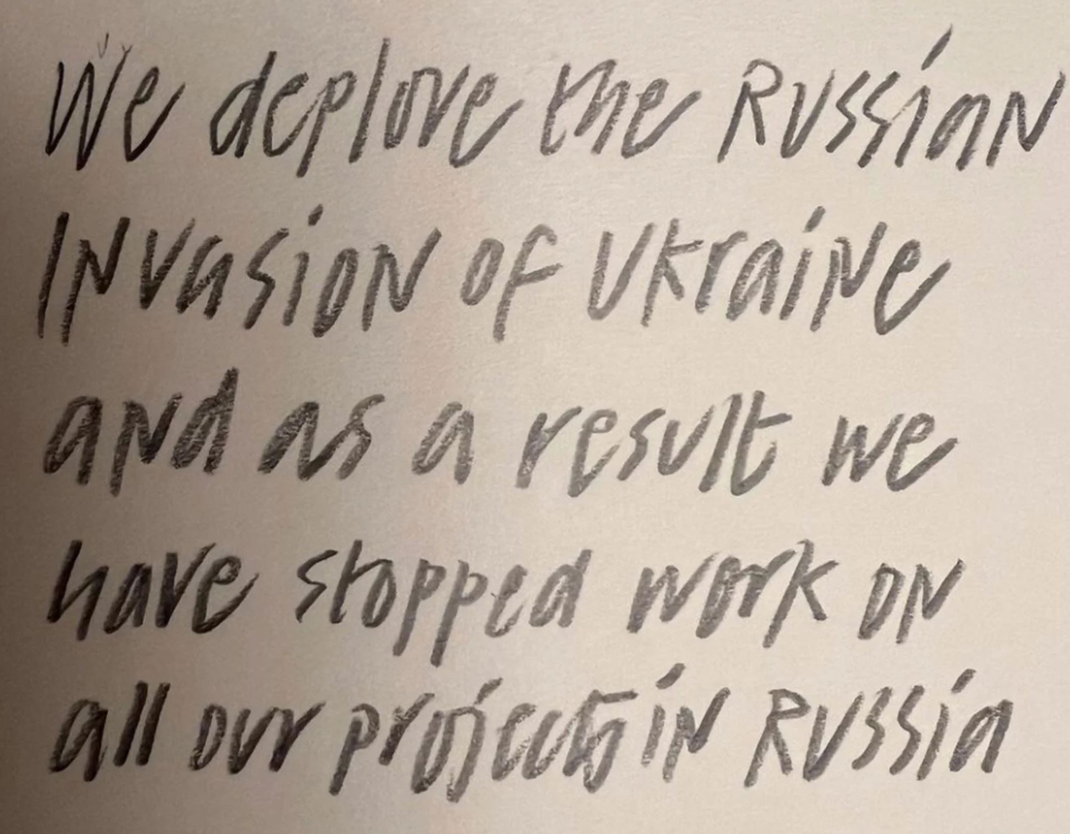 We deplore the Russian invasion of Ukraine and as a result we have stopped work on all our projects in Russia. pic.twitter.com/j1DllyKKPc