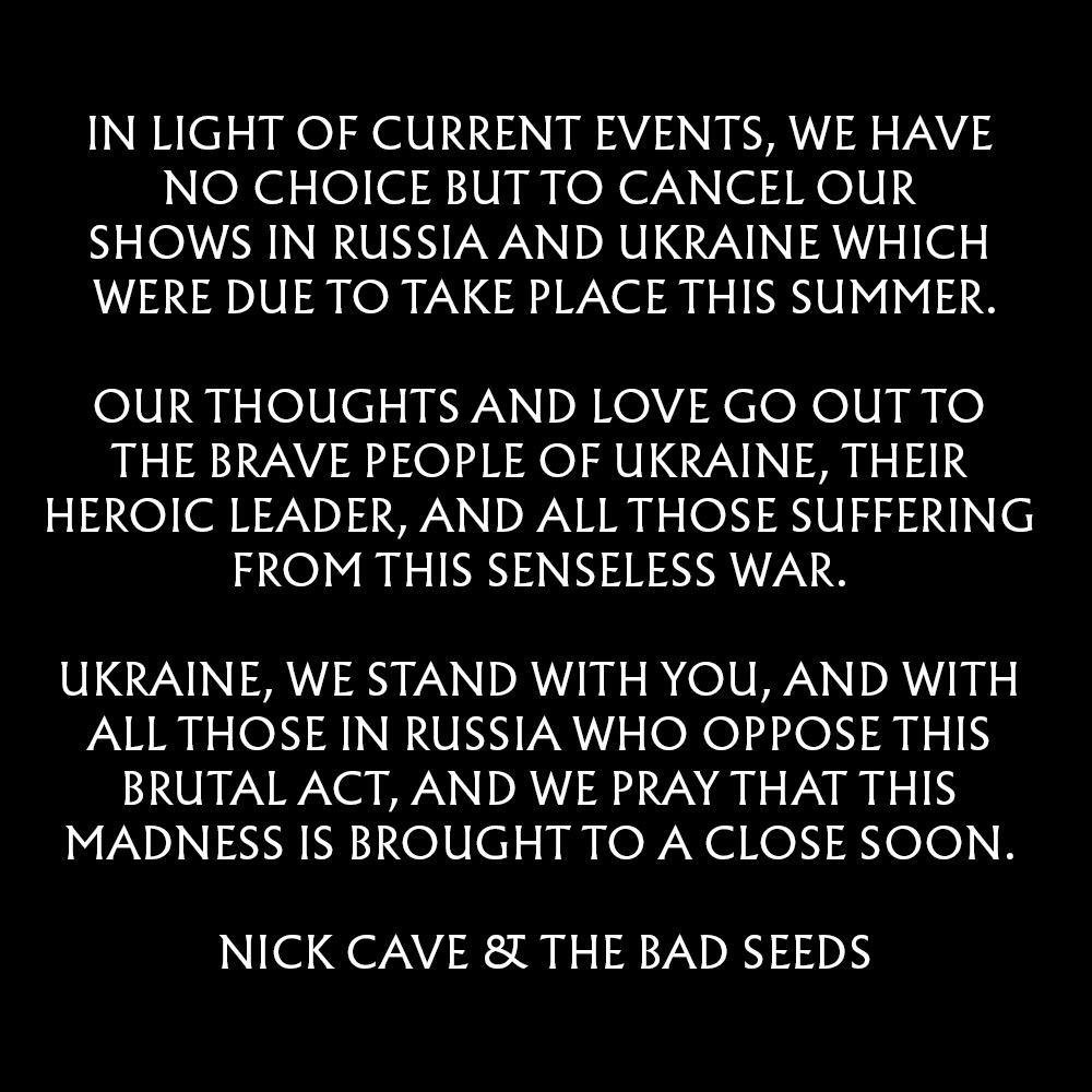 ავსტრალიელ-ინგლისელმა ნიქ ქეივმა და მისმა ჯგუფმა Bad Seeds-მა მიმდინარე მოვლენებიდან გამომდინარე, კონცერტები უკრაინასა და რუსეთში გააუქმა. ნიკისა და ჯგუფის წევრების გზავნილში კი წერია: „ჩვენი ფიქრები და სიყვარული მიმართულია უკრაინელი ხალხის, მისი გმირი ლიდერის და ამ უაზრო ომისგან ყველა დაზარალებულის მისამართით. უკრაინა, ჩვენ თქვენთან ვართ, რუსეთში კი იმათთან, ვინც წინააღმდეგია ამ უხეში მოქმედებების. და ჩვენ ვლოცულობთ, რათა ეს სიგიჟე მალე დასრულდეს“. ამერიკული ჯგუფი Bon Jovi უერთდება Stand With Ukraine-ს და ამავე დროს, მან საკუთარ ფეისბუქ-გვერდზე გაავრცელა ოდესაში გადაღებული ვიდეო, სადაც „ბონ ჯოვის“ სიმღერის თანხლებით, ოდესელები ზღვის სანაპიროზე ქალაქის დასაცავი ბარიკადებისთვის ქვიშას აგროვებენ. ამავე დროს, ჯონ ბონ ჯოვი აქვეყნებს ნებრასკას ქალაქ ომაჰაში 1-ელ აპრილს ჩატარებული კონცერტის ფრაგმენტს, სადაც იგი უკრაინული სიმბოლოების ფონზე თავის სიმღერას – We Don’t Run-ს ასრულებს.
