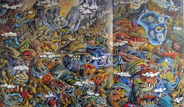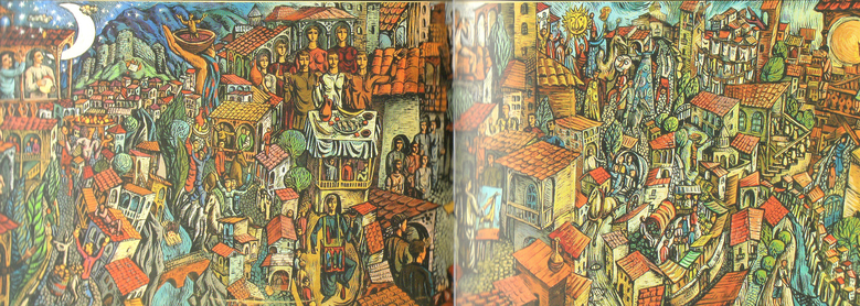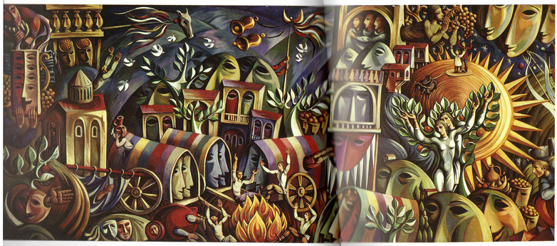 ის ერთდროულად სხვადასხვა ჟანრში ძალიან პროდუქტიულად მუშაობს და მისი ფერები და ესკიზები გადადის წიგნის ილუსტრაციიდან თეატრის სცენაზე, სცენოგრაფიიდან დიდ მონუმენტურ პანოებზე და უფერული კედლები საბჭოთა რეალობიდან ამოვარდნილი მითოლოგიური პერსონაჟებით დასახლებულ ფერად ზღაპრულ სამყაროებად იქცევა.
