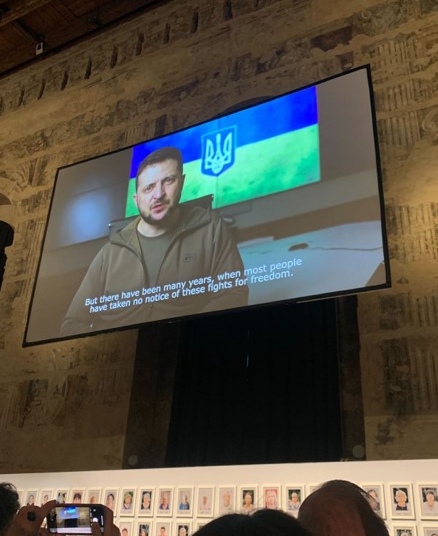 უკრაინის ეროვნული პავილიონის პარალელურად PinchukArtCentre წარადგენს დიდ გამოფენას ომის თემაზე. ზელენსკის ჩართვა ჰქონდათ. მიმართვის გარდა, გამოფენაზე უკრაინის პრეზიდენტის „ნამუშევარიც“ არის წარმოდგენილი – დროშაზე დატანილი მისი ტექსტი ხელმოწერით.
