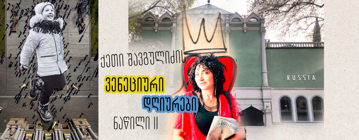 არსენალეზე უკრაინის პავილონში დიდხანს დავრჩი და უკვე 7 ხდებოდა, იკეტებოდა, ჟარდინში რომ მივედი. დამთვალიერებლები ჯერ კიდევ ბევრნი იყვნენ, მაგრამ დაცვა შემსვლელებს აღარ უშვებდა, კარაბინიერებით სავსე იყო იქაურობა. მე არ დავნებდი და სულ 5 წუთი ვთხოვე, მხოლოდ რამდენიმე ფოტოსთვის. სწორედ ეს ვუთხარი – დაკეტილი რუსული პავილიონი უნდა გადავიღო-მეთქი. ის იყო ხვეწნა უნდა დამეწყო, მაგრამ ამ სიტყვებმა გაჭრა. დაცვამ თავად მიმაცილა იქამდე, მაგრამ გამოსვლისას Grazie mille-თი რომ დავიღვარე, ეგ არ გიშველის, შენ გამო წესი დავარღვიე, კოცნის გარეშე ვერ წახვალო და ლოყა მომიშვირა. სხვა დროს რა ამბავს მოვაწყობდი, წარმოდგენაც არ მინდა, მაგრამ ჩემთვის გამონაკლისი რომ დაუშვა და დაკეტილი რუსული პავილიონის ხილვის სიამოვნება არ წამართვა, აღარ დავუწყე საქმის გარჩევა და ორივე ლოყაზე ვაკოცე, ისე როგორც იტალიელებს სჩვევიათ. ჰმ, კოვიდმაც კი არ შემაშინა.
