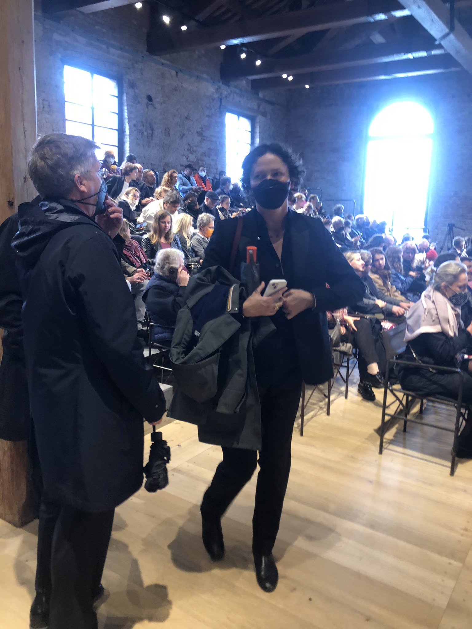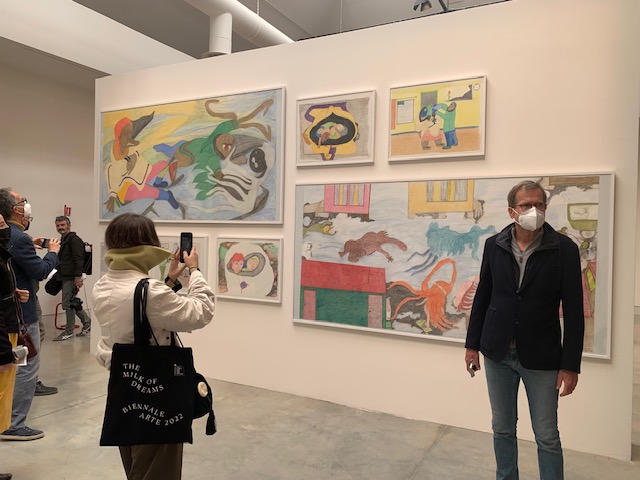 აქ კი, უკრაინის პავილიონის ოფიციალური გახსნის კადრებია: არსენალეზე უკრაინის პავილიონში წარმოდგენილი ნამუშევრის ავტორი – პავლო მაკოვი სიტყვით მიმართავს შეკრებილ ხალხს, უკრაინის ელჩი ზელენსკისგან გზავნილს მიუტანს უკრაინული პავილიონის გუნდს (ღვინისფერ საქაღალდეშია), მადლობას უხდიან იმ ადამიანებს, ვინც ხელი შეუწყო და დაეხმარა. იქვეა ის ხარკოველი ხელოვანი, ბორის ჯონსონს და ზელენსკის რომ ქუჩაში მამლების ფიგურები აჩუქა… მე და პავლო მაკოვი ჩავეხუტეთ ერთმანეთს. ქართული პავილიონის ჩანთა ვაჩუქე, მეტი არაფერი მქონდა, არადა მინდოდა რამე ჰქონოდა ჩემგან, სიყვარულის და პატივისცემის ნიშნად. სხვაც მაქვს მასთან ერთად გადაღებული, მაგრამ ეს „უხარისხო“ ფოტო გამიზნულად ავარჩიე, თვალდახუჭული…