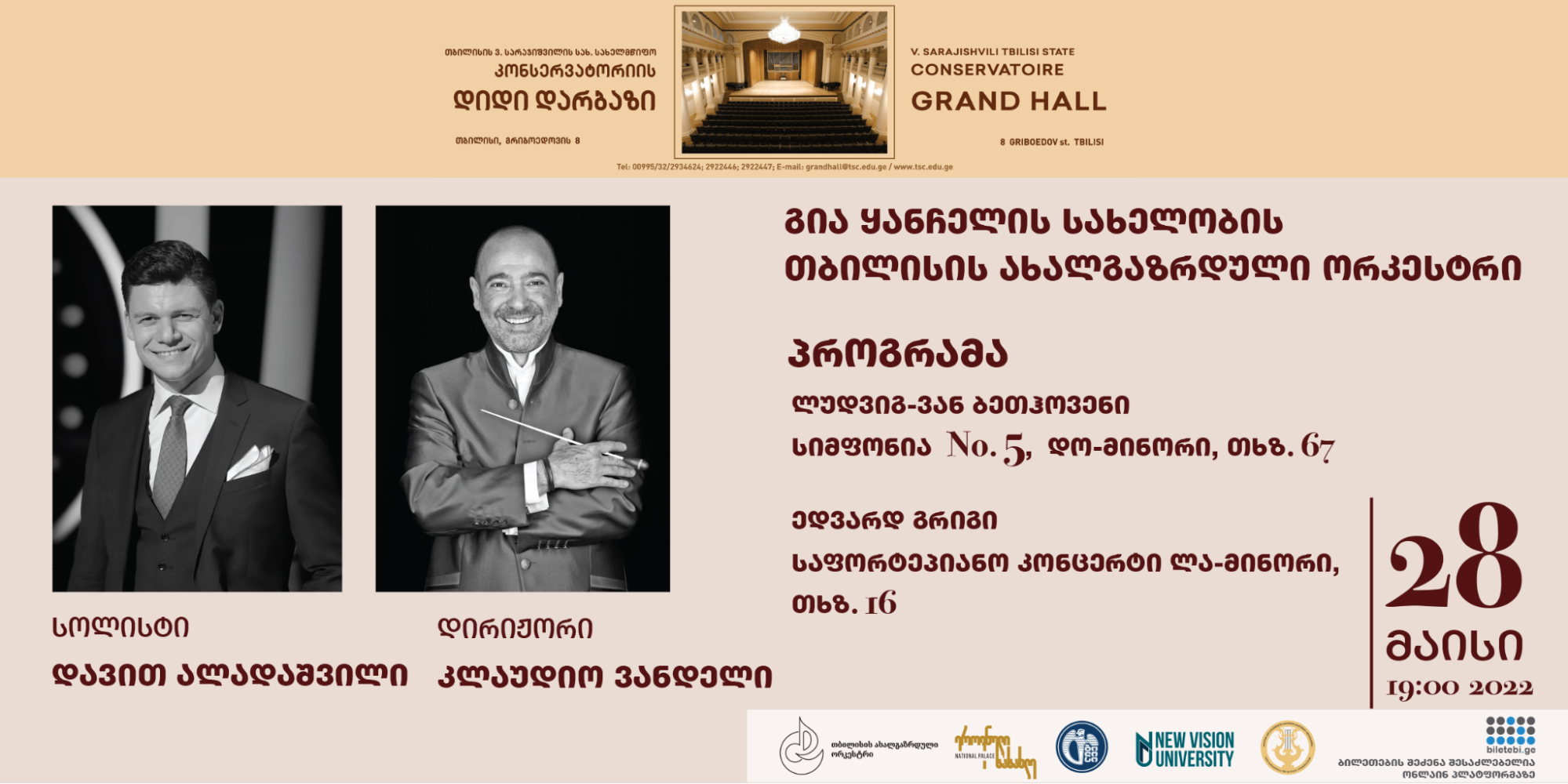 კონსერვატორიის დიდ დარბაზში 28 მაისს, 19:00 საათზე გია ყანჩელის სახელობის თბილისის ახალგაზრდული ორკესტრის კონცერტი გაიმართება. სოლისტი დავით ალადაშვილია, დირიჟორი კი კლაუდიო ვანდელი. პროგრამაშია ბეთჰოვენის სიმფონია #5, დო-მინორი, თხზულება 67 და ედვარდ გრიგის საფორტეპიანო კონცერტი ლა-მინორი, თხზულება 16.