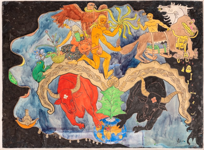 ერთ-ერთი საუკეთესო მისი აკვარელებიდან – „წითელი ხარი“ – ტოტემური კოსმოსის სურათია, სადაც ადამიანური, ცხოველური და ღვთაებრივი ერთად თანაარსებობს იმ საიდუმლო ცოდნის თანახმად, რის გადმოცემასაც ფრიდონ ნიჟარაძე მუდმივად ცდილობდა თავისი მხატვრობის გზაზე.