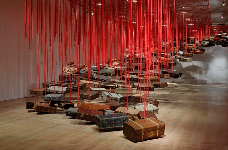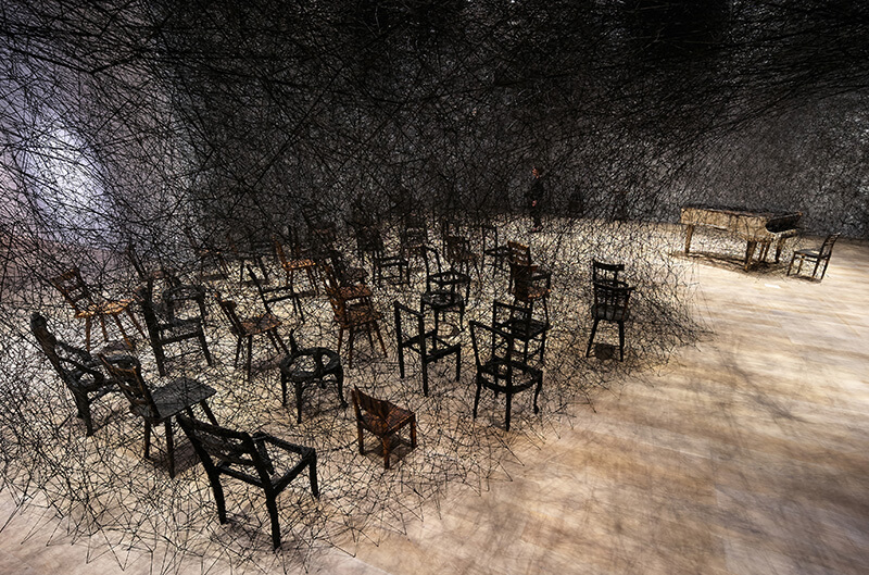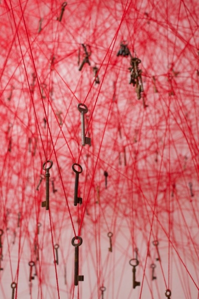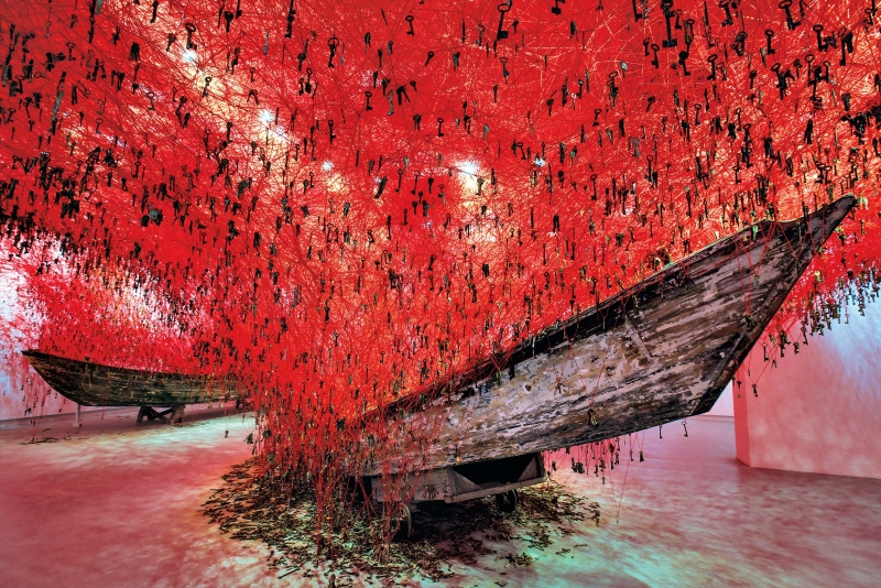 უზარმაზარ ატრიუმში ეს მკვეთრი და სიმძაფრით აღსავსე ფერი დომინირებდა – ერთმანეთში გადახლართული წითელი ძაფების მკვრივი ქსელებით დიდი ზომის ლაბირინთები იქმნებოდა, რომლებიც ჭერიდან იატაკზე მოთავსებულ შავი ნავების სკულპტურებში ეშვებოდნენ. ამ შემთხვევაში წითელი ფერი ადამიანის სხეულის მეტაფორა იყო, თხელი ძაფებისაგან შექმნილი რთული ქსელები კი თავის ტვინში არსებული ნერვული კავშირების ვიზუალიზაცია. ამ ინსტალაციით ჩიჰარუ შიოტამ ეგზისტენციალური კითხვები დასვა ბედისწერისა და კუთვნილების შესახებ და თქვა, რომ მათზე პასუხის გაცემა ისეთივე რთულია, როგორც ამ ერთმანეთში გადახლართული ნართების განცალკევება. ხელოვანმა ნამუშევრის შექმნისას მასალად ფეხსაცმელები, გასაღებები, საწოლის ჩარჩოები და წიგნებიც გამოიყენა, რადგან მიიჩნია, რომ ისინი როგორც პირადი, ასევე კოლექტიური მეხსიერების იდეალურ მეტაფორებად მოევლინებოდნენ მნახველს. მნიშვნელოვანია, რომ 2015 წელს ამ ინსტალაციის ხილვა ვენეციის სახელოვნებო ბიენალეზეც იყო შესაძლებელი – ჩიჰარუ შიოტამ მსოფლიოს იაპონური ხელოვნება ამ საოცარი ნამუშევრით წარუდგინა.