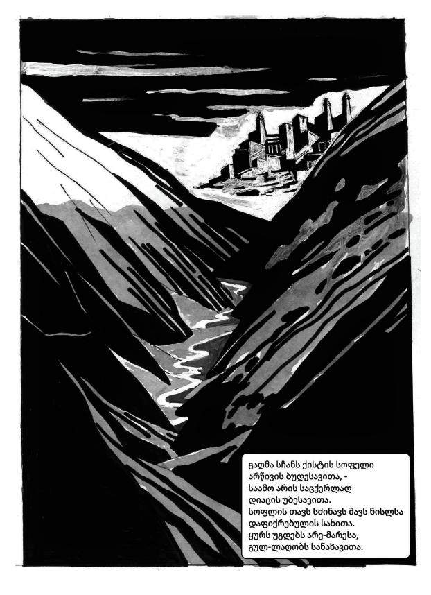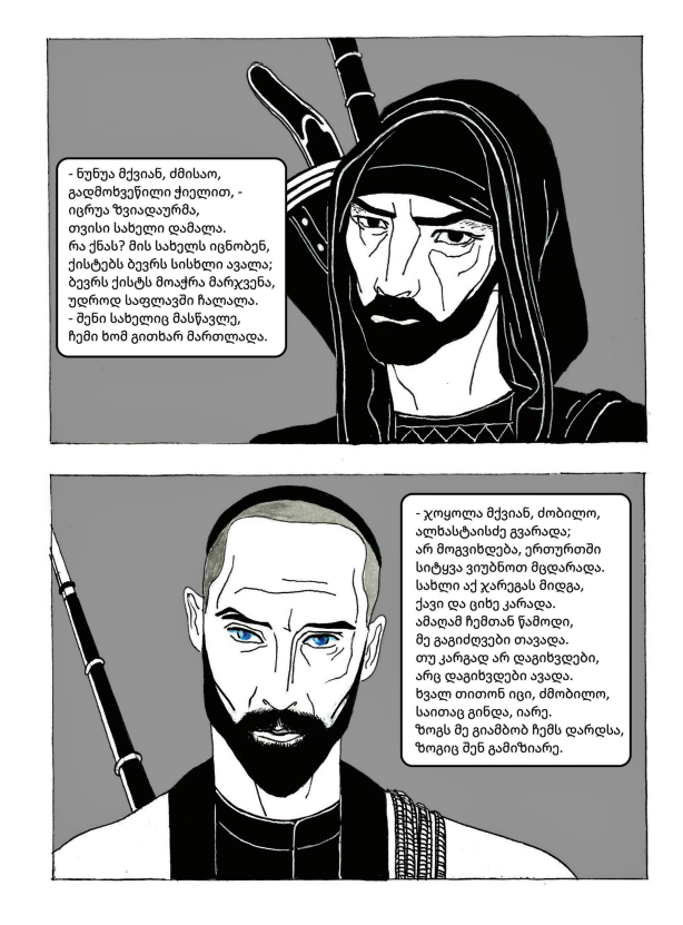 გამოგიტყდებით, რომ ძნელად დავთანხმდი. სამუშაოს მოცულობას როცა გადავხედე, მივხვდი, რომ ეს არ არის ადვილი ამოცანა. ვაჟა ისედაც არანაირად არაა ადვილი, და მისი ზედმიწევნით მანგას სტილში დასურათება ცოტა უცნაურად მეჩვენებოდა. ამიტომ, პირველ რიგში, დავიწყე ნაწარმოების ანალიზი, რათა მეგრძნო, თუ რამდენად მომეცემოდა ჩარევის საშუალება. მე თავიდანვე არ ვფიქრობდი, რომ ეს უნდა ყოფილიყო მხოლოდ ჩემი წარმოსახვით შესრულებული თავისუფალი ვერსია. დიდი სიფრთხილით მივიკვლევდი გზას, რაღაც განსაკუთრებული პასუხისმგებლობა დამეუფლა ვაჟას მიმართ. ჩემი თავი დავიჭირე იმაში, რომ უკვე შინაგანი დიალოგი მქონდა ავტორთან: აბა ვაჟას ეს თუ მოეწონება, ან აბა ვაჟა ამაში თუ დამეთანხმება-მეთქი. უცნაური მისტიკური ბმა მქონდა, ცოტა გავაფრინე მგონი)))) ვიტყვი, რომ ძალიან დიდი სიამოვნება მომანიჭა ამ პროცესმა და მუშაობის ახალი გამოცდილებაც მივიღე. ჩავუღრმავდი ისეთ რაღაცებს, რაც ადრე ყურადღების მიღმა მრჩებოდა. რაღაცებს ახლებურად მივხვდი, თავიდან გავიგე. ეს მოსამზადებელი სამუშაო ყველაზე მნიშვნელოვანი იყო. არ ვჩქარობდი, დიდი ხანი მოვანდომე სცენარის გაკეთებას და პერსონაჟების ძებნას. მათაც ველაპარაკებოდი))) ძალიან კონცენტრირებული ვიყავი. და ბოლოს მივხვდი, რომ სულ მთლად მანგას წესების დაცვით ვაჟა-ფშაველას არ გავაკეთებდი. ეს უფრო იქნებოდა წიგნის ილუსტრაციასა და მანგას შორის ერთგვარი შუალედური ვერსია.
