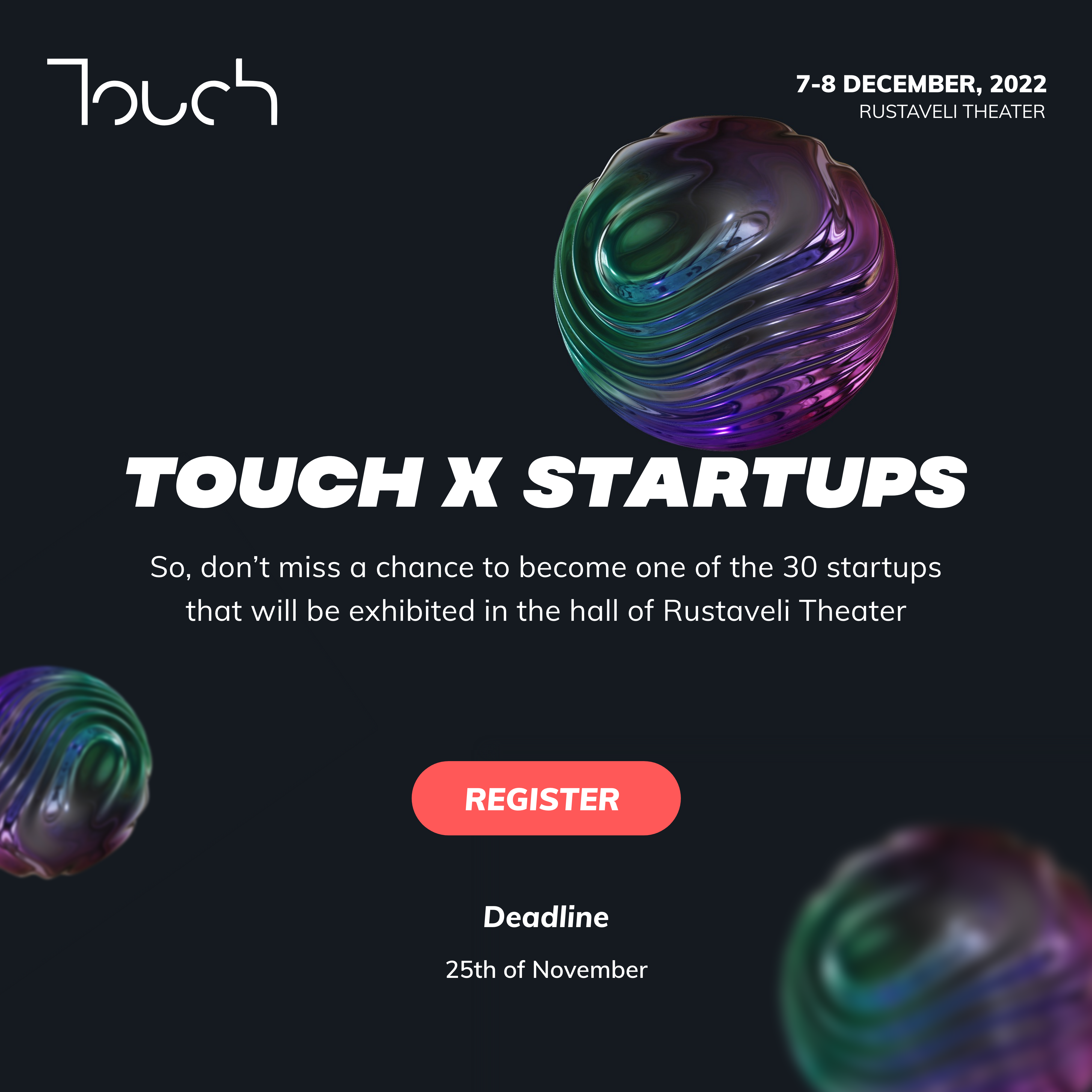 Touch22-ის ფარგლებში 7 და 8 დეკემბერს, ტექნოლოგიურ სტარტაპებს მიეცემათ შესაძლებლობა, რუსთაველის თეატრის კედლებში საკუთარი იდეები და მიღწევები გააცნონ მსოფლიოს სხვადასხვა ქვეყნებიდან ჩამოსულ დამსწრე საზოგადოებას, მოისმინონ მათი შეფასებები, დაამყარონ ახალი ბიზნეს-კონტაქტები და შესაძლოა შეიძინონ ინვესტირების ახალი შესაძლებლობებიც.