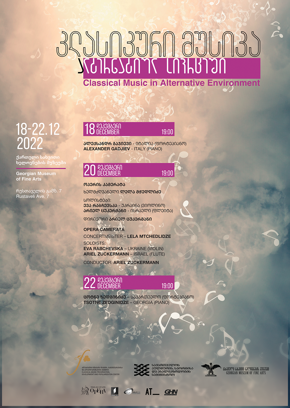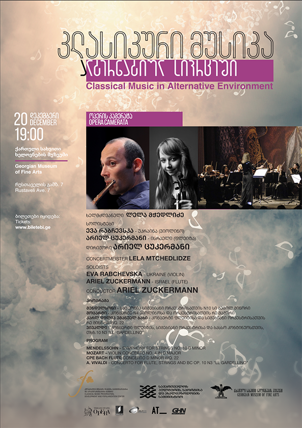 20 დეკემბერს მსმენელის წინაშე წარდგებიან კამერული ორკესტრი „ოპერის კამერატა“ (ხელმძღვანელი – ლელა მჭედლიძე), არიელ ცუკერმანის დირიჟორობით, და სოლისტები: ბრიუსელის დედოფალი ელისაბედის 2019 წლის საერთაშორისო კონკურსის ლაურეატი ევა რაბჩევსკა (ვიოლინო) და არიელ ცუკერმანი (ფლეიტა).