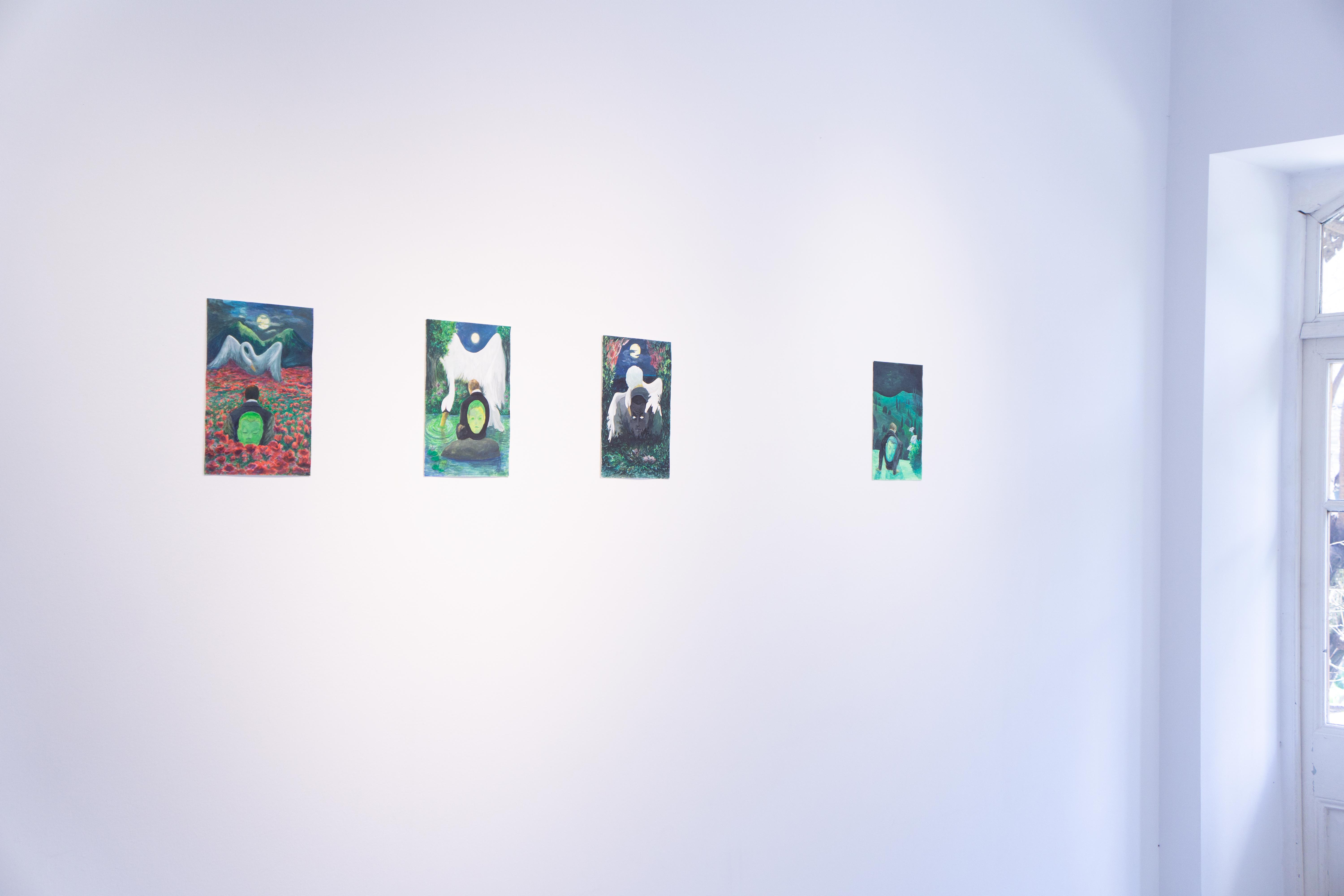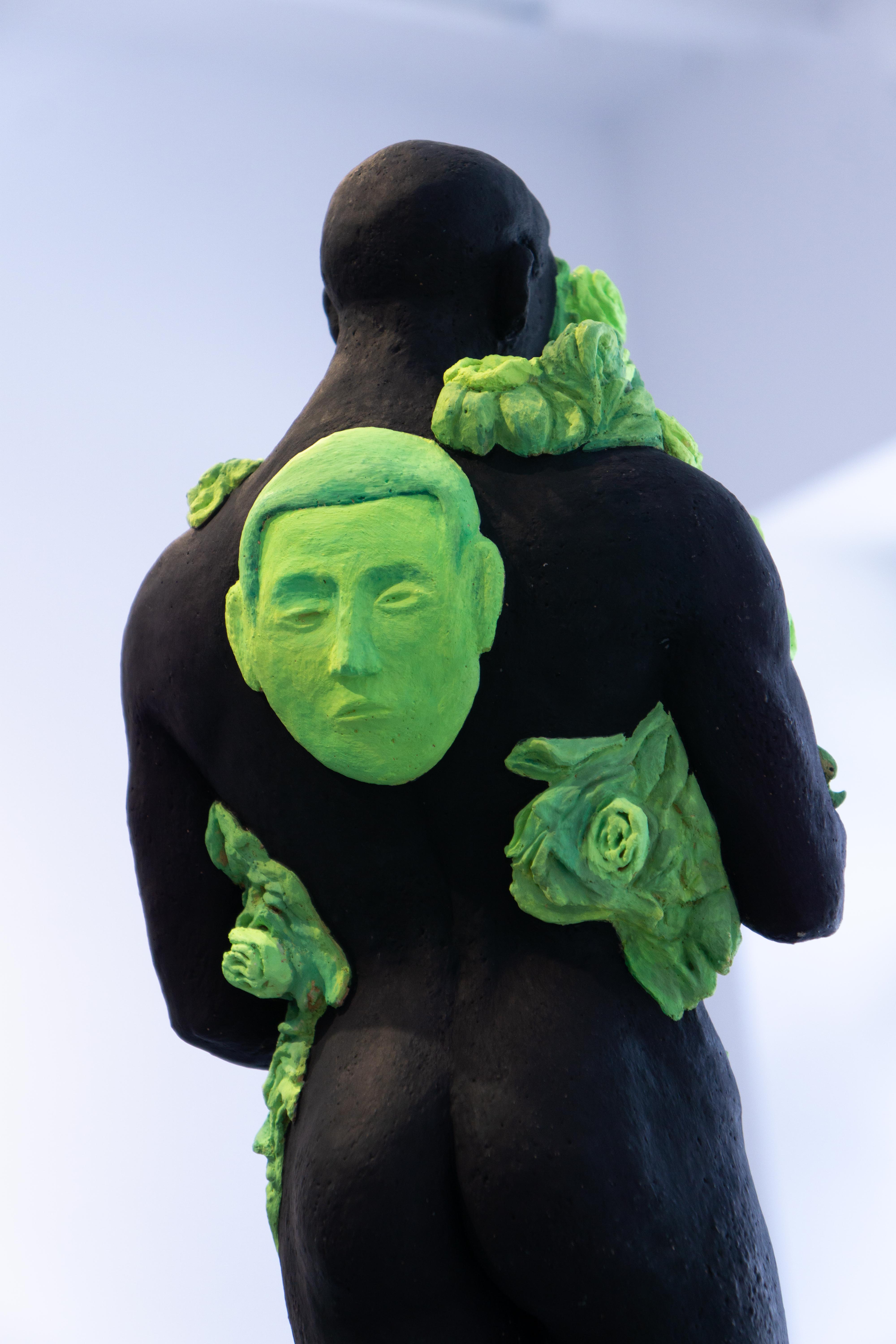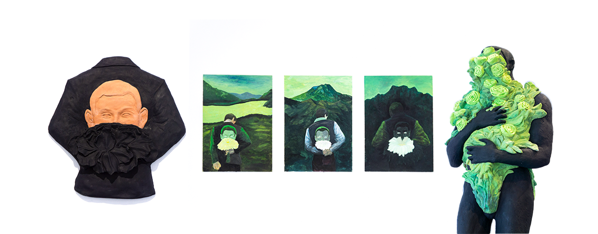 წარმოდგენილ ნამუშევრებში მნიშვნელოვანი ხაზია პორტრეტები, უზარმაზარი, უტრირებული სახეები, რომლებსაც ადამიანები ზურგით დაატარებენ, როგორც მეტაფორას, რაღაც მიღმიერის, დაფარულის და უხილავის, ამ შეგრძნებას კიდევ უფრო ამძაფრებს მწვანე ფერი, რომლის გარშემოც ყველაზე მძაფრად ვითარდება სიუჟეტი და კულმინაციას კერამიკის ფიგურებში აღწევს.
