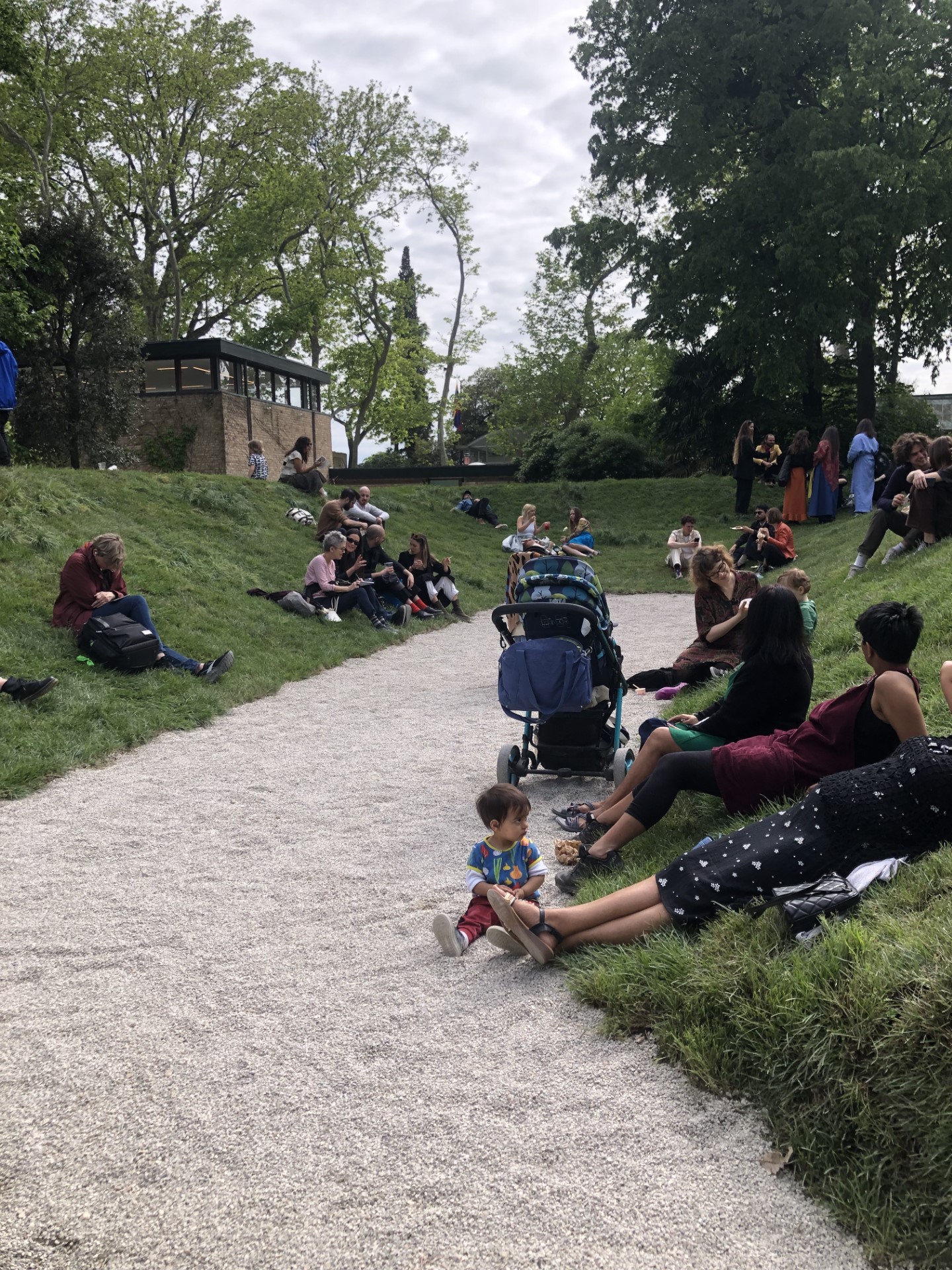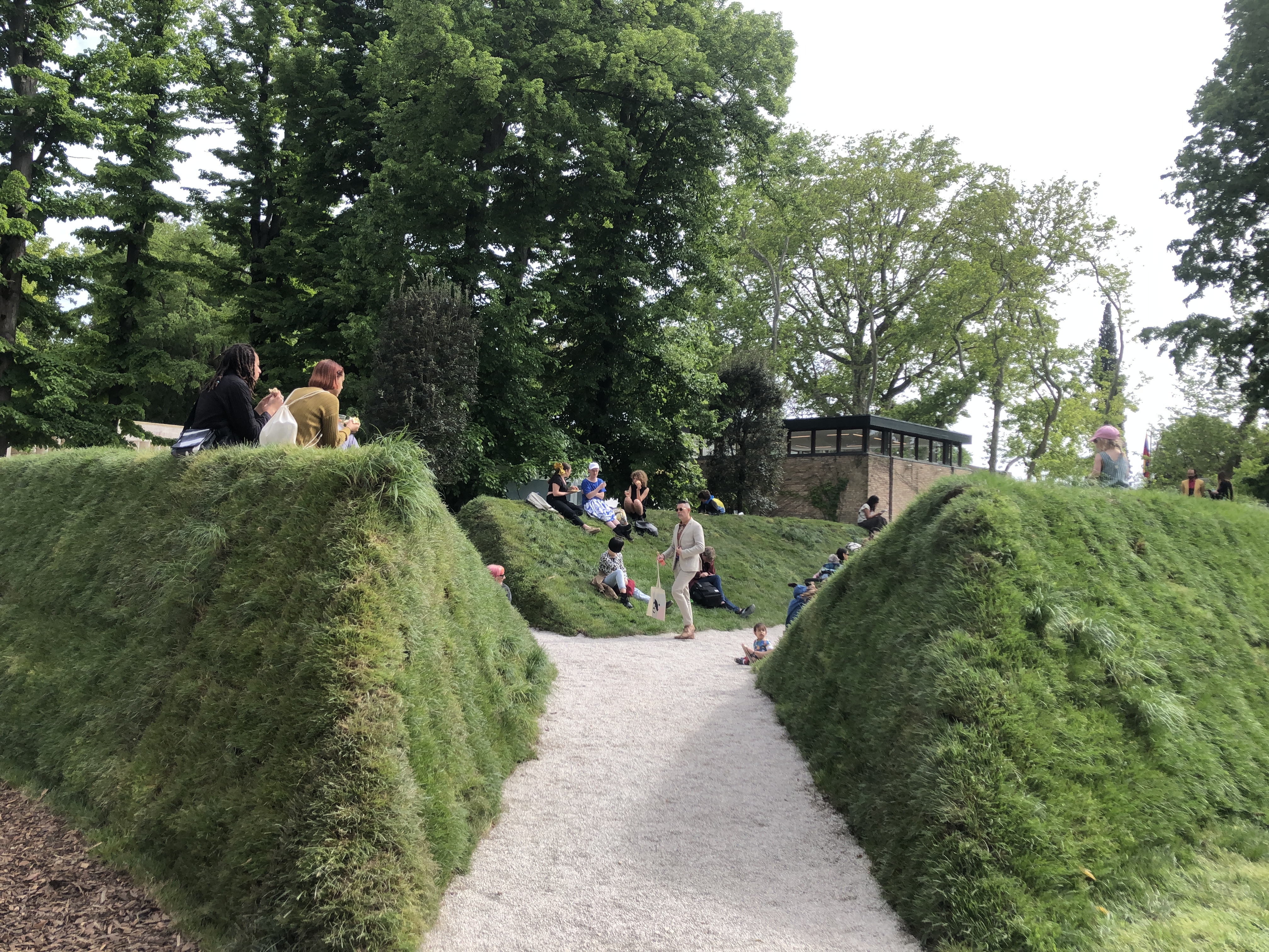 სანგრებს მაგონებს ეს მიწაყრილები. მე ვერ წამოვწექი, მაგრამ მათთვის, ვინც ჩვენსავით ომში არ არის, ერთ-ერთი სასიამოვნო ადგილია ბიენალეზე. გაზონებზე სულ ხალხია – ზოგი ბავშვებით, ზოგი ძაღლებით… ისვენებენ, ლაპარაკობენ, მიწასთან ურთიერთობენ. საკვებიც აქ მოაქვთ და, როგორც პარკში, პატარა პიკნიკს აწყობენ. ბაღია ბაღში. თავად ჟარდინიც ხომ ბაღებს ნიშნავს. ბონაპარტმა გააშენა კუნძულის აღმოსავლეთ ნაწილში მე-19 საუკუნეში. 1895 წლიდან კი ბიენალეს ჩატარების ტრადიციულ ადგილად იქცა. რამდენიმე დაგეგმილი პროექტიდან ერთ-ერთი სწორედ ბუნებაზე იქნება, სახელწოდებით 30% – რუსეთის შეჭრის შედეგად განადგურებულ ადგილებზე, რომელიც ქვეყნის მესამედს შეადგენს!
