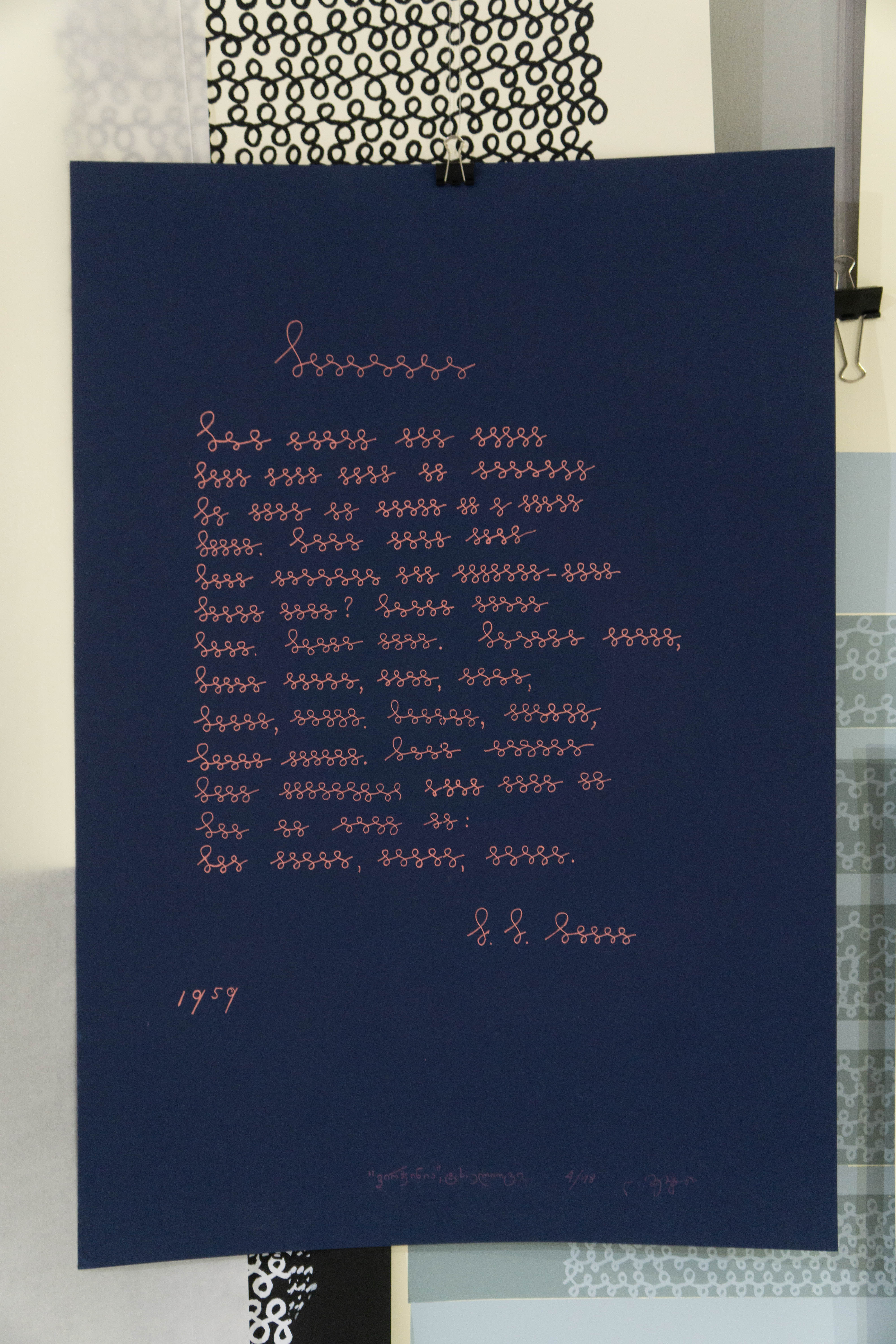 ასე გამოდის, რომ არტისტი ამ ინსტალაციაზე მთელი ცხოვრება მუშაობდა და ბავშვობაში შეუცნობლად უჯრედებიან რვეულში გამოგონებული „უნივერსალური დამწერლობა“ მოგვიანებით ტილოზე, ქაღალდზე, სერიგრაფიებსა თუ თექაზე ექსპერიმენტებში ტრანსფორმირდა…