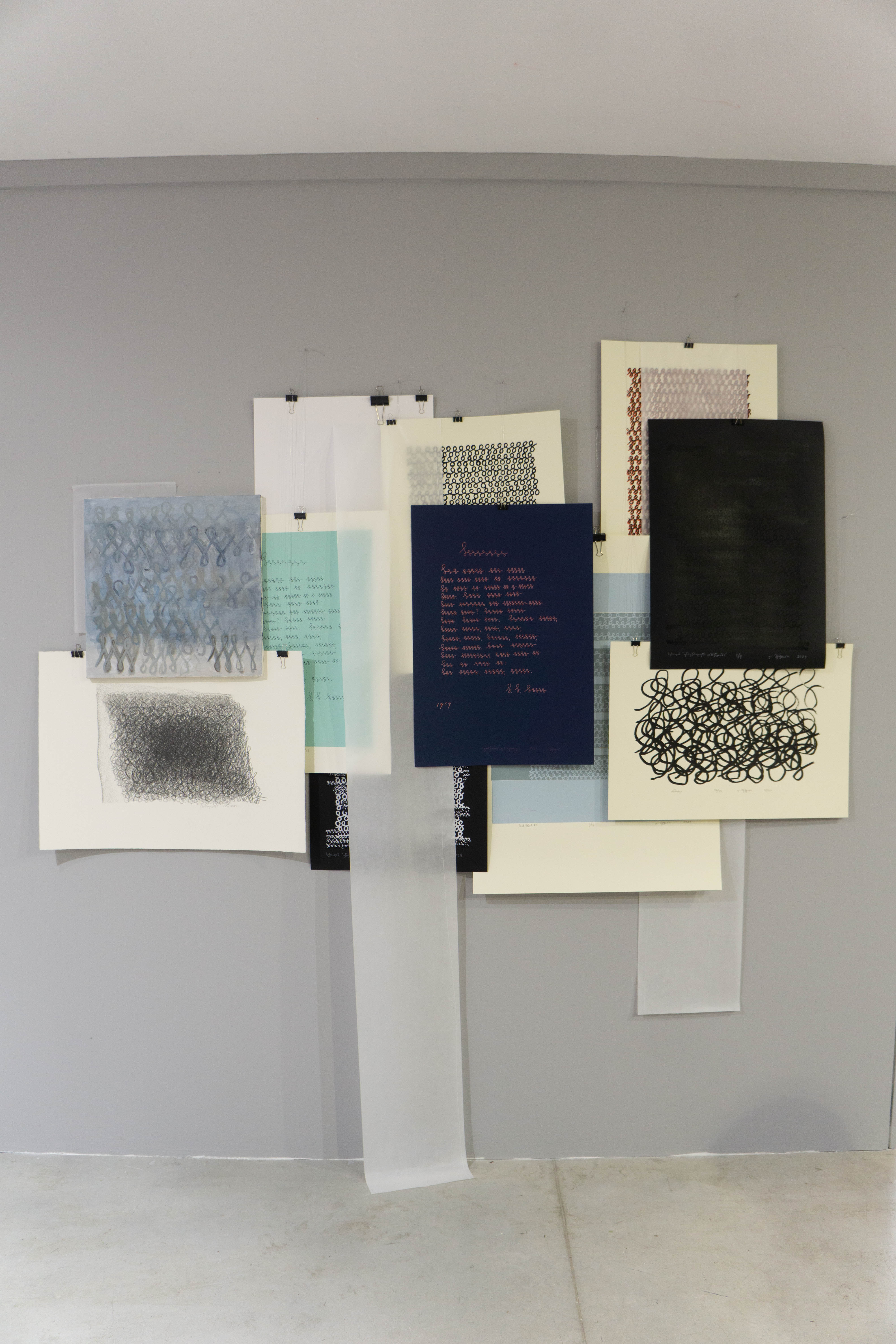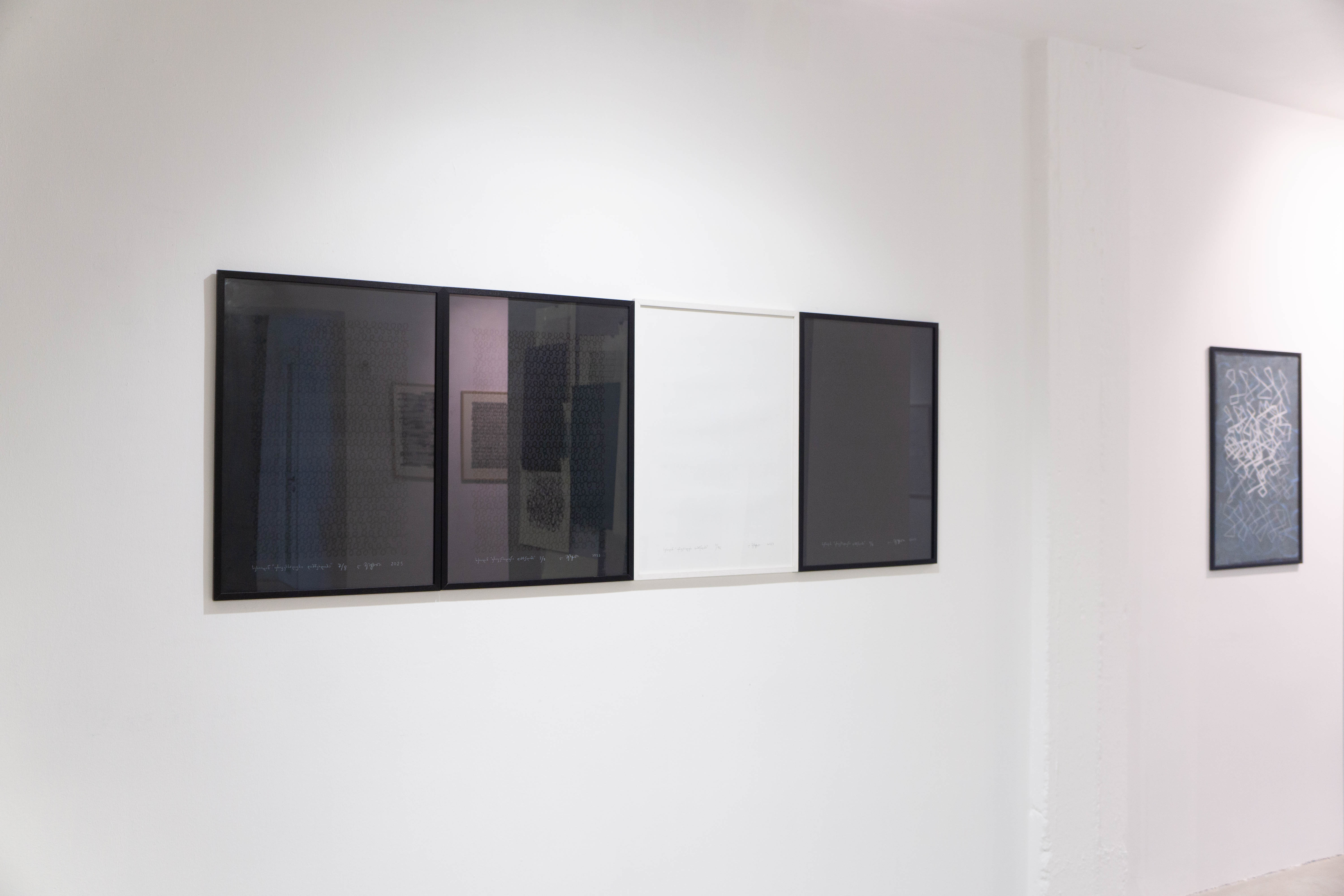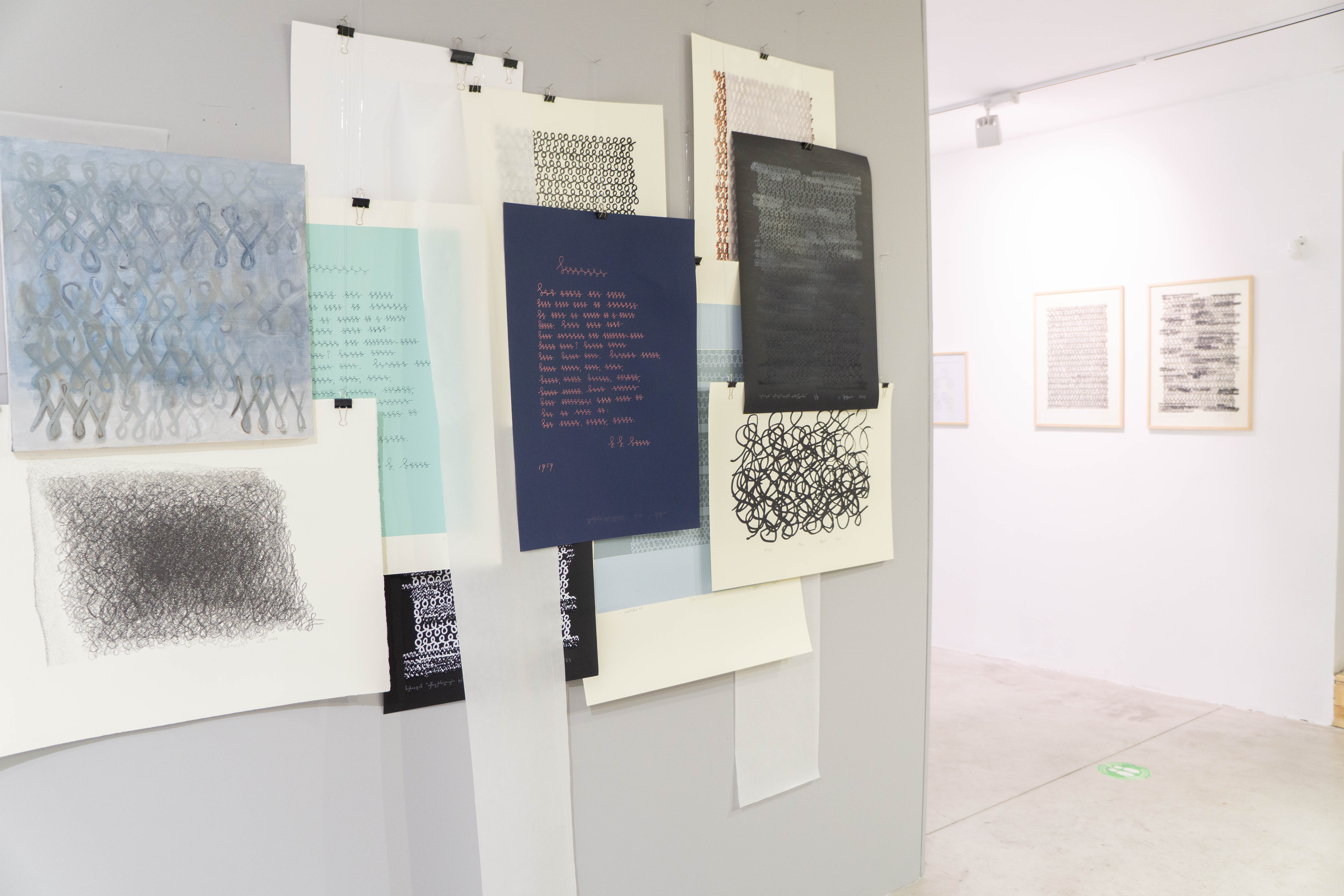 ეს მინიშნება გრაფემას რიტუალური განმეორებების ქაღალდზე თუ ტილოზე პალიმფსესტური პრინციპით გადატანაშიც ამოიკითხება და თოვლივით თეთრ ქათქათა გრაფემებიან სახიან ნაბადებს შორის დაკიდებული გამჭვირვალე პერგამენტებშიც, რომლებიც იმავდროულად მხტვრების ფაქიზად შენახულ პორტფოლიოსაც მოგვაგონებს.