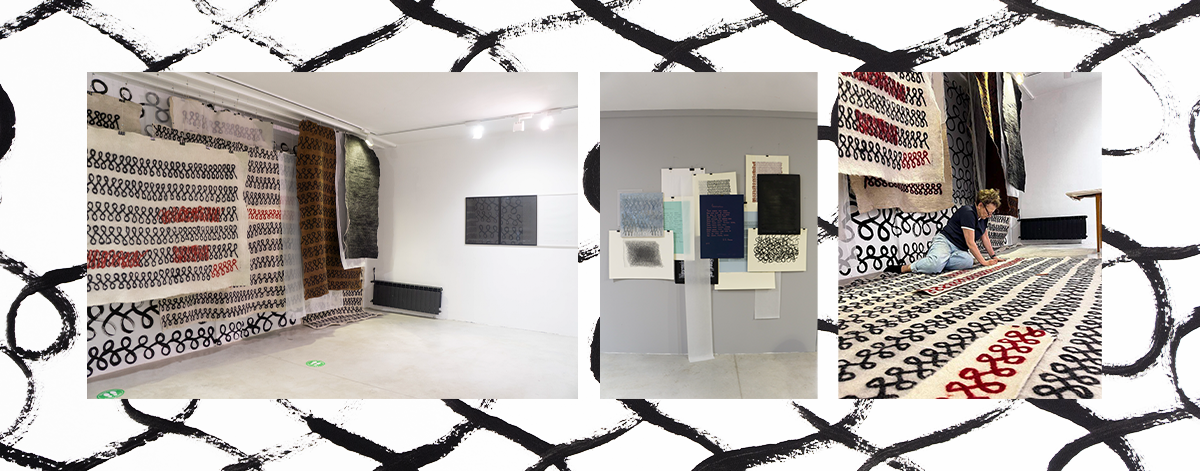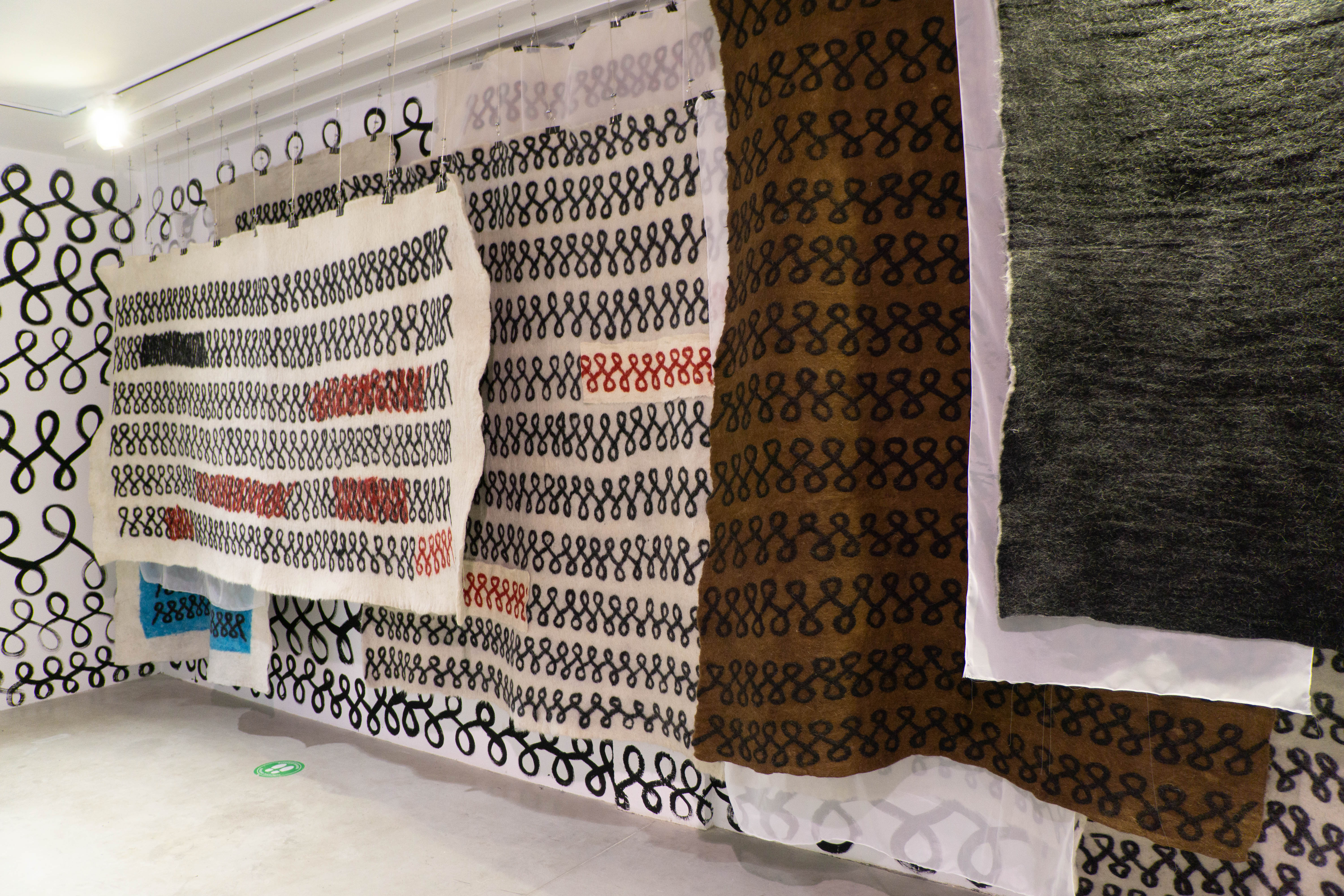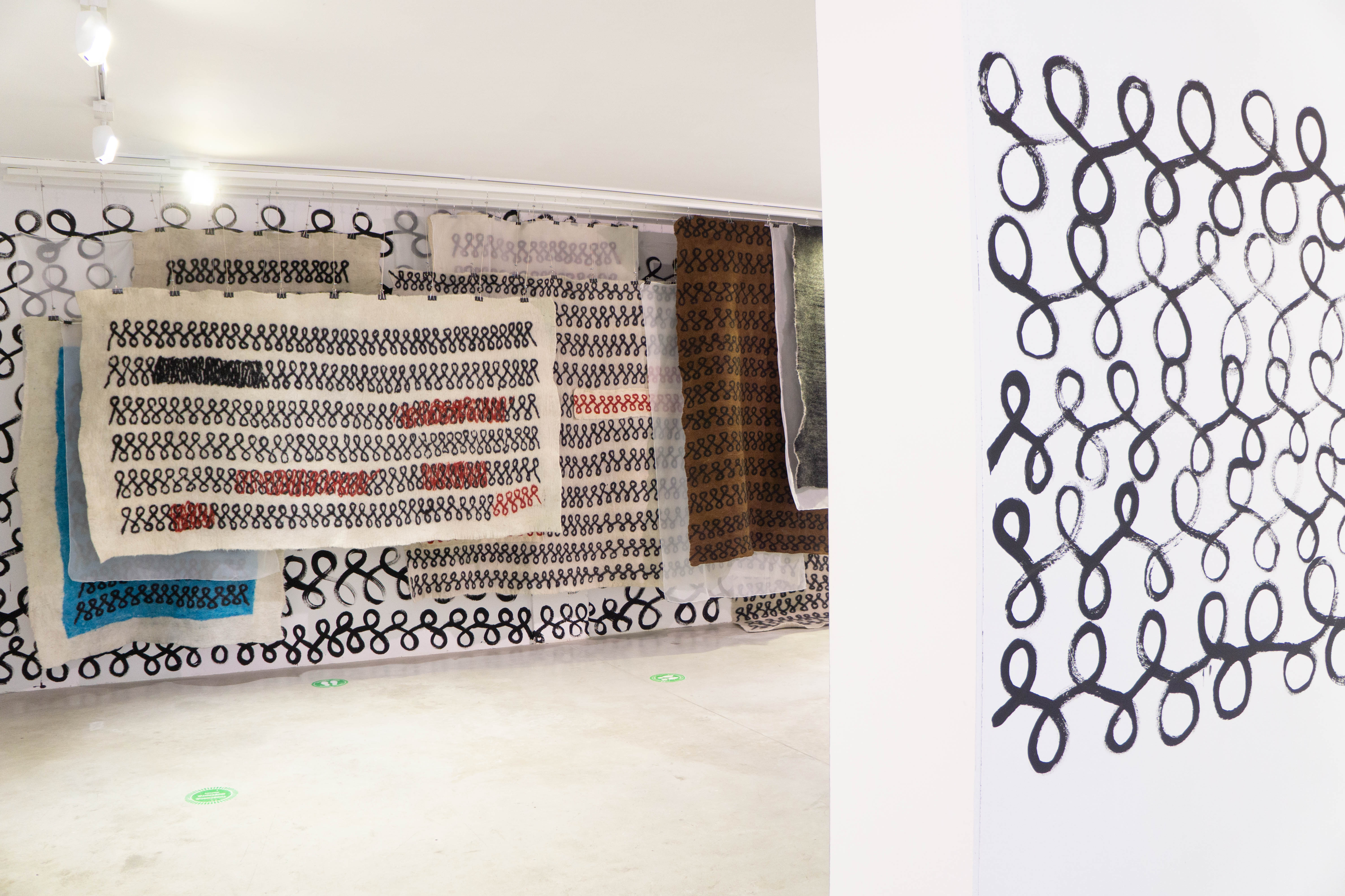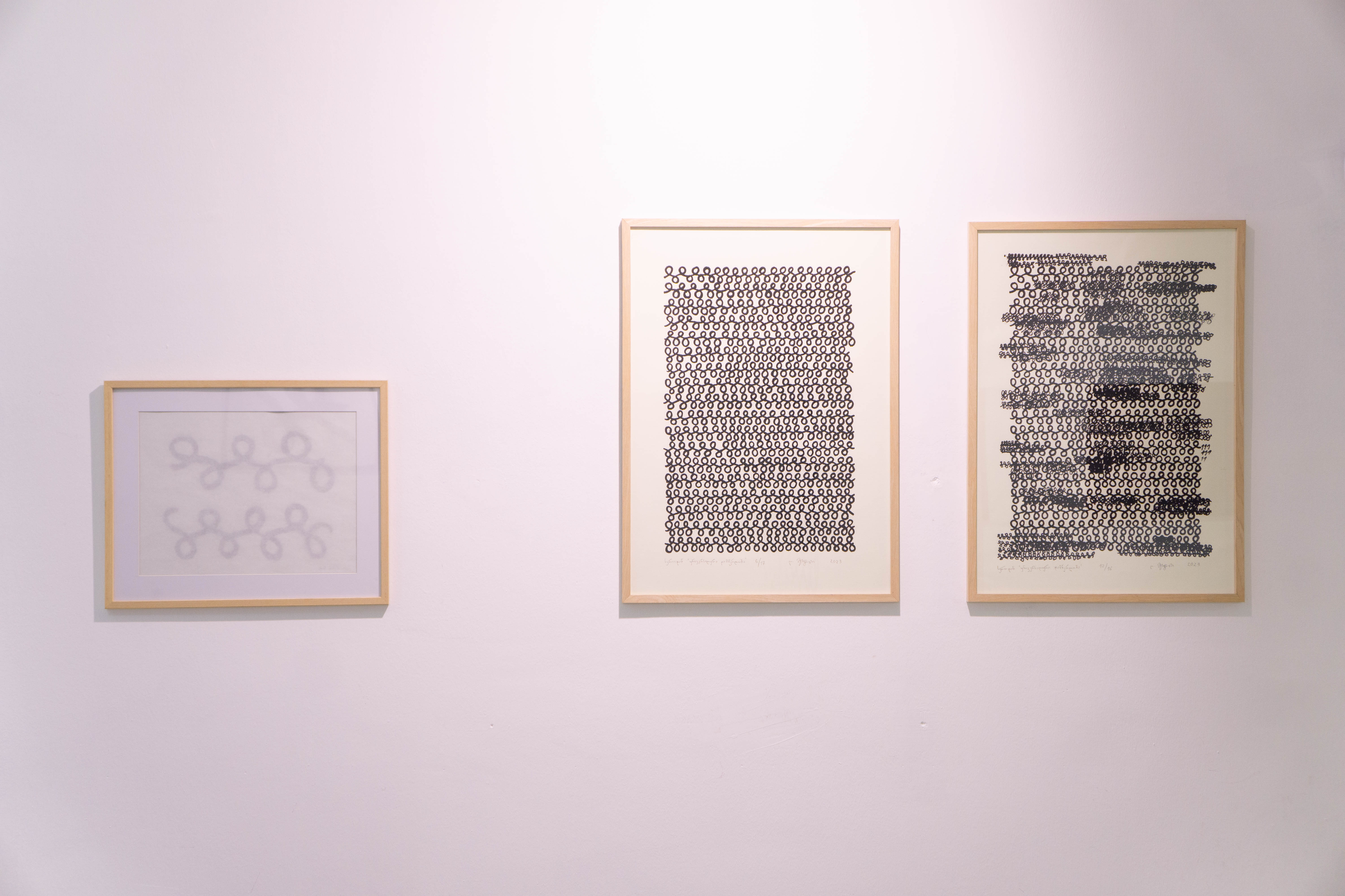 ეს მინიშნება გრაფემას რიტუალური განმეორებების ქაღალდზე თუ ტილოზე პალიმფსესტური პრინციპით გადატანაშიც ამოიკითხება და თოვლივით თეთრ ქათქათა გრაფემებიან სახიან ნაბადებს შორის დაკიდებული გამჭვირვალე პერგამენტებშიც, რომლებიც იმავდროულად მხტვრების ფაქიზად შენახულ პორტფოლიოსაც მოგვაგონებს.