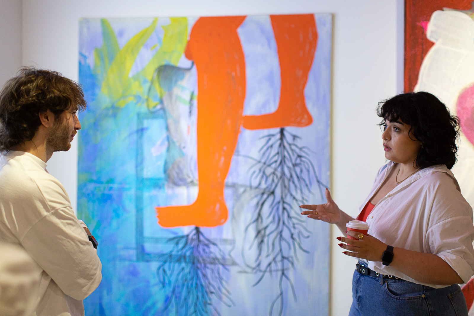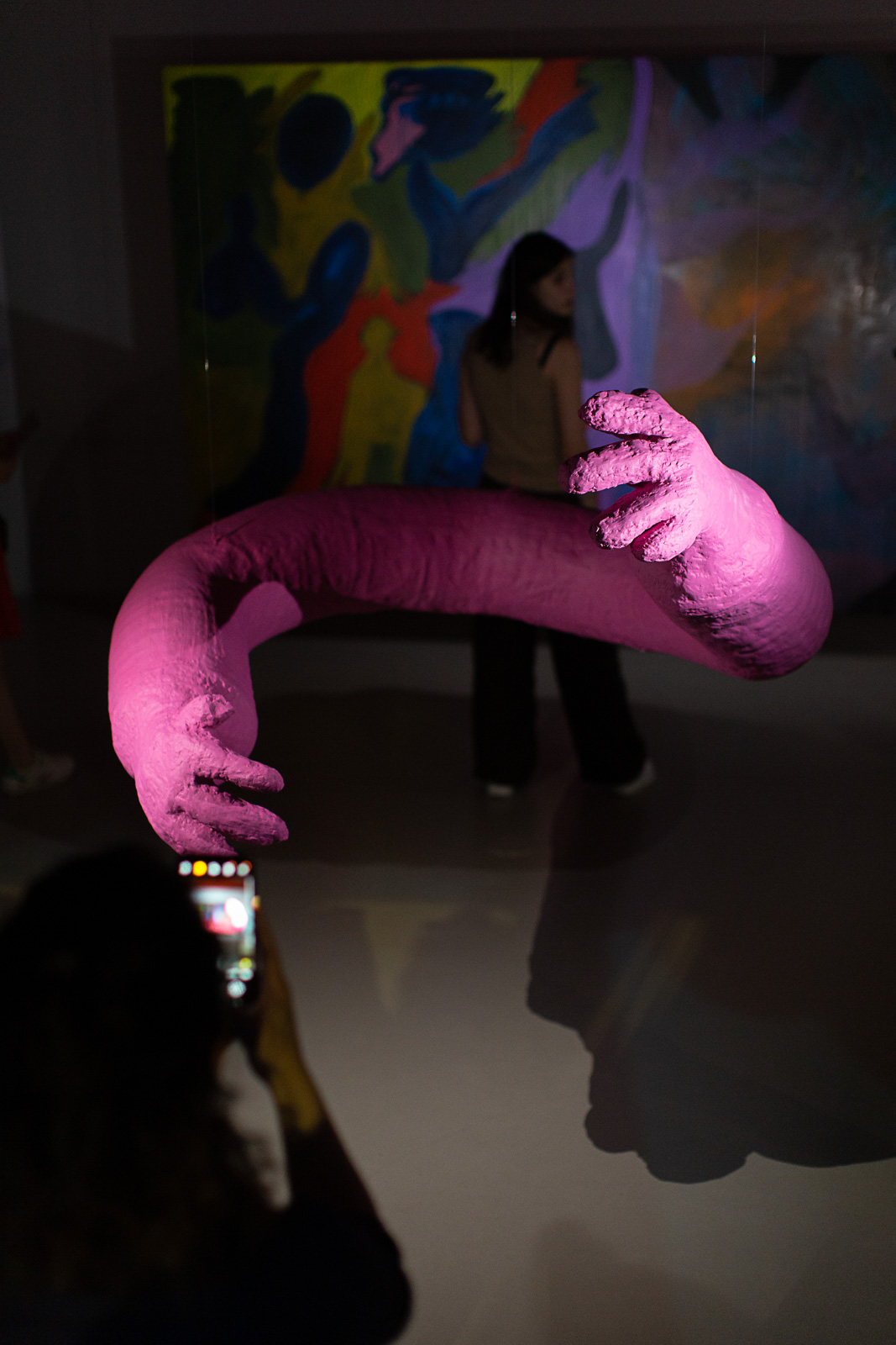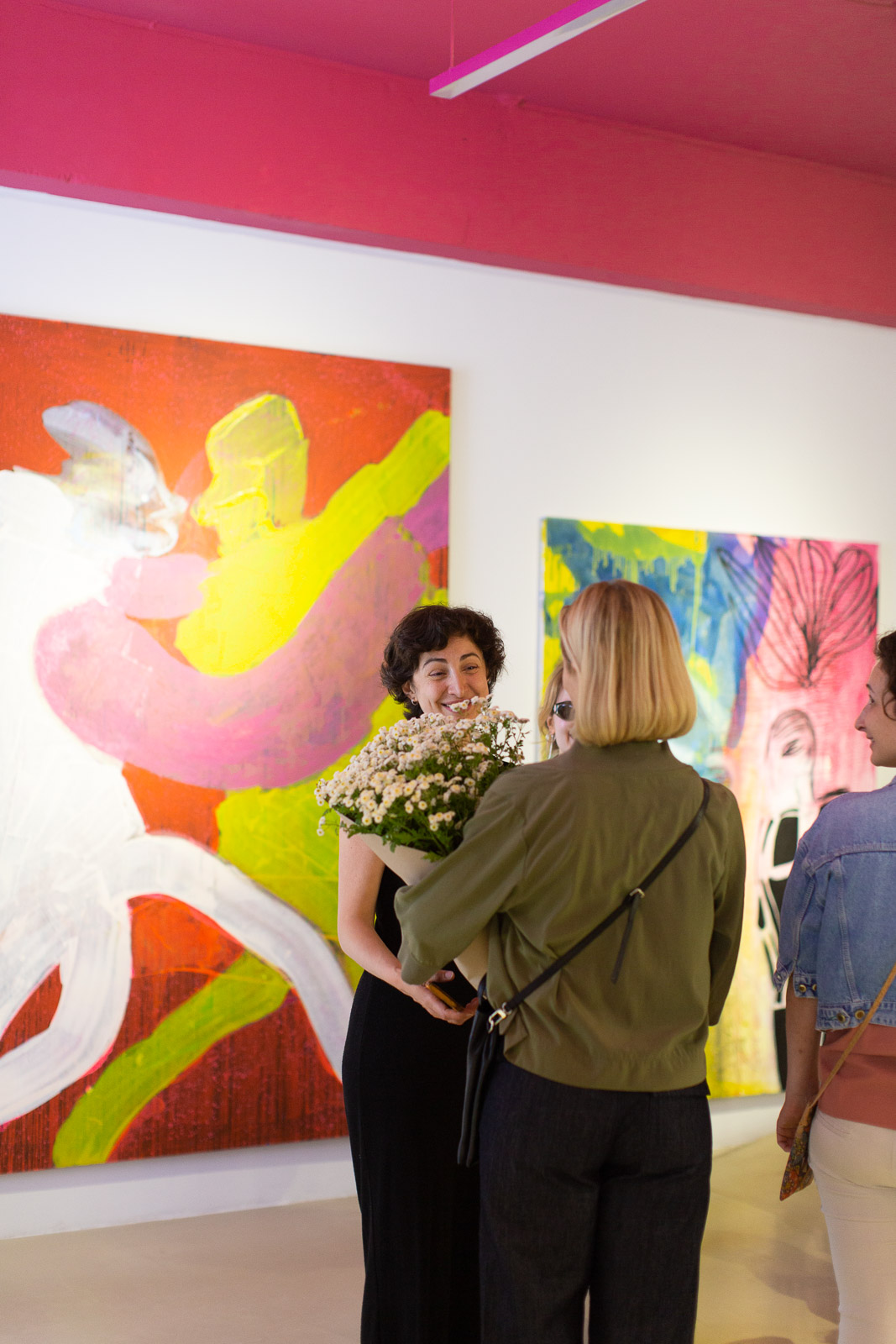 სკულპტურას გარს აკრავს ზეთის საღებავებით შესრულებული ნახატები, ნაწილობრივ აბსტრაქტული ადამიანის ფიგურებით. უფრო ადრინდელი ნახატი, 2017 წლის, „მე შენ ჩაგიკრავ“ ასახავს ორ ფიგურას, რომლებიც ერთმანეთს ეკვრიან.