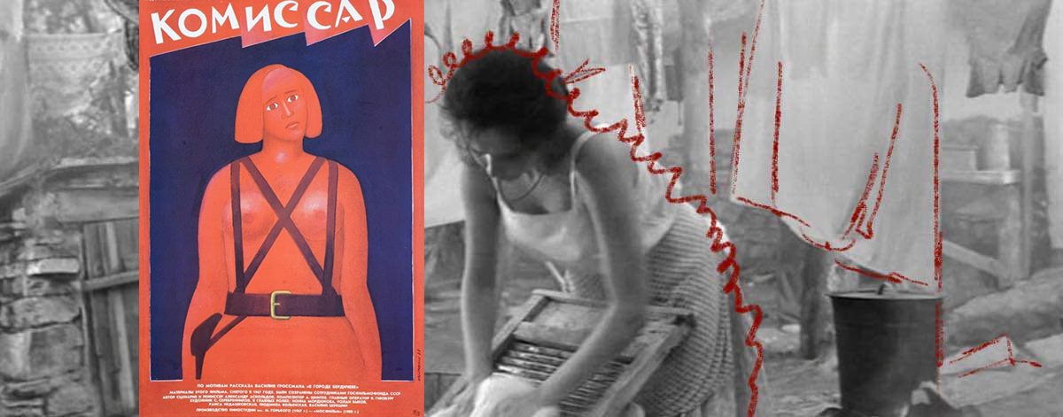 1967 წელს საბჭოთა ეკრანებზე უნდა გამოსულიყო ფილმი „კომისარი“ ნონა მორდიუკოვათი და როლან ბიკოვით მთავარ როლებში. პირველწყარო – ვასილი გროსმანის მოთხრობა „ქალაქ ბერდიჩივში“. ფილმი სამოქალაქო ომზეა, მაგრამ მის მეორად ეფექტზე, რომელიც სინამდვილეში პირველადია. მთავარი მოქმედება არ მიმდინარეობს ოფისში, სანგრებში ან ფრონტის ხაზზე (მსგავსი სცენები ფილმში გვხვდება), არამედ ერთ პატარა ხის სახლში, რომელშიც ცხოვრობს ებრაული ოჯახი, ცოლ-ქმარი შვიდ ბავშვთან ერთად. ამ სახლში ოჯახის ნების საწინააღმდეგოდ ოთახს გამოუყოფენ ფეხმძიმე სამხედრო კომისარს.