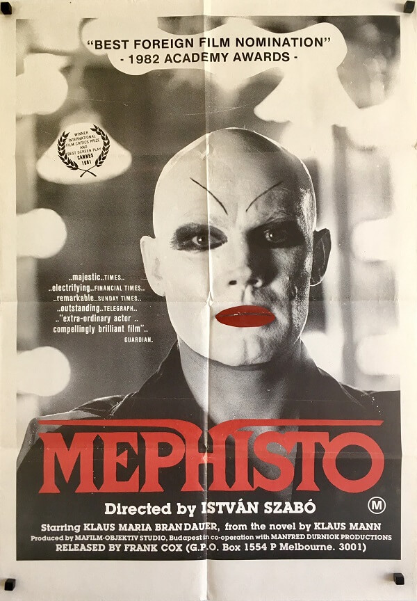 1981 წელს გამოვიდა უნგრელი რეჟისორის, იშტვან საბოს ფილმი „მეფისტო“. „მეფისტო“ არის გერმანელი მწერლის, კლაუს მანის იმავე სახელწოდების მქონე რომანის ეკრანიზაცია. ფილმი გვიყვება ჰამბურგის პატარა თეატრის მსახიობის ისტორიას, რომელსაც ამოძრავებს რევოლუციური იდეები და ამ იდეების ხელოვნების საშუალებით დიდი სცენაზე რეალიზების წყურვილი. მისი ამბოხებული ხასიათი უმალ ჩაცხრება, როცა ის აღმოჩნდება პაიკი ნაცისტური მთავრობის ხელში.