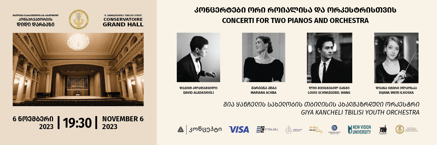 6 ნოემბერს, თიბისი კონცეპტის და Visa-ს მხარდაჭერით, თბილისის სახელმწიფო კონსერვატორიაში „კონცერტები ორი როიალისა და ორკესტრისთვის“ დათუნა ალადაშვილისა და მარიანა აჩბას მონაწილეობით გაიმართება. არტისტები გია ყანჩელის სახელობის თბილისის ახალგაზრდულ ორკესტრთან და სპეციალურად მოწვეულ სტუმართან, ლუი შვეცბეგელ ვანგთან ერთად, მოცარტისა და პულენკის ნაწარმოებებს შეასრულებენ.