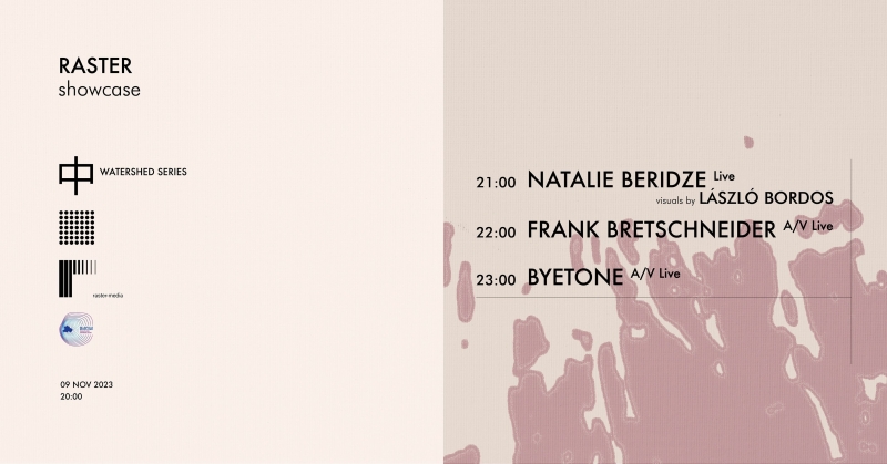 Watershed 9 ნოემბერს მასპინძლობს RASTERMEDIA შოუქეისს – 1996 წელს დაარსებულ ექსპერიმენტალური ელექტრონული მუსიკის ლეიბლსა და ვიზუალური ხელოვნების პლატფორმას, რომელიც 50-მდე არტისტს აერთიანებს. RASTERMEDIA აუდიო-ვიზუალური ხელოვნების ერთ-ერთი ყველაზე ცნობილი და პატივსაცემი პლატფორმაა.